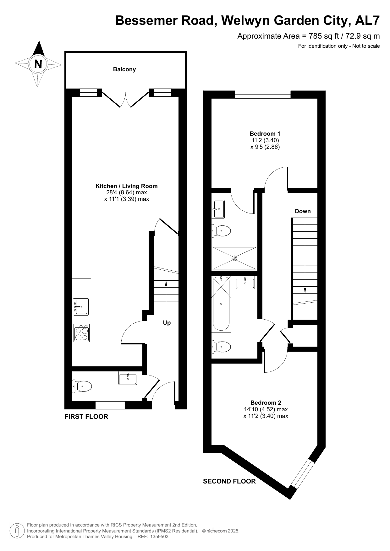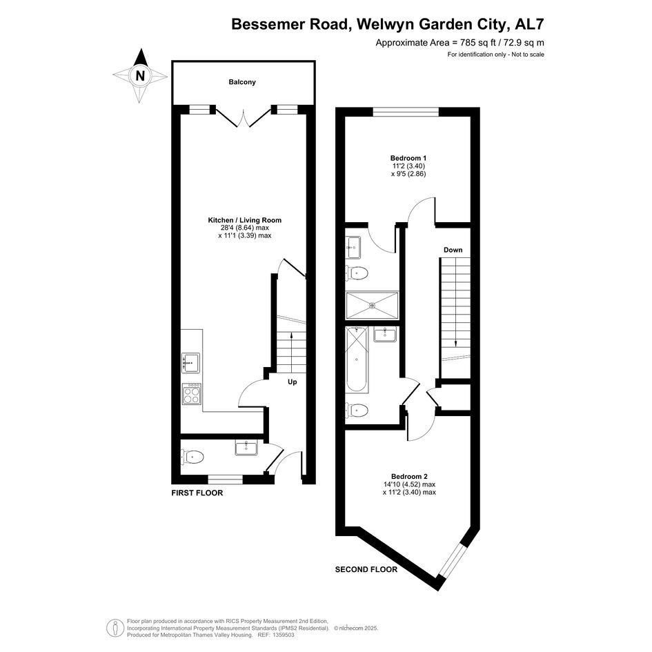 The property is spread across two floors and features an entrance hall, an open-plan living room and kitchen, and a toilet on the first floor. On the second floor, there are two bedrooms and two bathrooms.