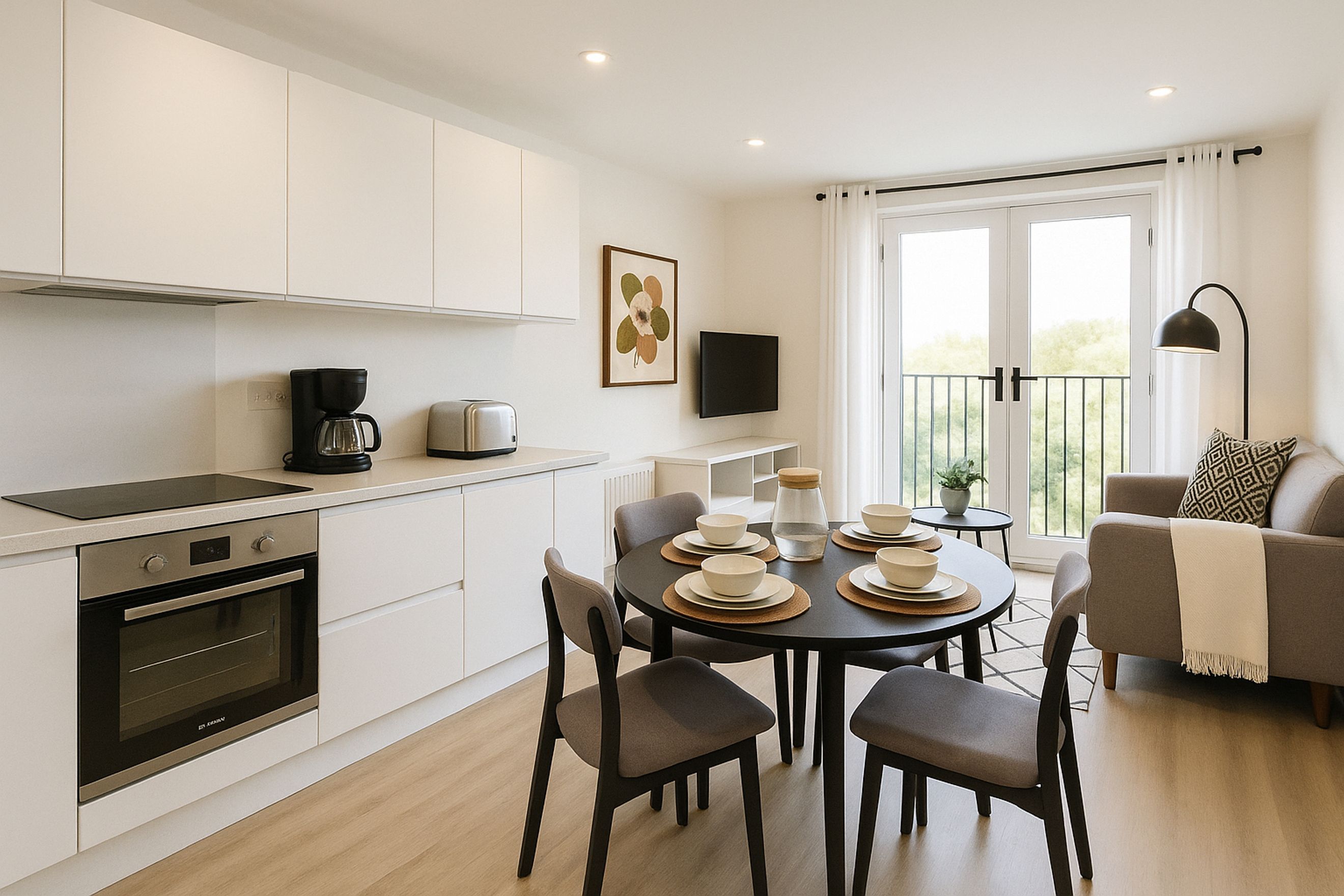 This one-bedroom apartment includes a bright, open-plan kitchen and living area with an L-shaped kitchen and a Juliet balcony that brings in natural light.