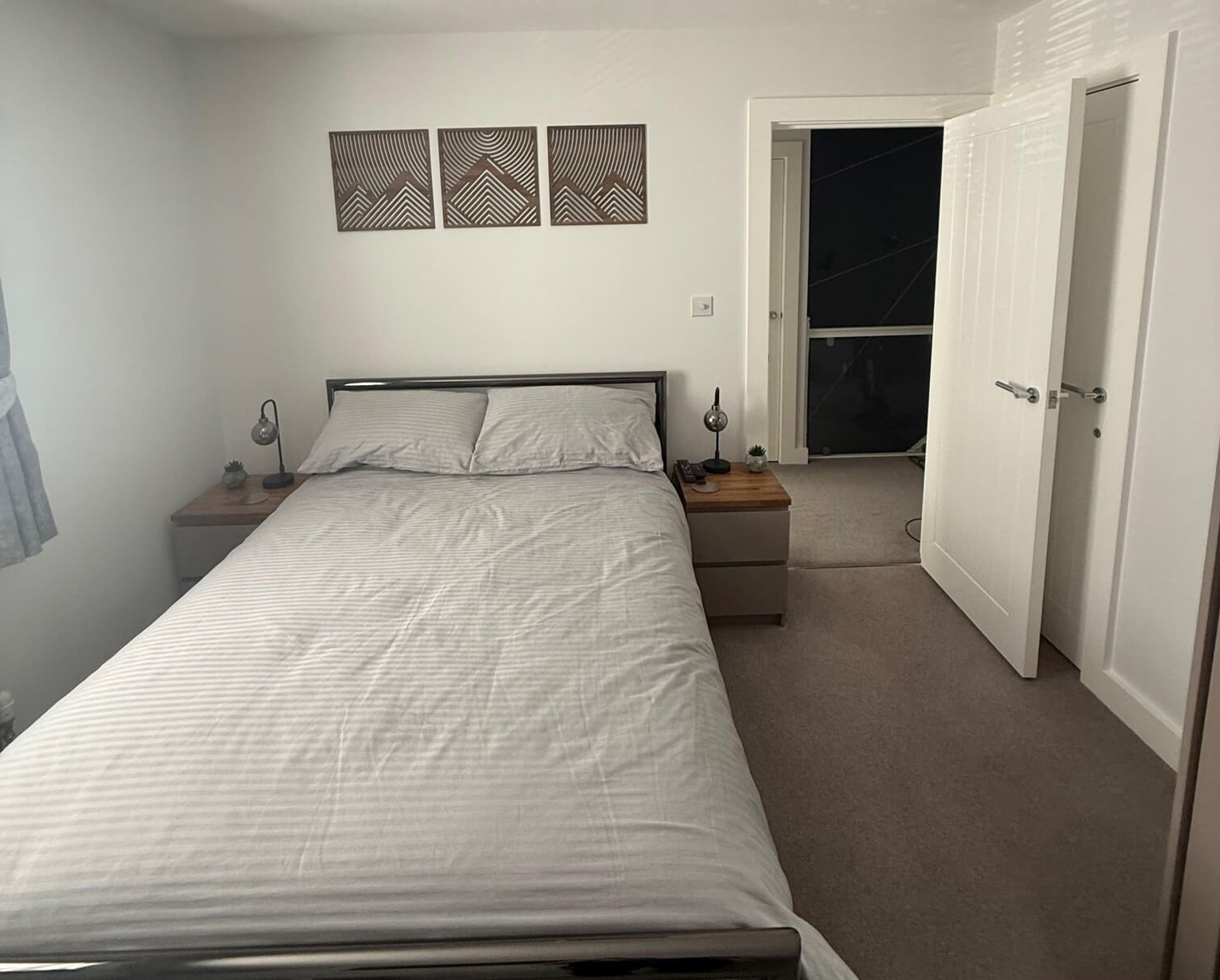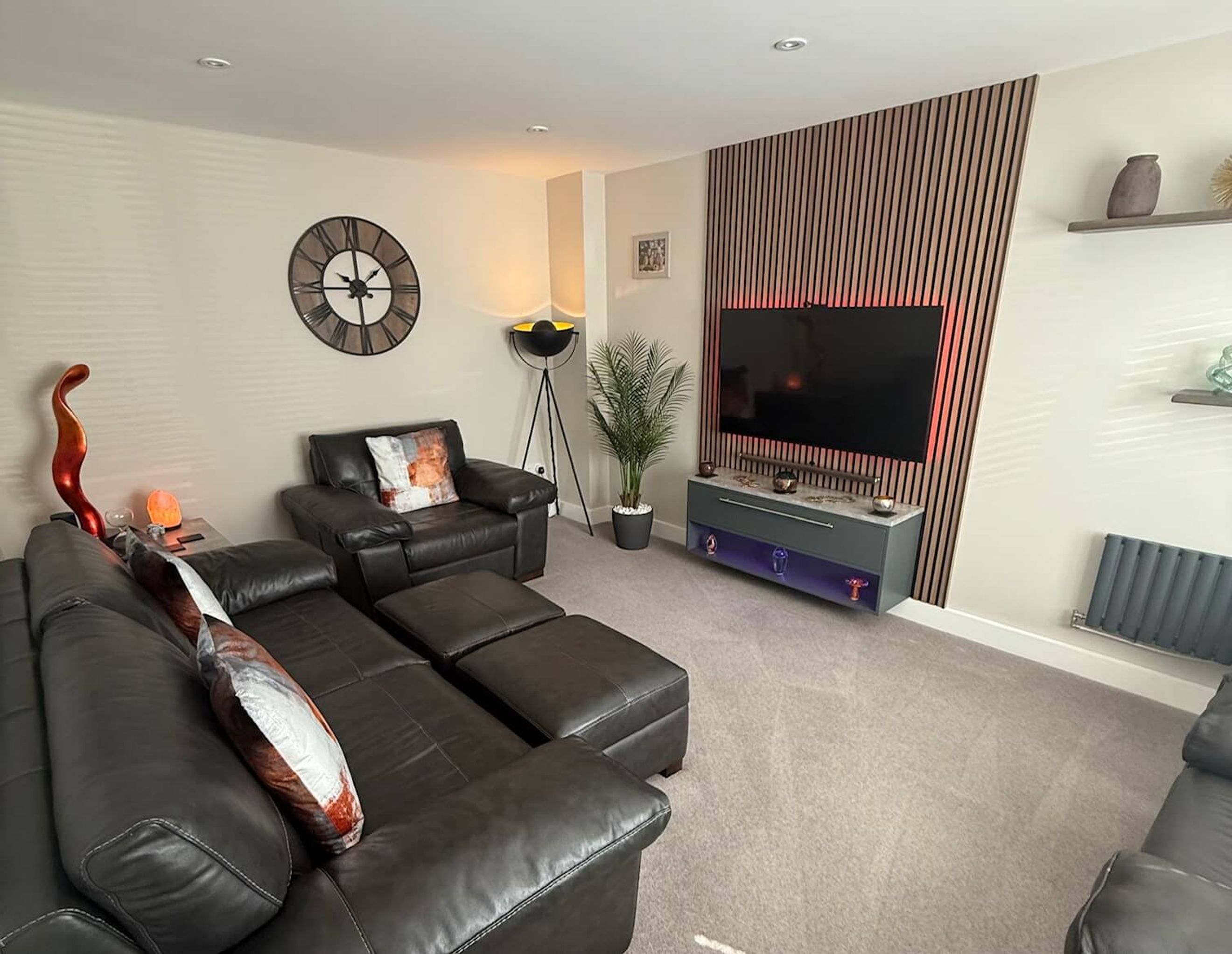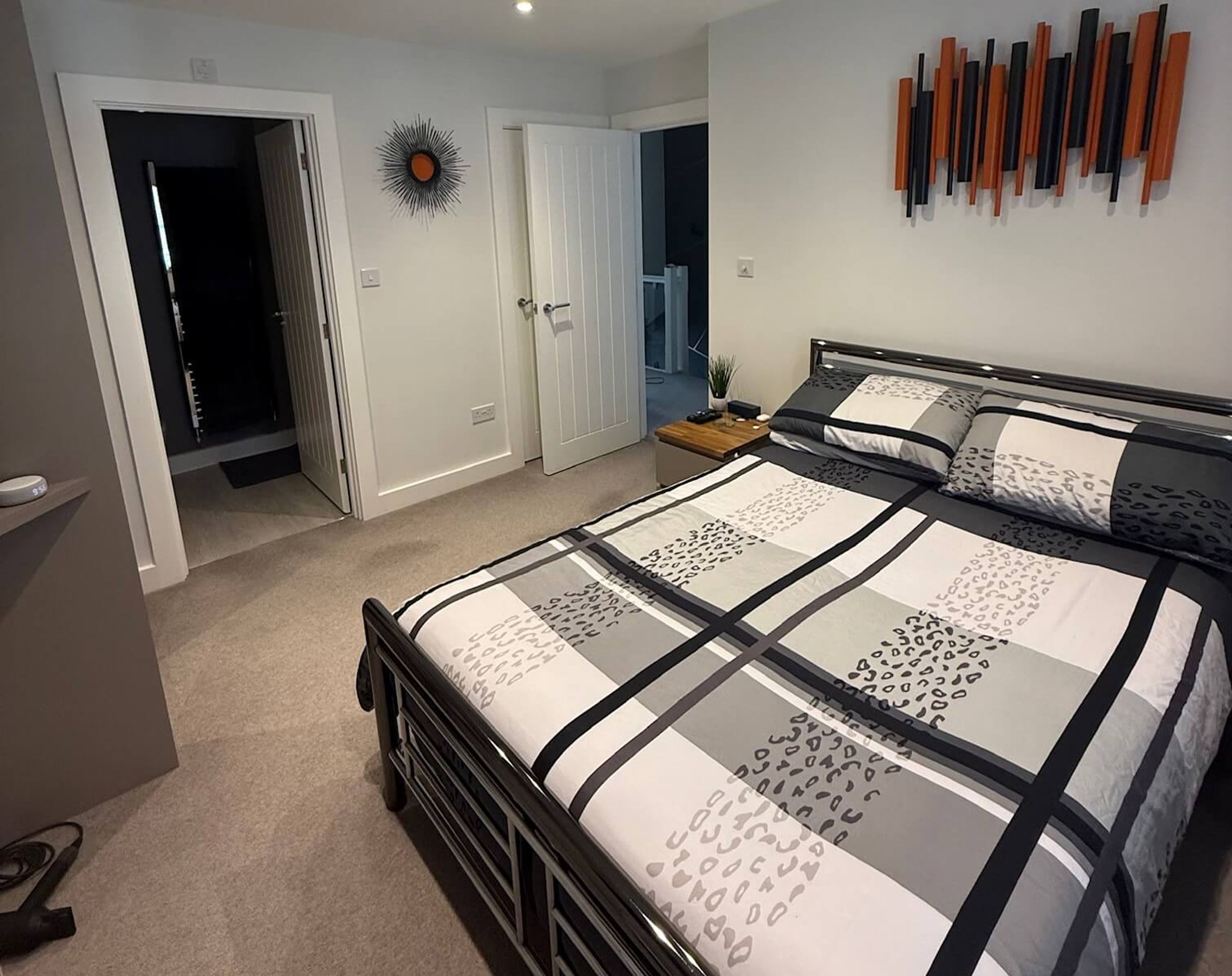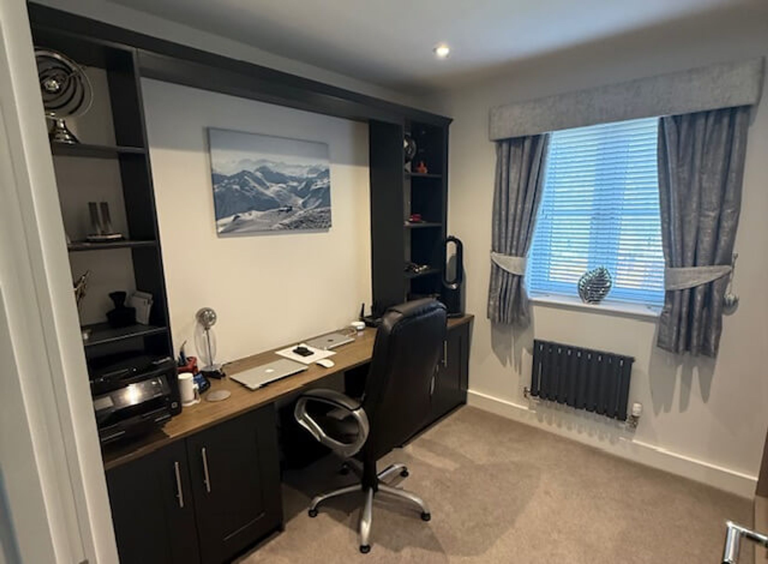 Upstairs, the home continues to impress with a large family bathroom featuring a shower over the bath. The main bedroom includes fitted wardrobes and a stylish en-suite with a walk-in shower. The second double bedroom also has fitted wardrobes and both main bedrooms offer additional lit storage cupboards. A third good-sized bedroom with fitted wardrobes completes the upstairs. Outside, a large landscaped rear garden with a side patio area, two powered sheds, and a summerhouse offers privacy and plenty of space. A driveway for two vehicles and visitor parking add to the appeal of this well-appointed family home.