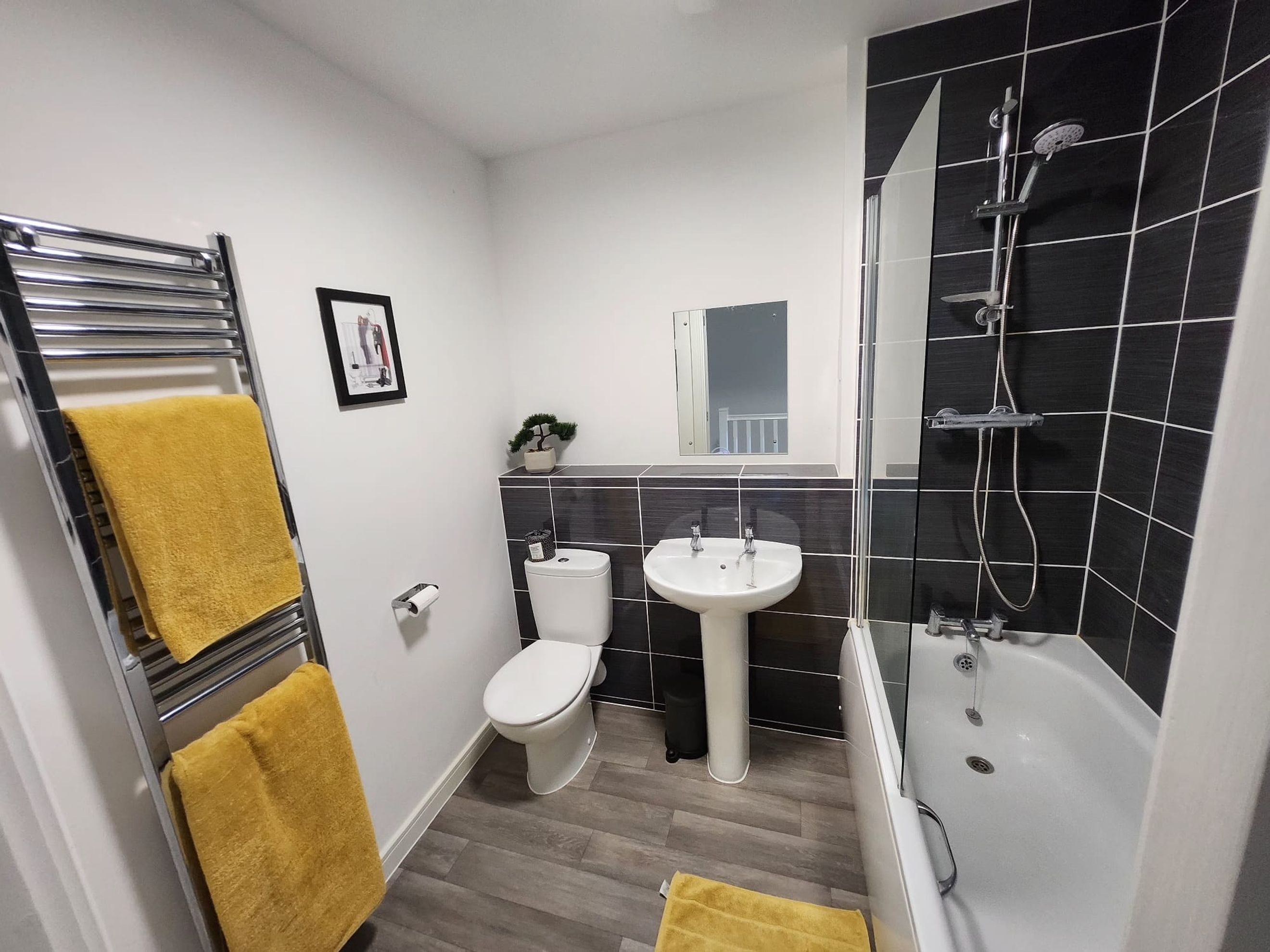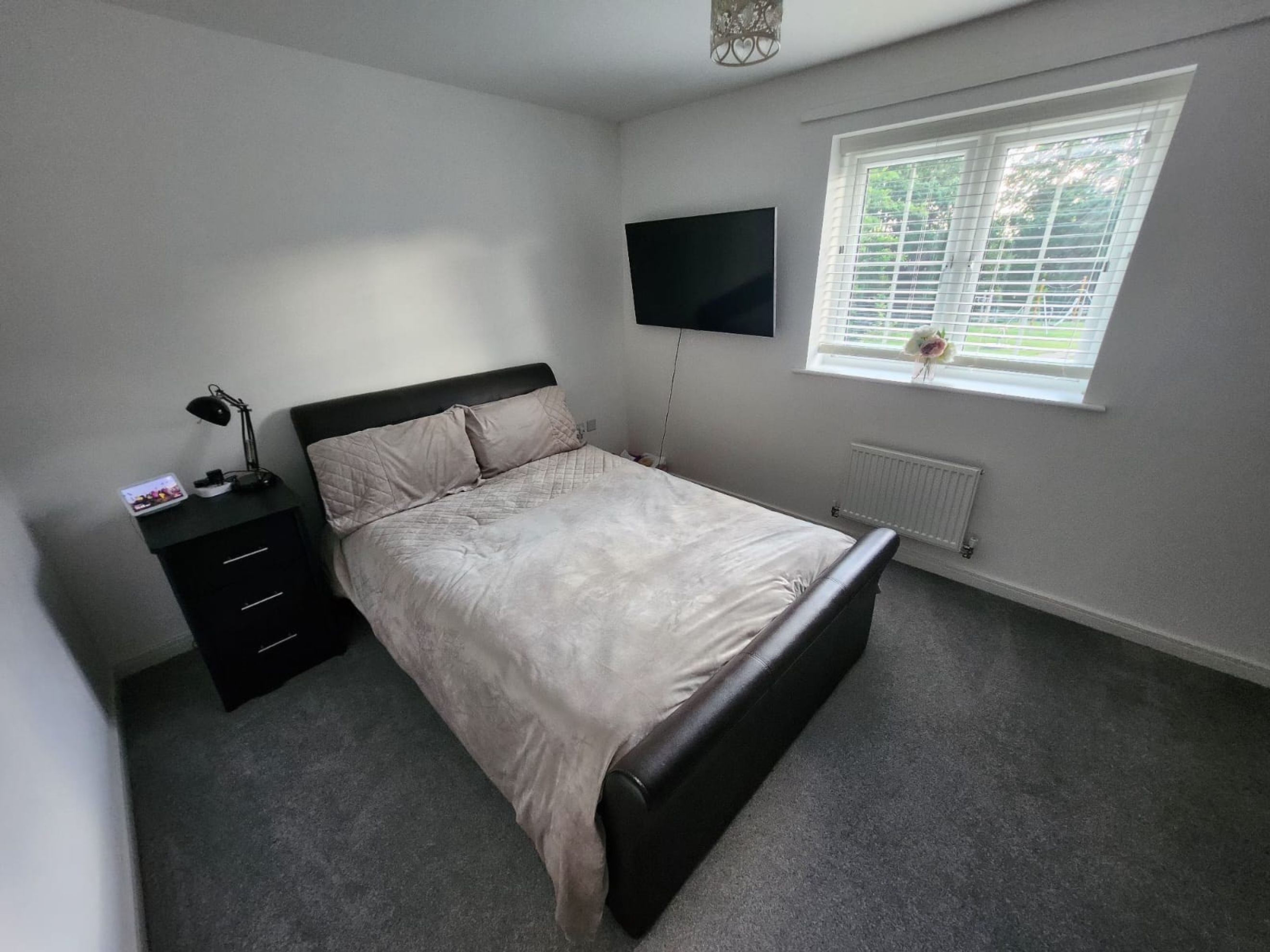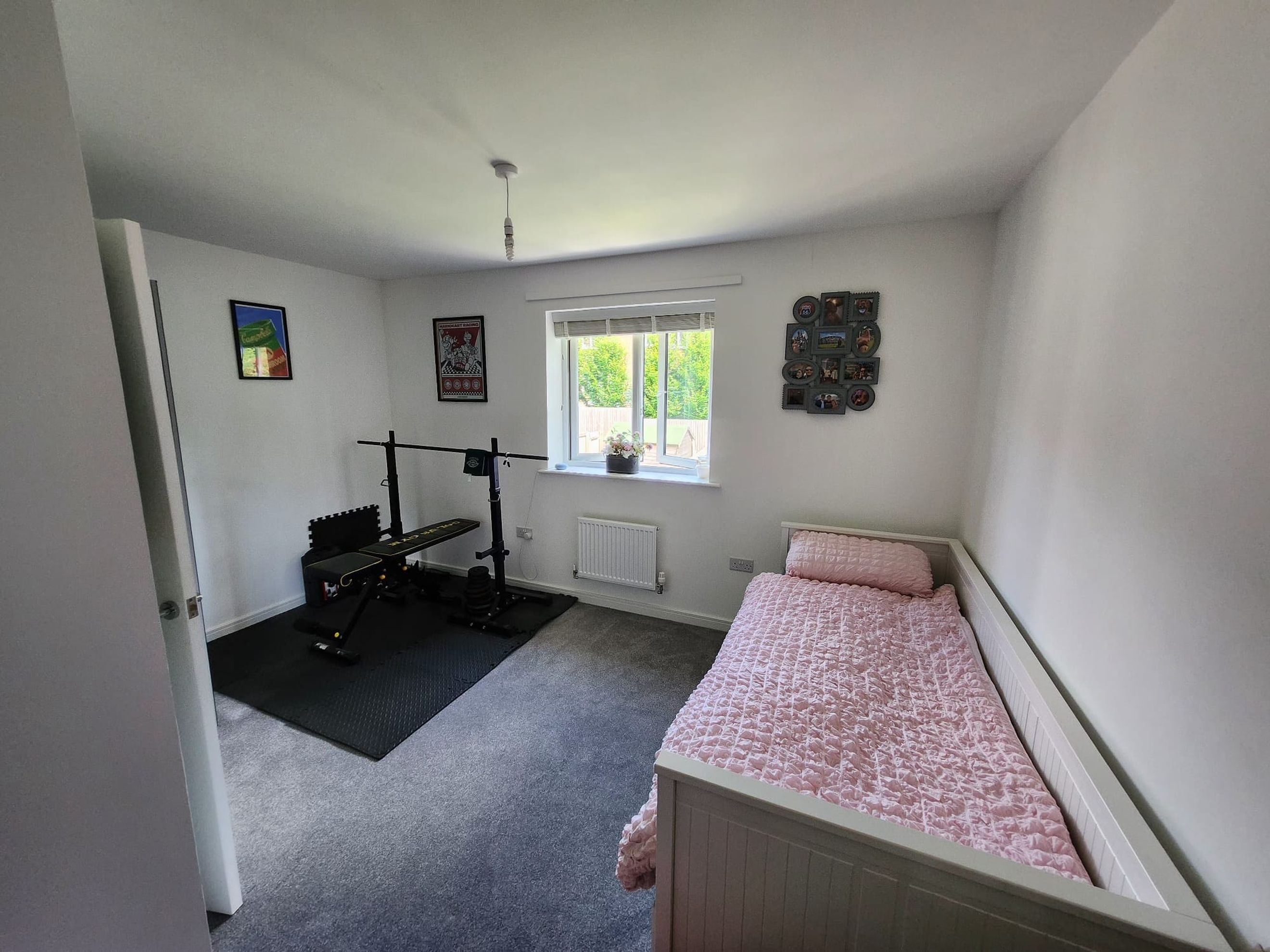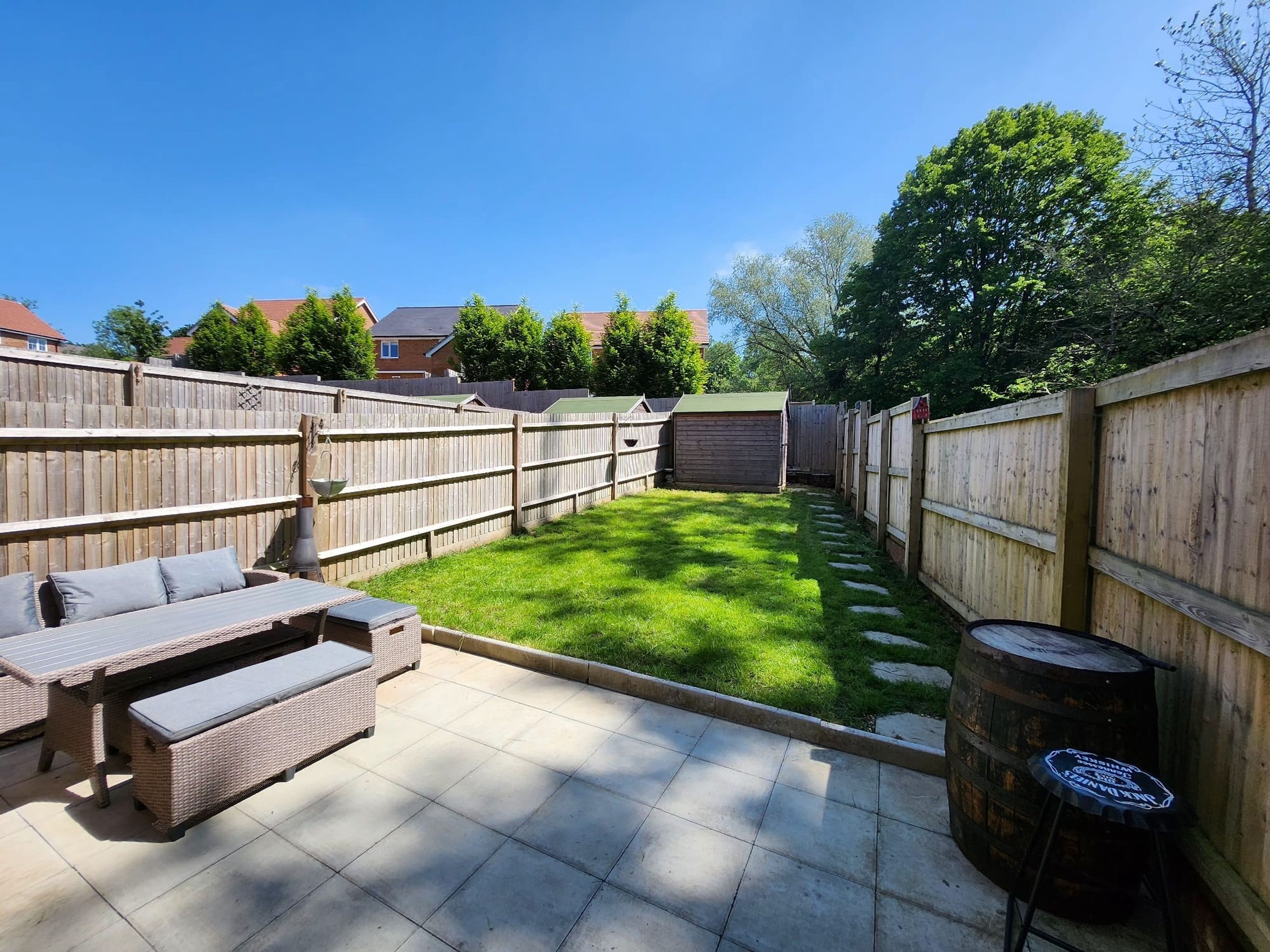 This property consists of an open-plan living room with a separate kitchen, complete with an integrated oven. The ground floor features a convenient WC located off a separate hall. The rear door from the living room leads to an extended patio, ideal for outdoor dining, and a private garden with a designated bin storage area and shed. Upstairs, you will find a spacious master bedroom, a second double bedroom, and a modern family bathroom with a shower over the bath.