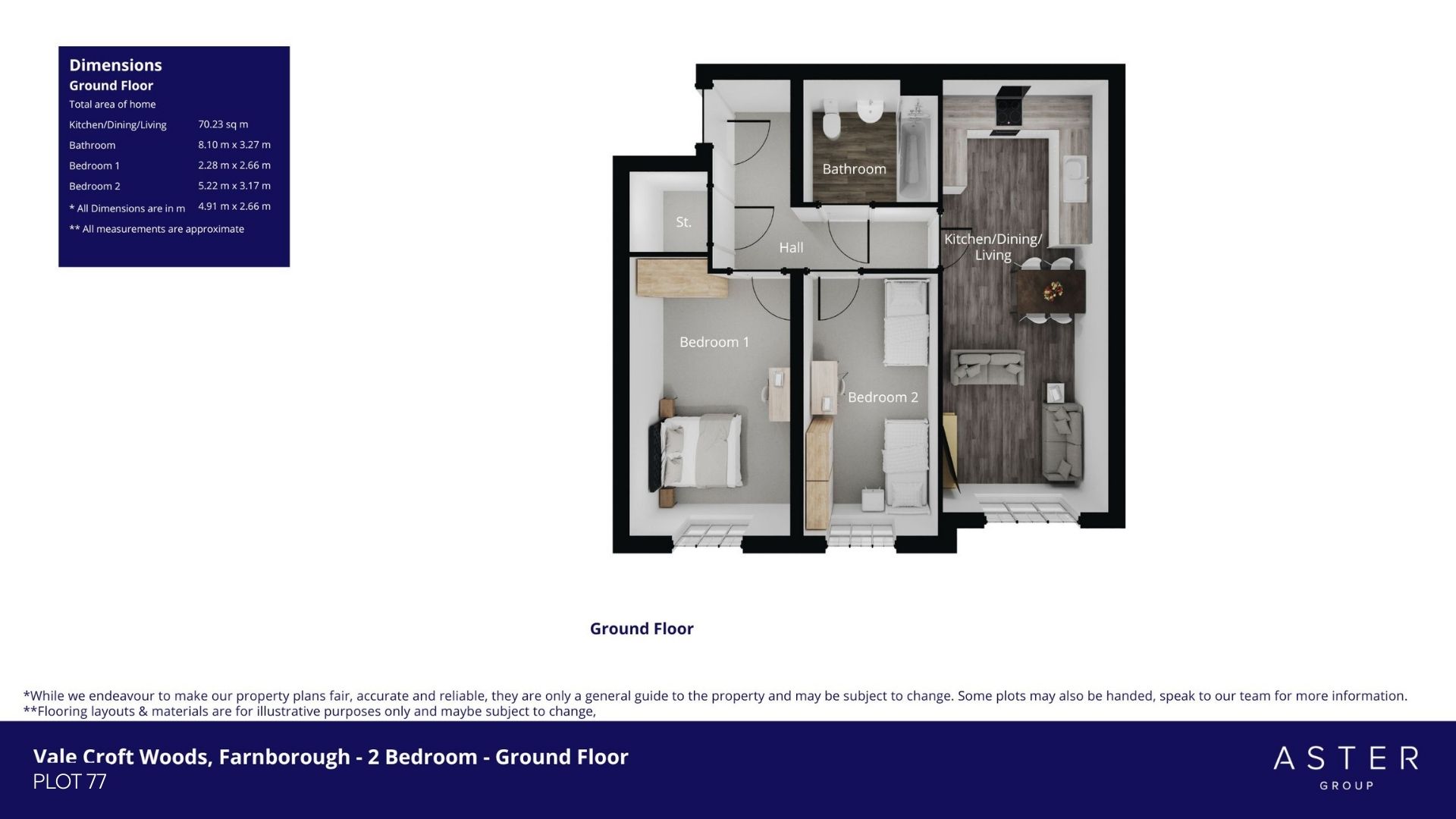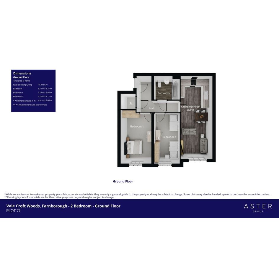 Welcome to Plot 77, a beautifully designed two-bedroom ground floor apartment. Step into a spacious open-plan kitchen/dining/living area, perfect for relaxing evenings or entertaining friends. Bedroom 1 is generously sized, providing a peaceful retreat with plenty of room for storage and bedroom 2 makes for the perfect spare bedroom or home office. A stylish bathroom completes the layout, combining comfort and convenience in one elegant package.