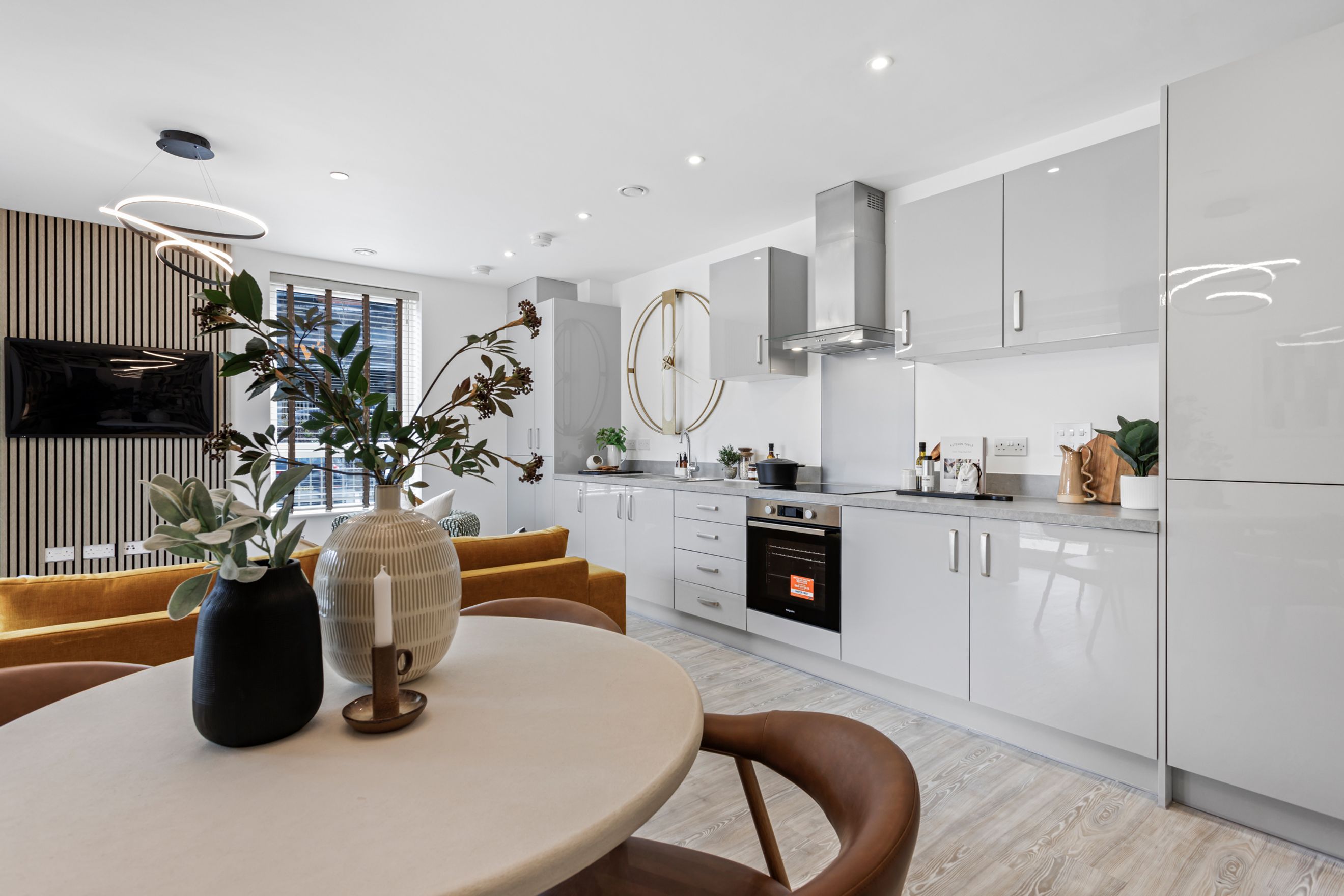 Featuring an open-plan kitchen / living / dining room with a door out to your balcony. The kitchen is fitted with an oven, hob and hood.