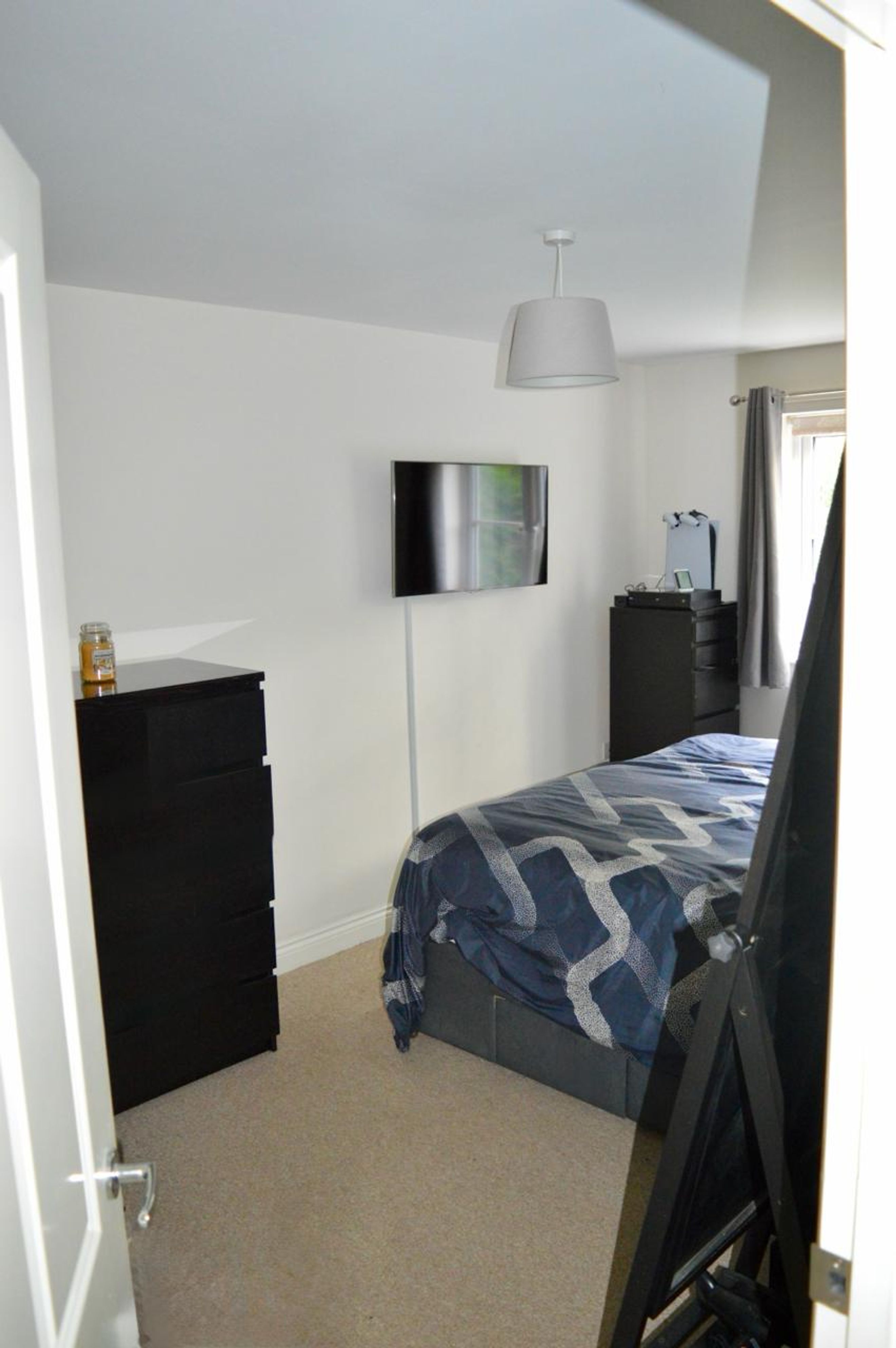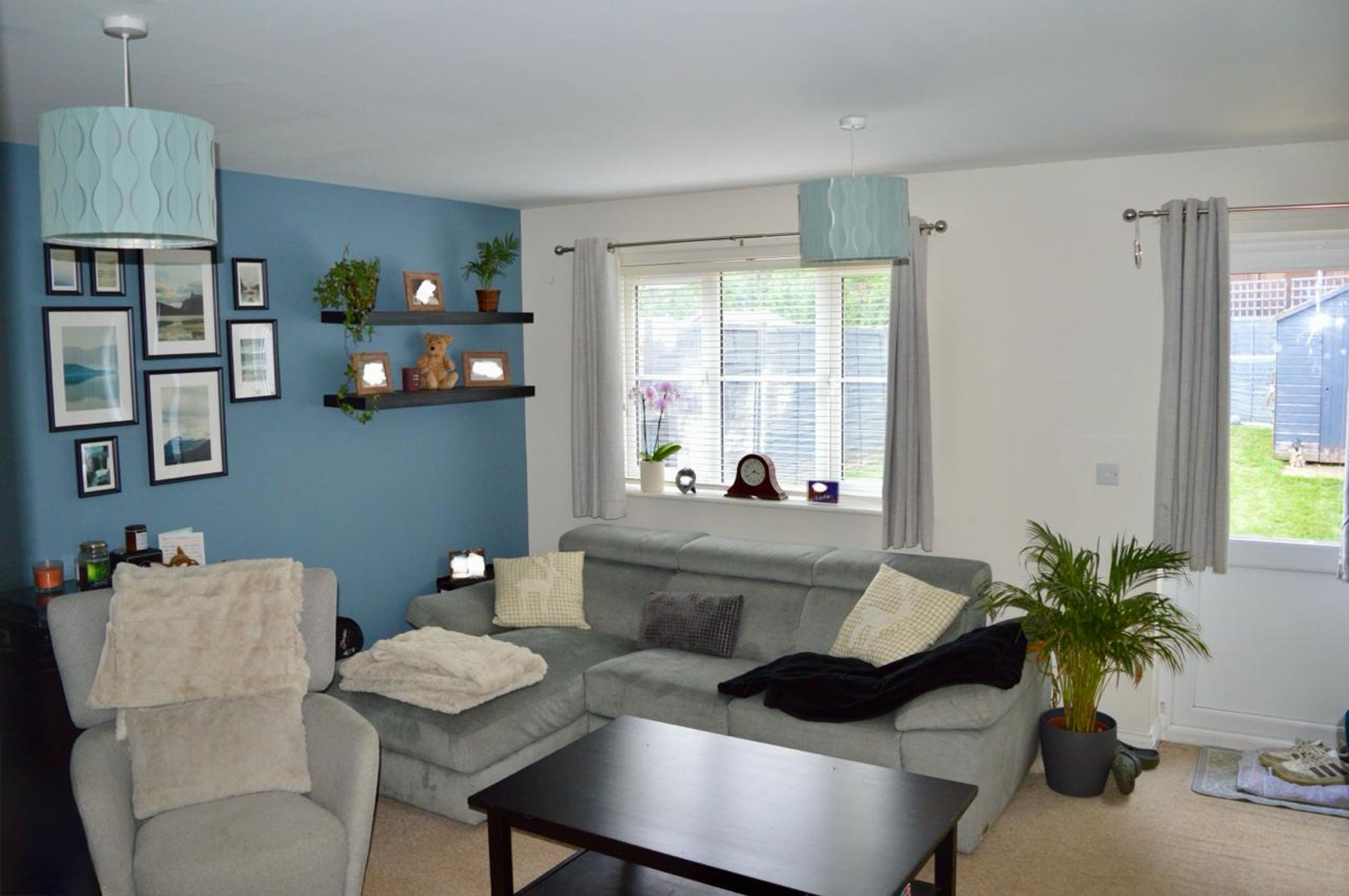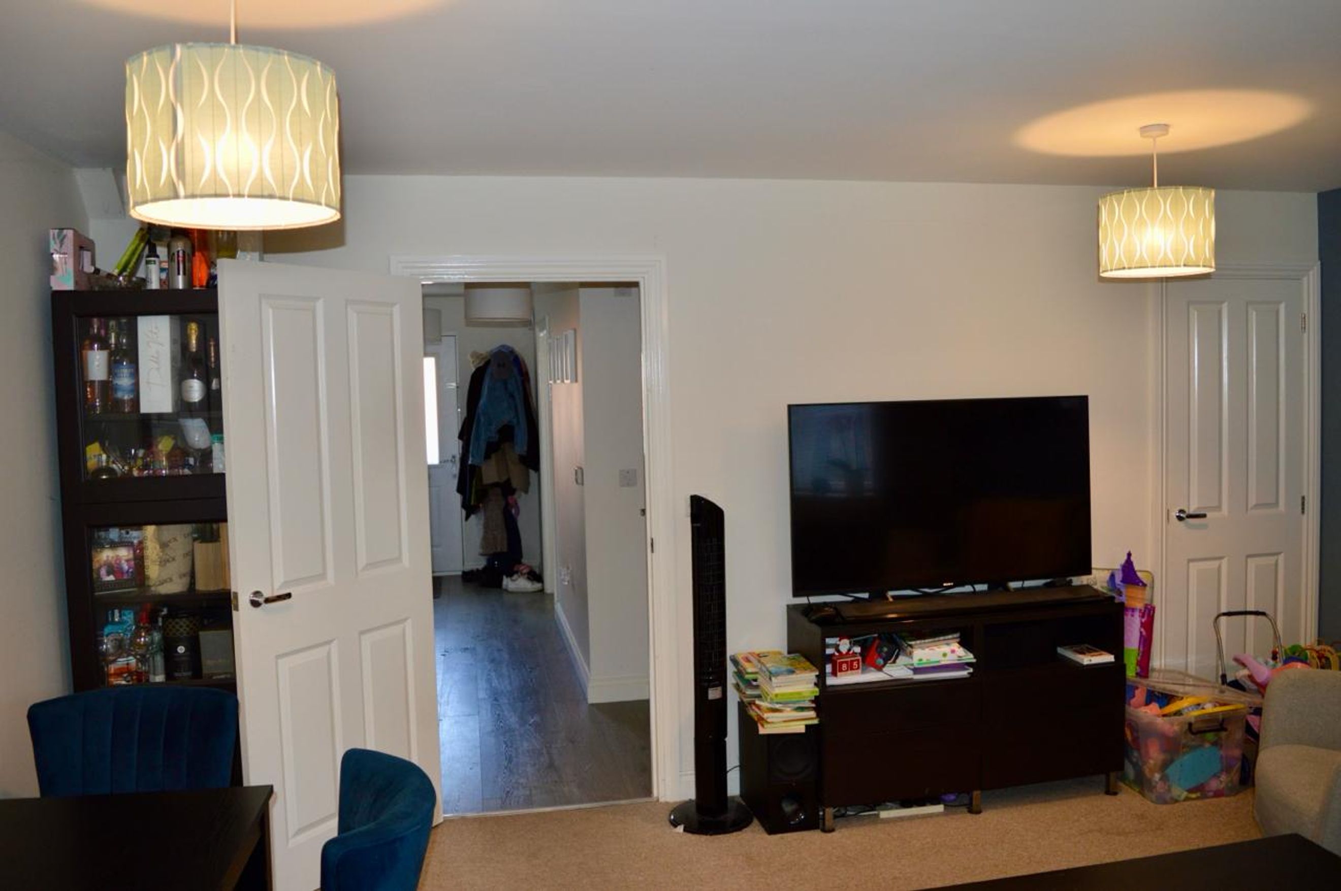 Step inside to find a separate living room featuring a handy storage cupboard and direct access to the private rear garden. The modern kitchen is well-equipped with ample storage and integrated appliances including a dishwasher, fridge freezer, oven, hob, and extractor fan.