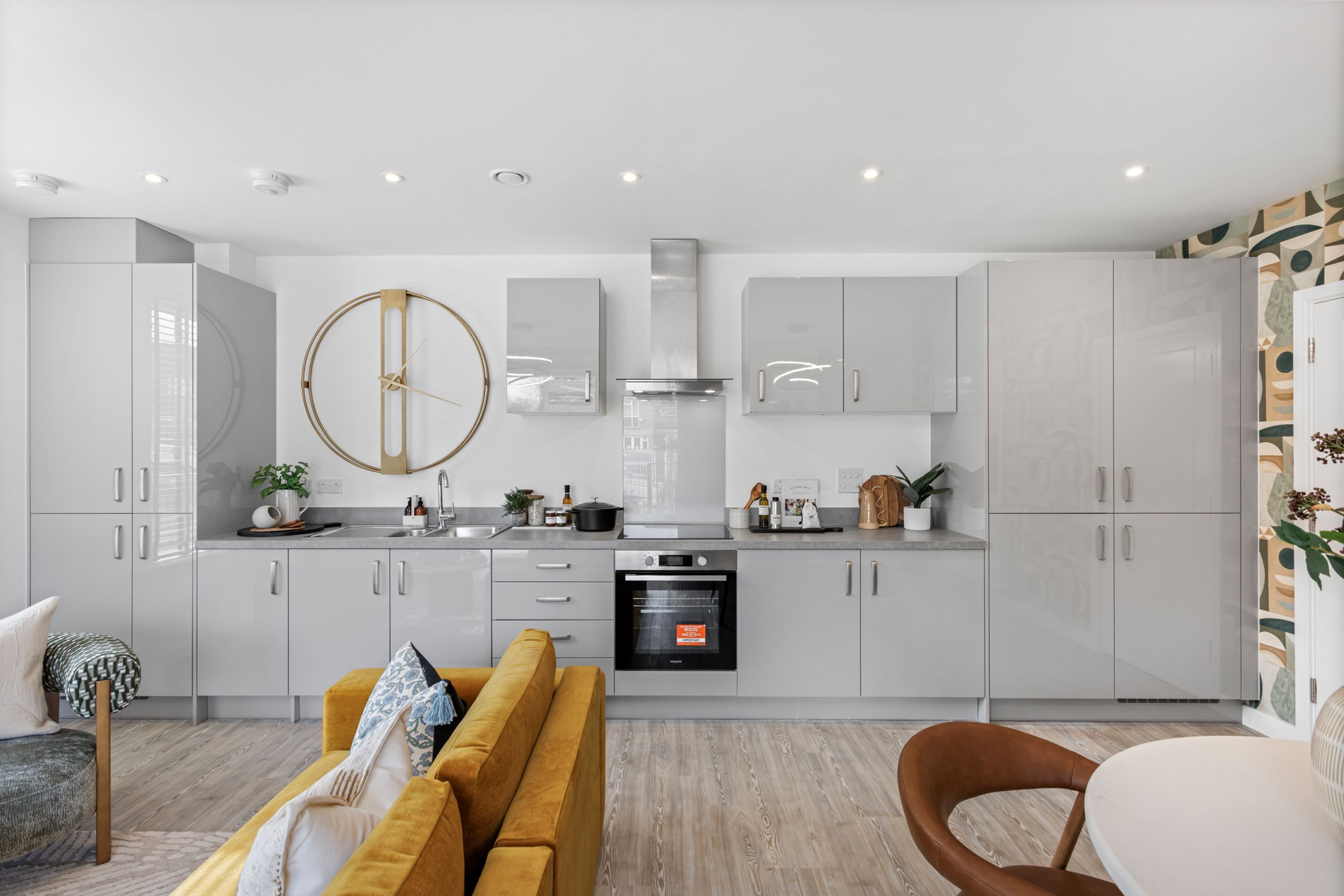 Featuring an open-plan kitchen / living / dining room with a door out to your balcony. The kitchen is fitted with an oven, hob and hood.