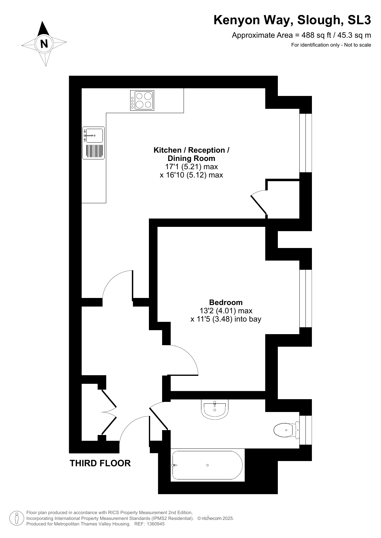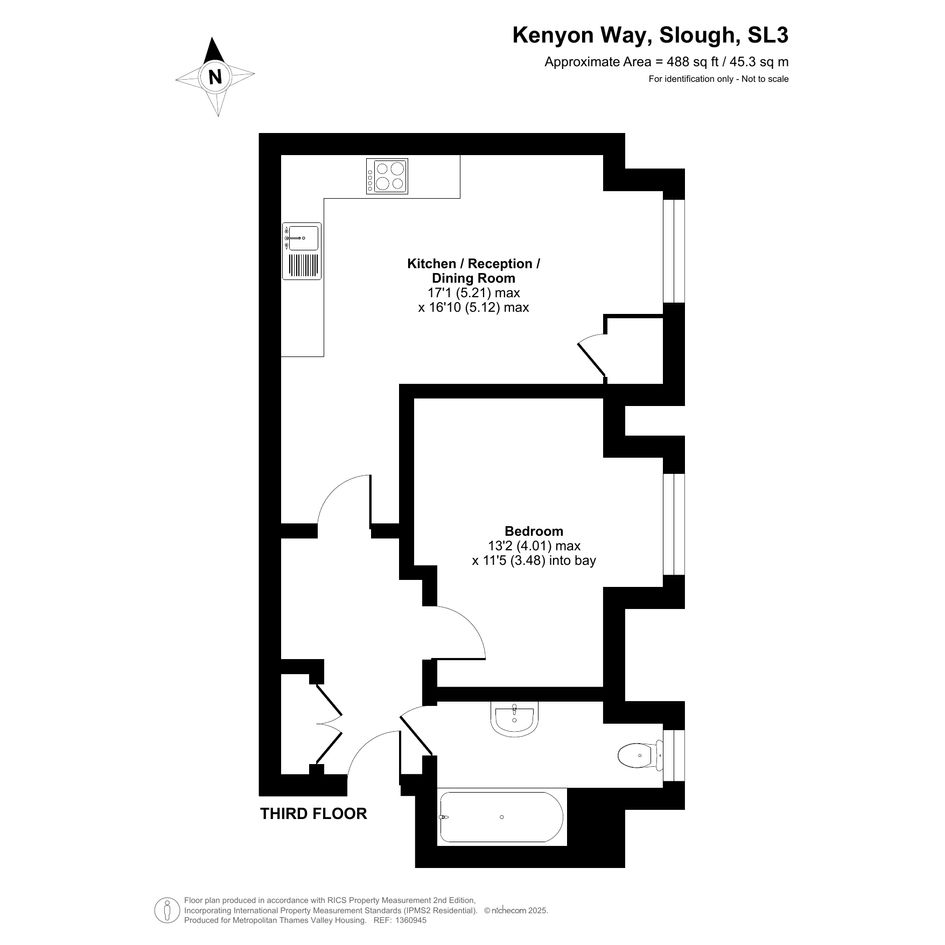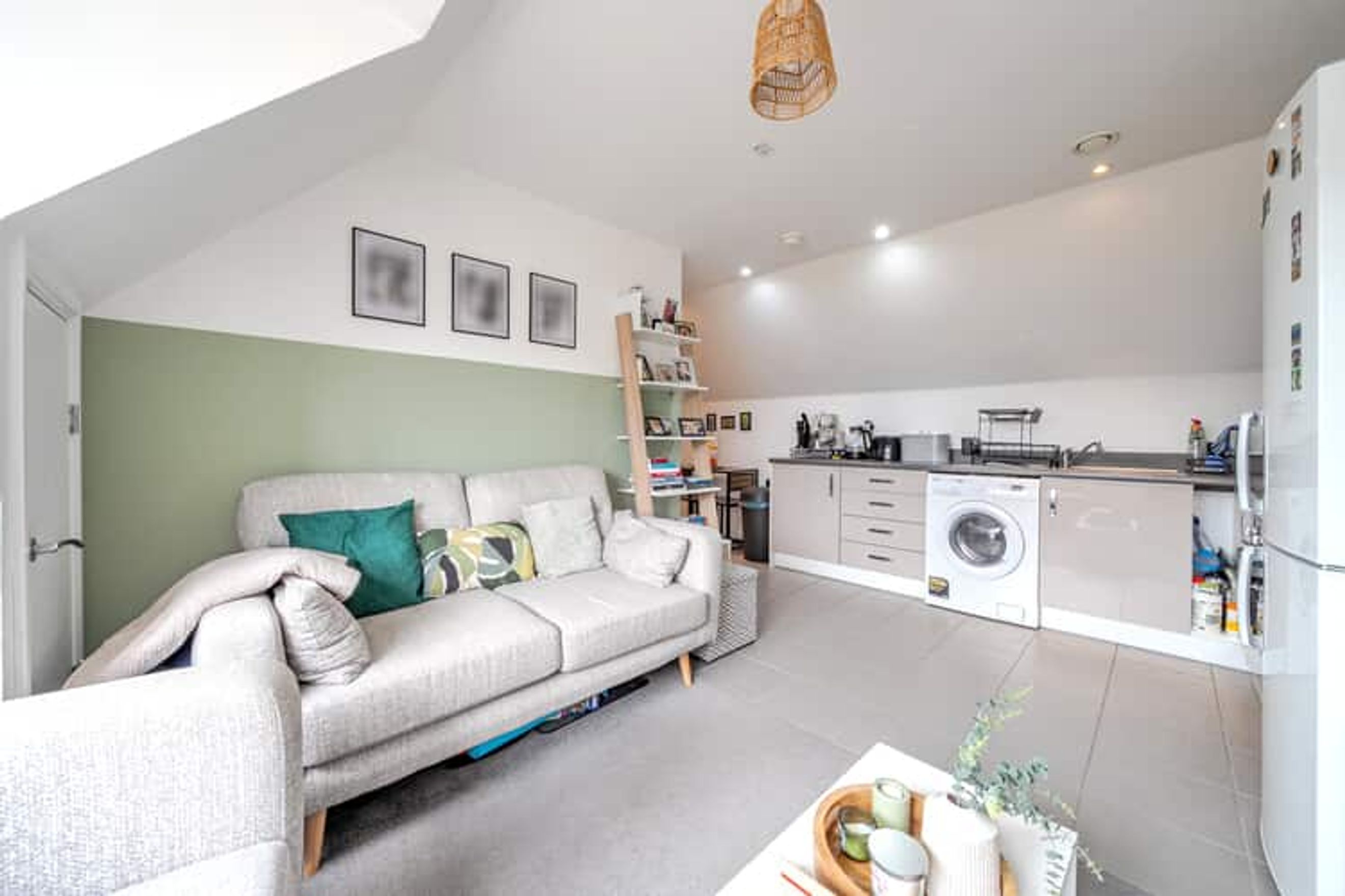 The property on the third floor comprises an entrance hall with a storage cupboard, a living room with a modern open-plan kitchen, one double bedroom, and a bathroom.
