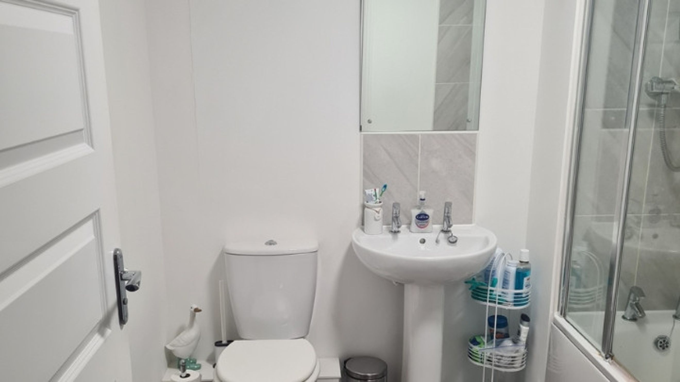 The family bathroom is accessed from the landing and features a clean white suite, with a shower over the bath and a shower screen. The wood-effect flooring and partially tiled walls add a stylish touch.