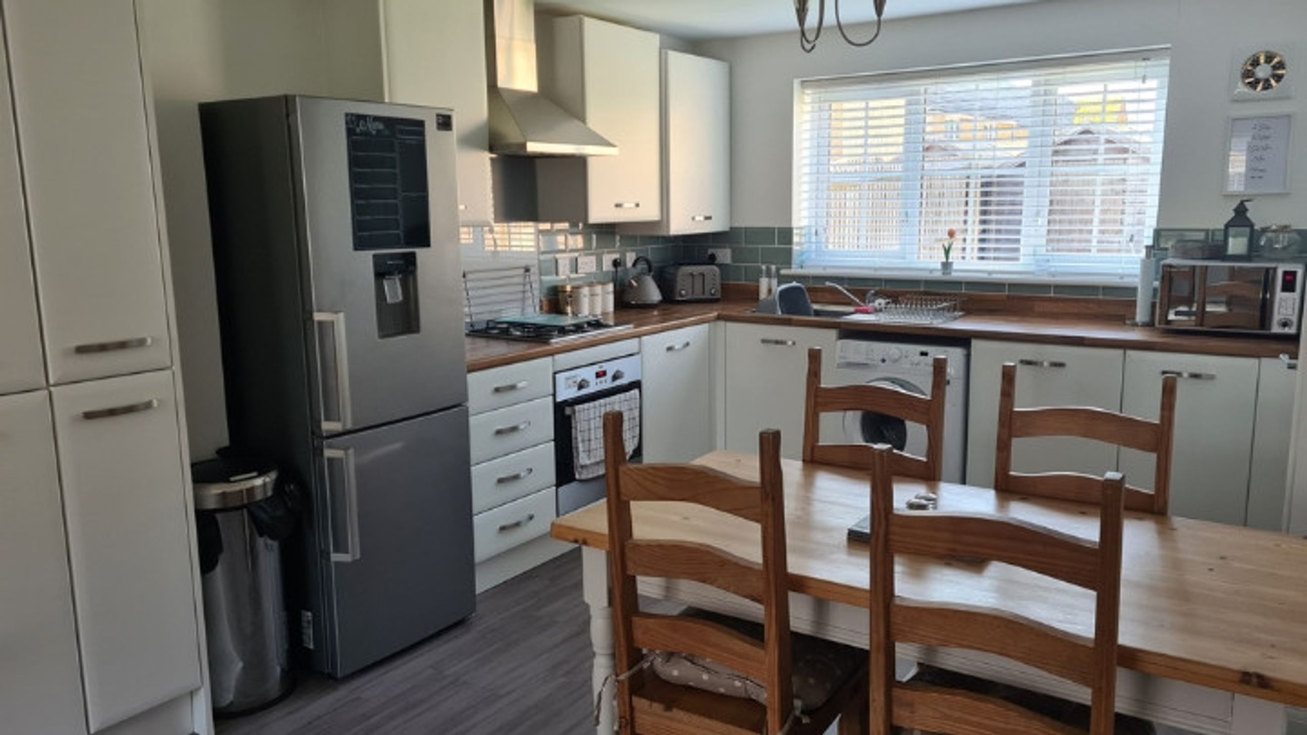The kitchen and dining area is filled with natural light and features practical vinyl flooring. The kitchen is well-equipped with a stainless-steel sink and drainer, gas hob, electric oven, and extractor fan. There is also space for a fridge/freezer and a washer/dryer, making it ideal for everyday living.