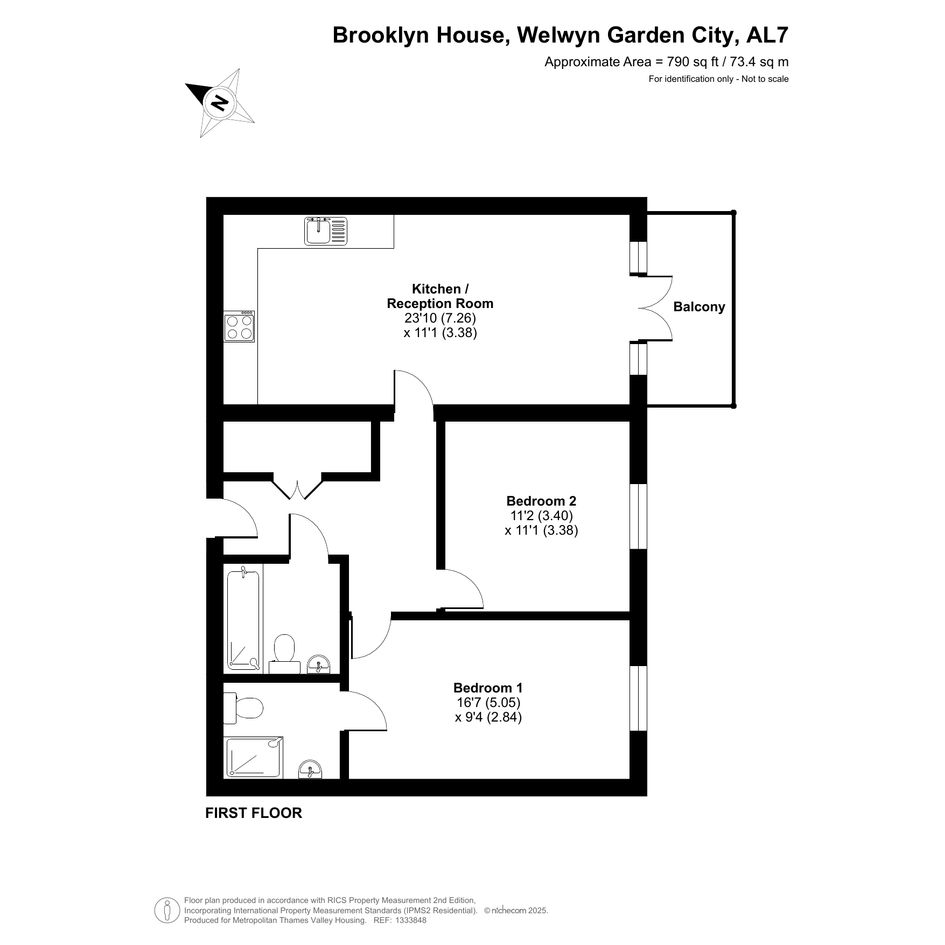 The property features an open plan living room and kitchen, two bedrooms, and two bathrooms.
