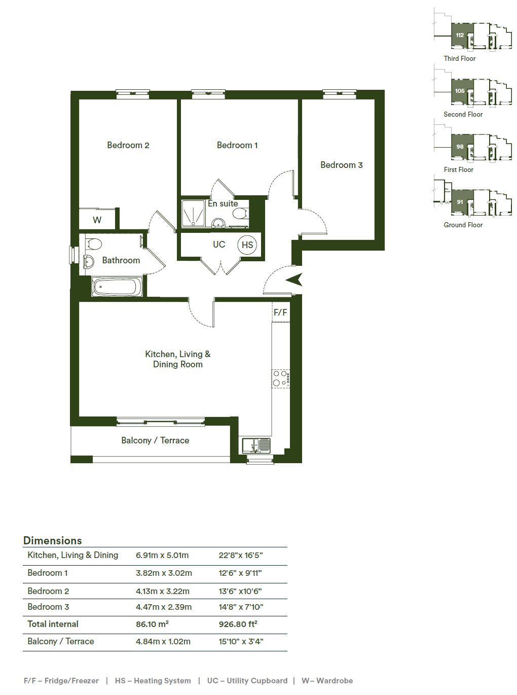 3 bedroom, 2 bathroom apartment. 86 sq m of internal space and private terrace.