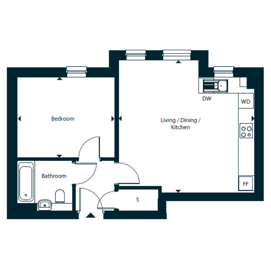 The Iris is a contemporary one-bedroom 1st floor apartment which boasts a large open-plan kitchen/living/dining area for you to make you own, such as the space for a work from home set up. The kitchen is complete with integrated appliances for a sleek and modern appearance. With one generously sized bedroom and a modern bathroom.
