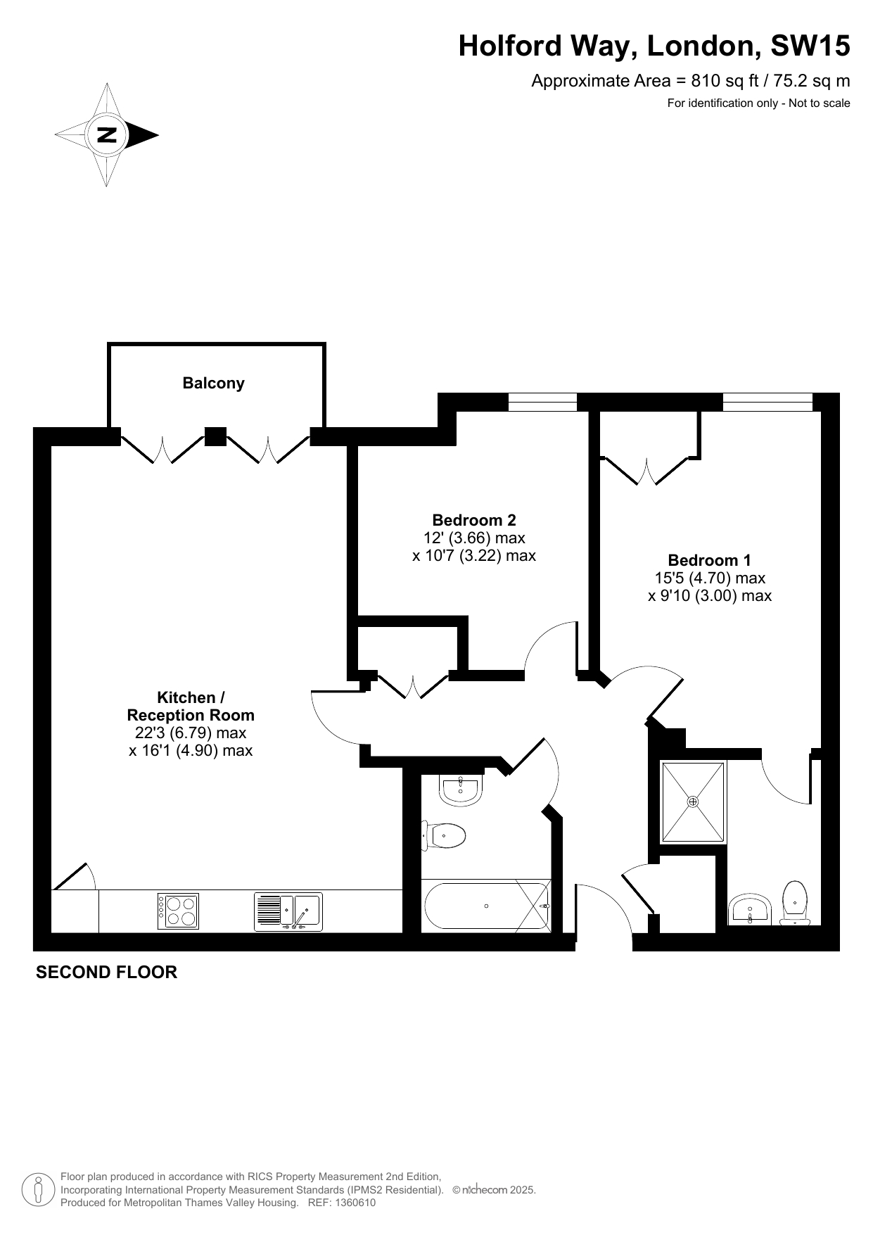 The property features an entrance hall, an open-plan living room and kitchen, two bedrooms, and two bathrooms. The property is on the first floor and offers residents a private balcony and an allocated parking space.