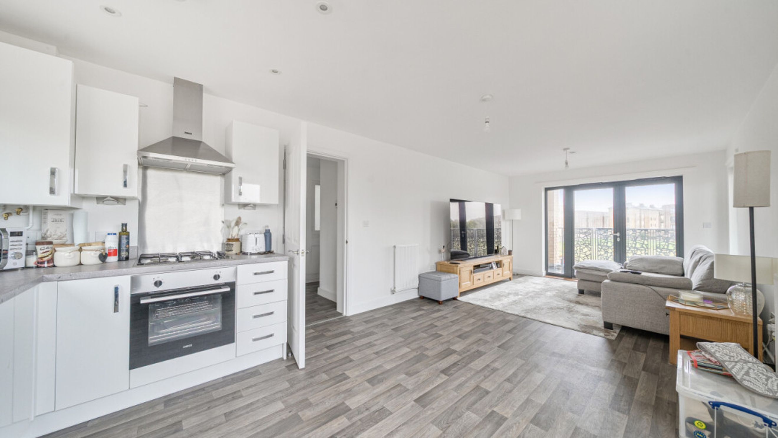 All rooms lead from a central hallway in this nearly new first floor apartment. Two west facing double bedrooms are served by a contemporary bathroom with a shower over bath and glass shower screen. The bright and airy triple aspect livng area leads onto a private balcony with views across green open space. A fitted Symphony kitchen, with soft close doors and cupboards and under cupboard lighting, includes fully integrated ridge freezer, dishwasher, washing machine, oven with extractor hood.