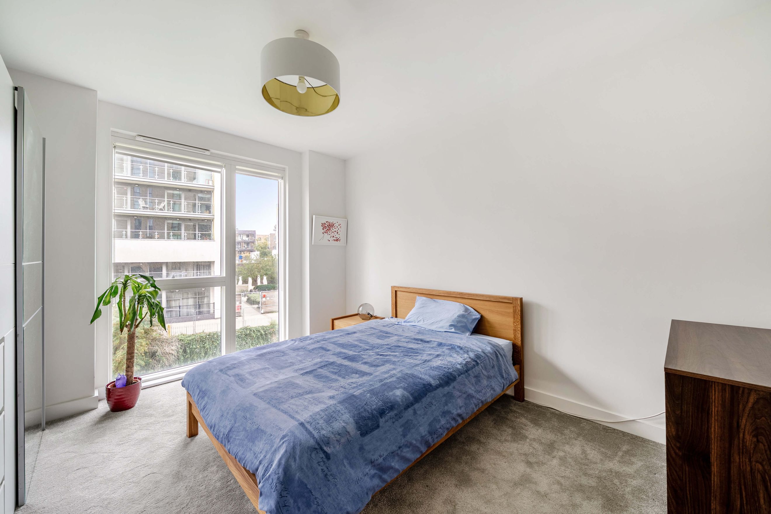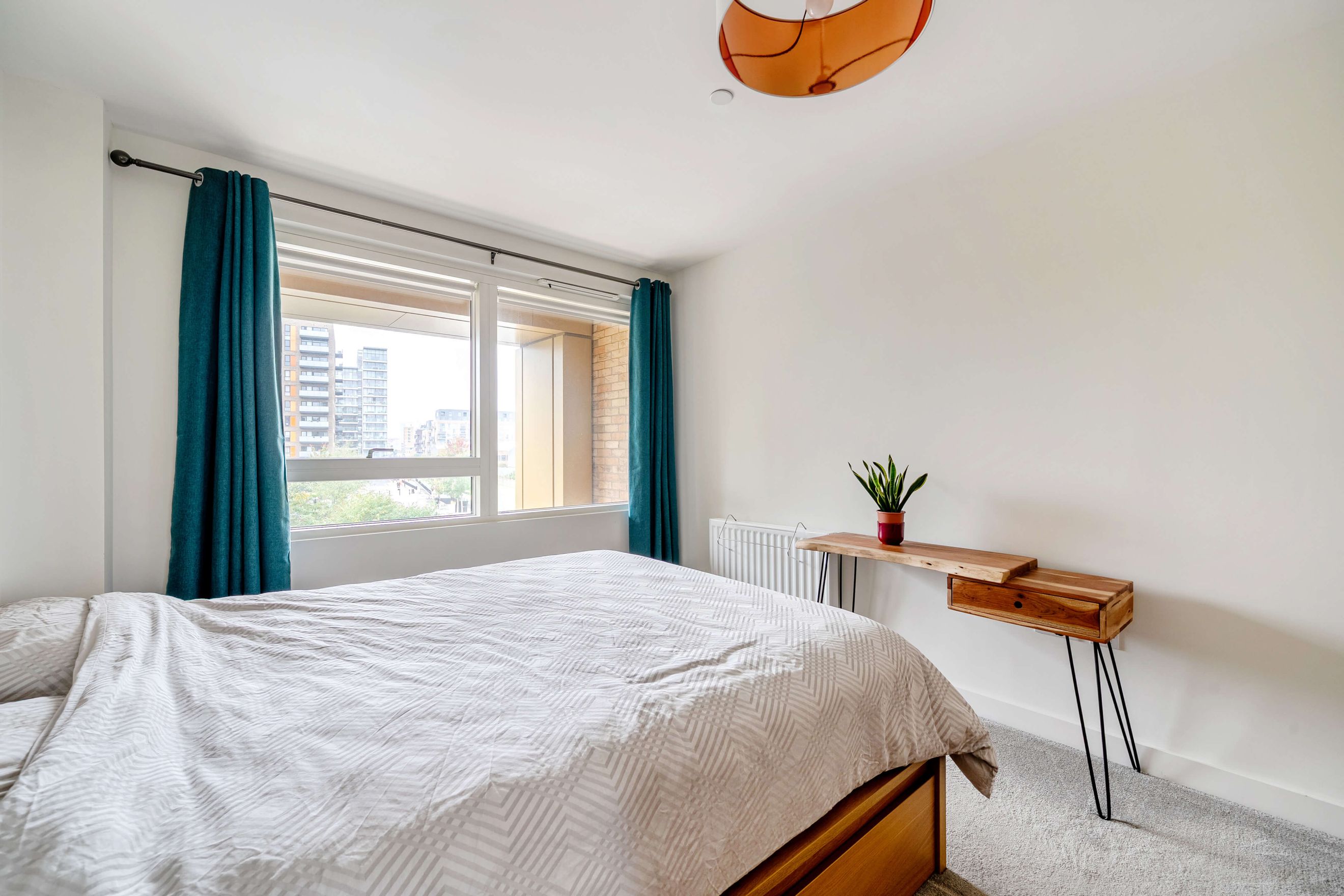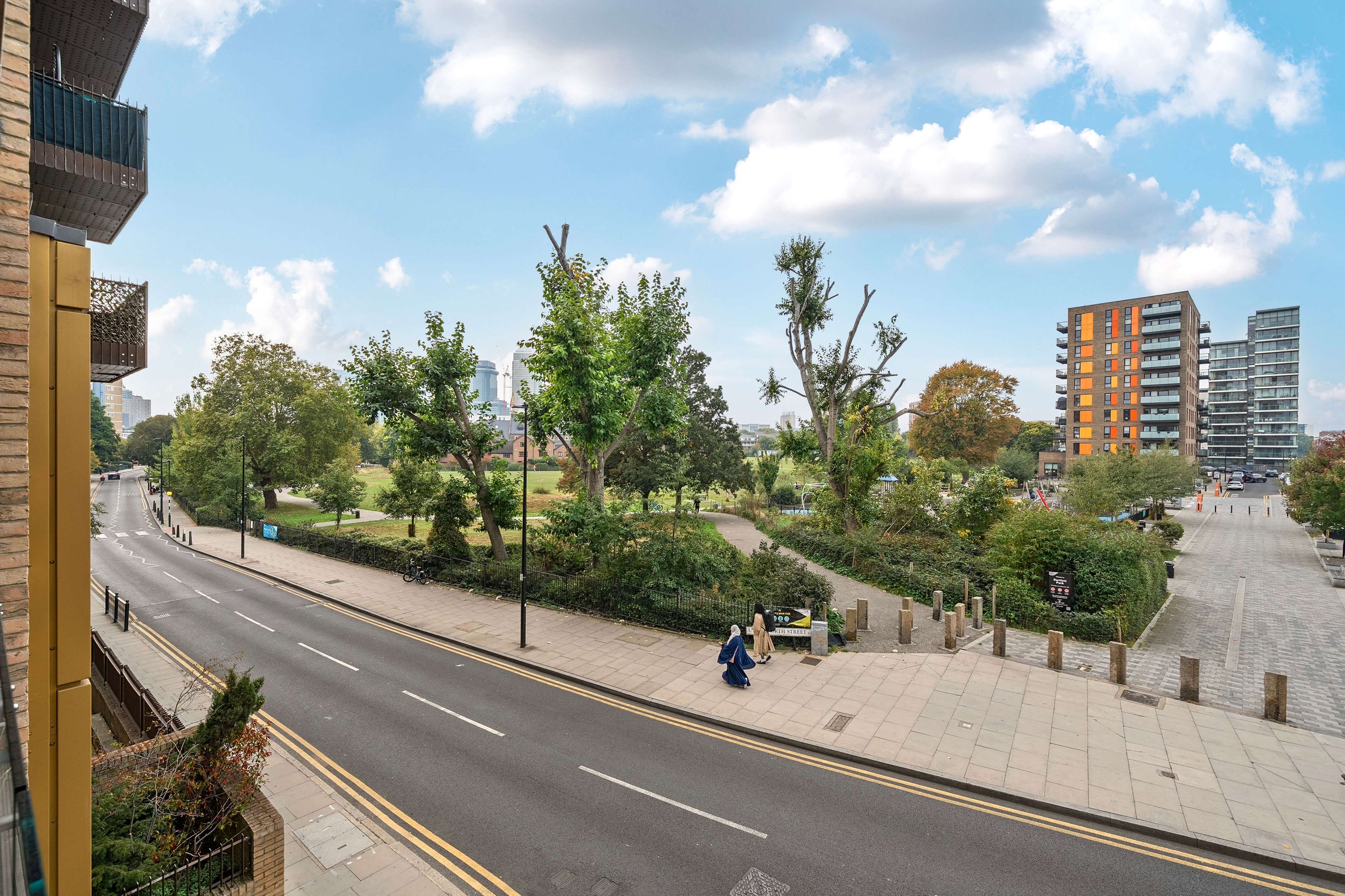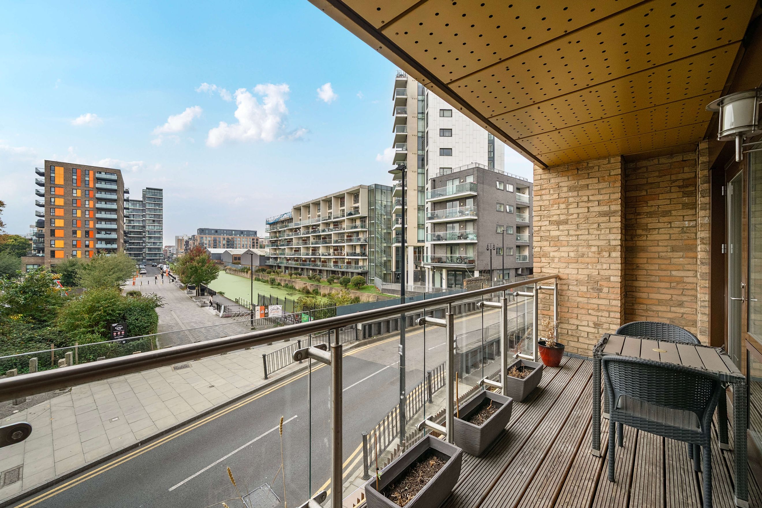 The property comprises two generous bedrooms, a modern bathroom, and a standout feature — a large private balcony with sweeping views over Bartlett Park and Limehouse Cut canal, perfect for morning coffees or evening relaxation. Secure underground bike storage is also included.