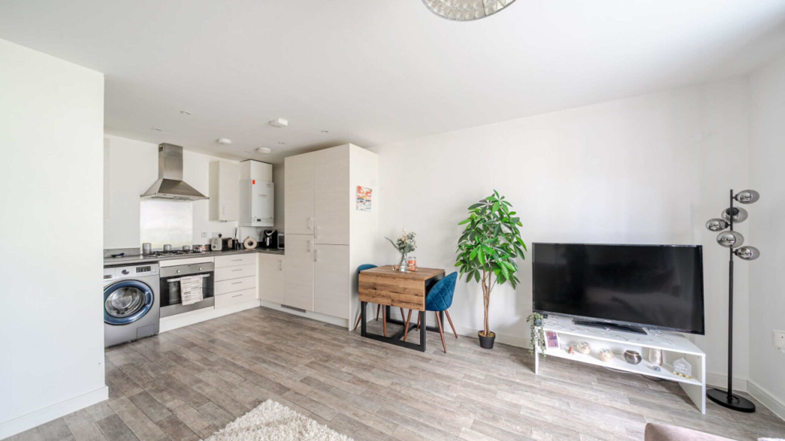 The home features an inviting open-plan layout with a spacious living, dining and kitchen area - ideal for relaxing or entertaining. A private balcony extends the living space, providing a bright spot to enjoy your morning coffee or unwind after a busy day. The double bedroom includes a built-in wardrobe, while the large hallway cupboard offers valuable extra storage. The apartment also benefits from gas central heating, a good EPC rating (B), and integrated appliances, including a fridge-freezer and cooker.