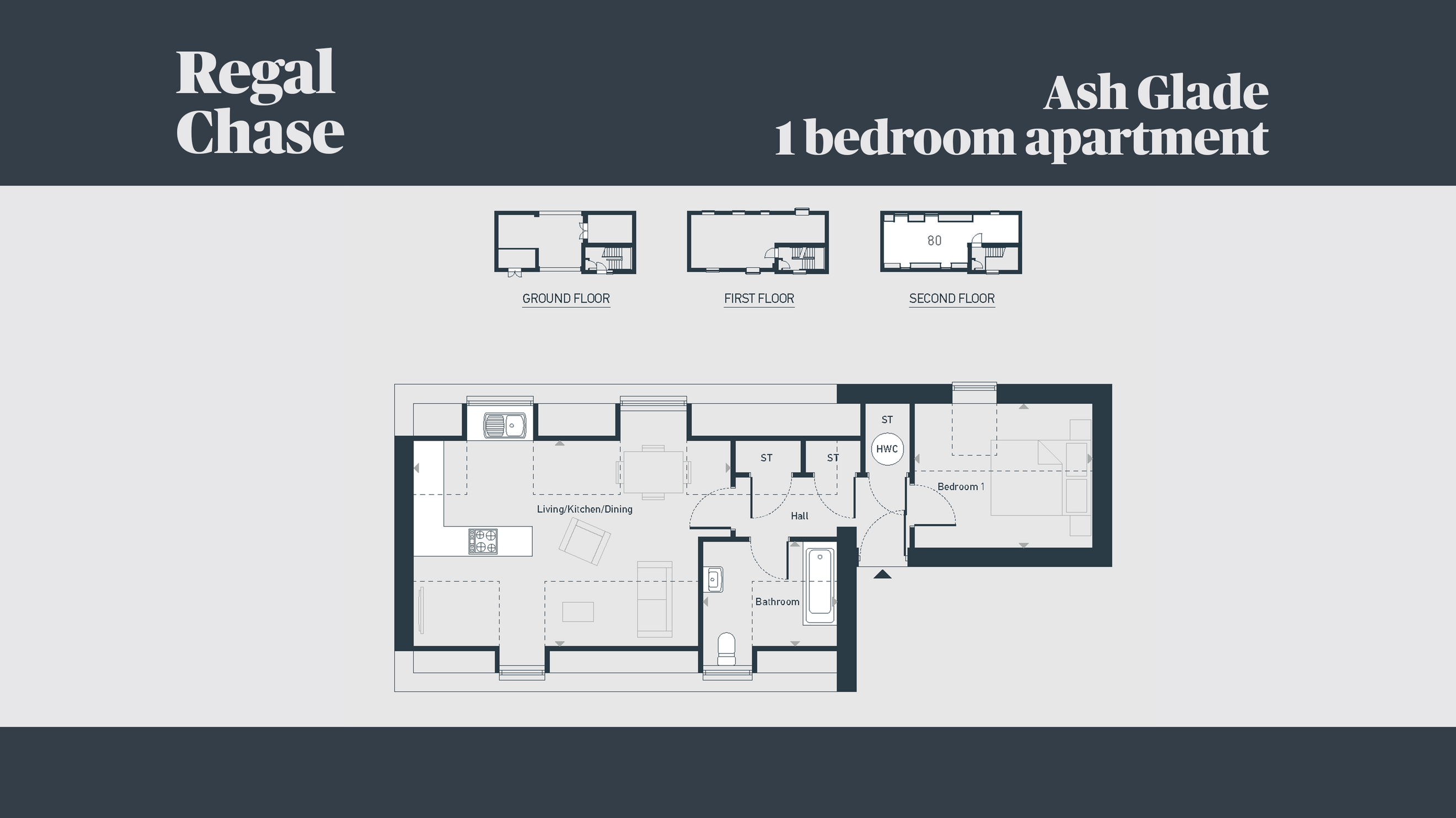 Plot 80 - Ash Glade - Modern 1 bedroom apartment in Alderholt's Regal Chase development, offering open-plan living, a double and single bedroom, stylish bathroom and hallway storage.