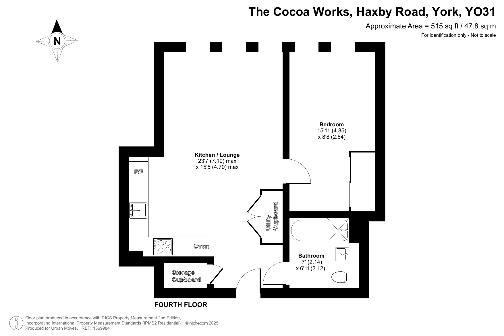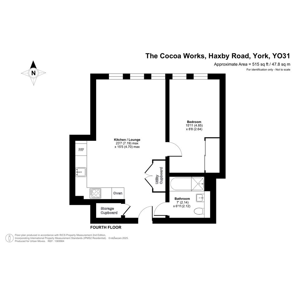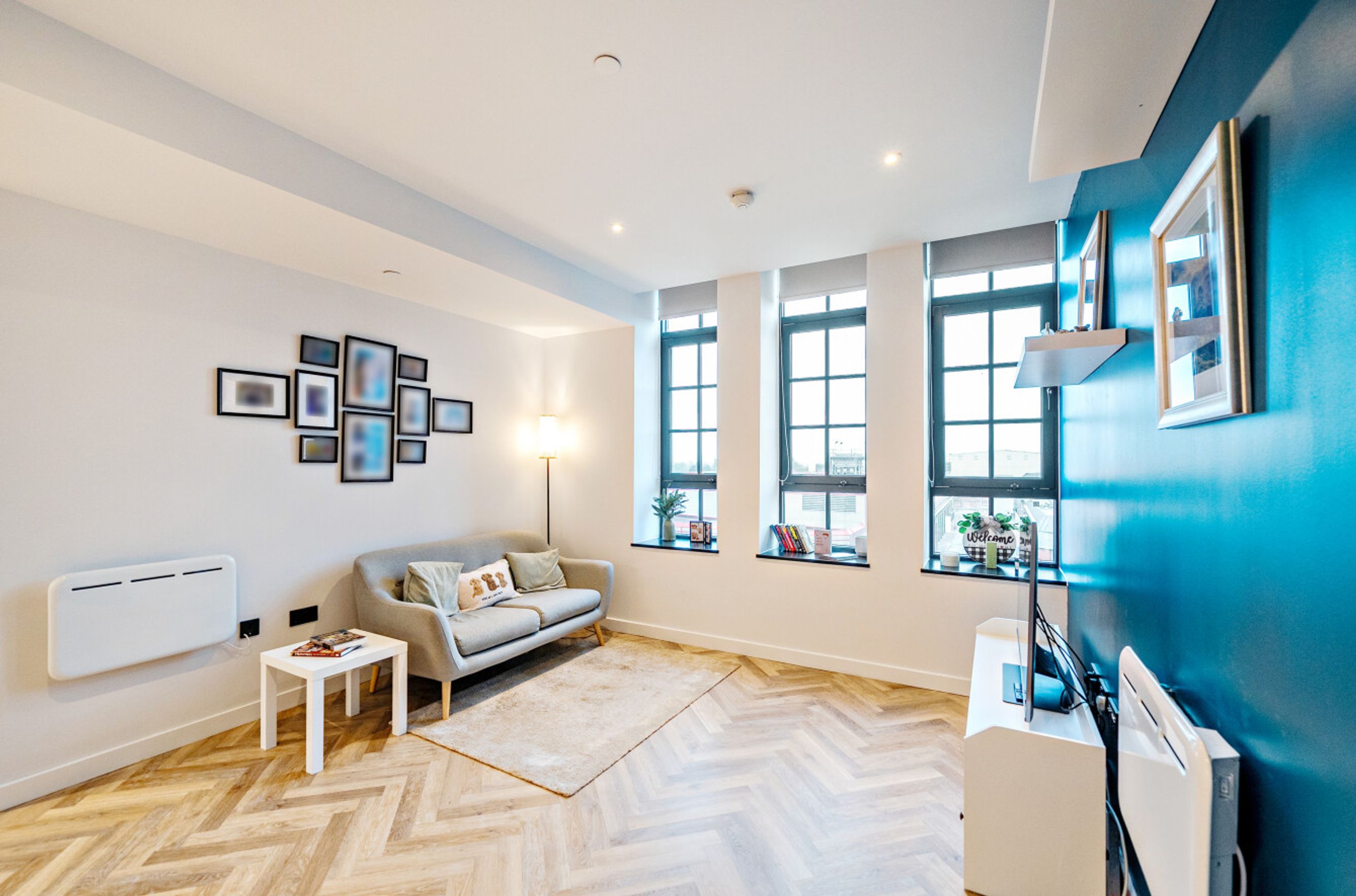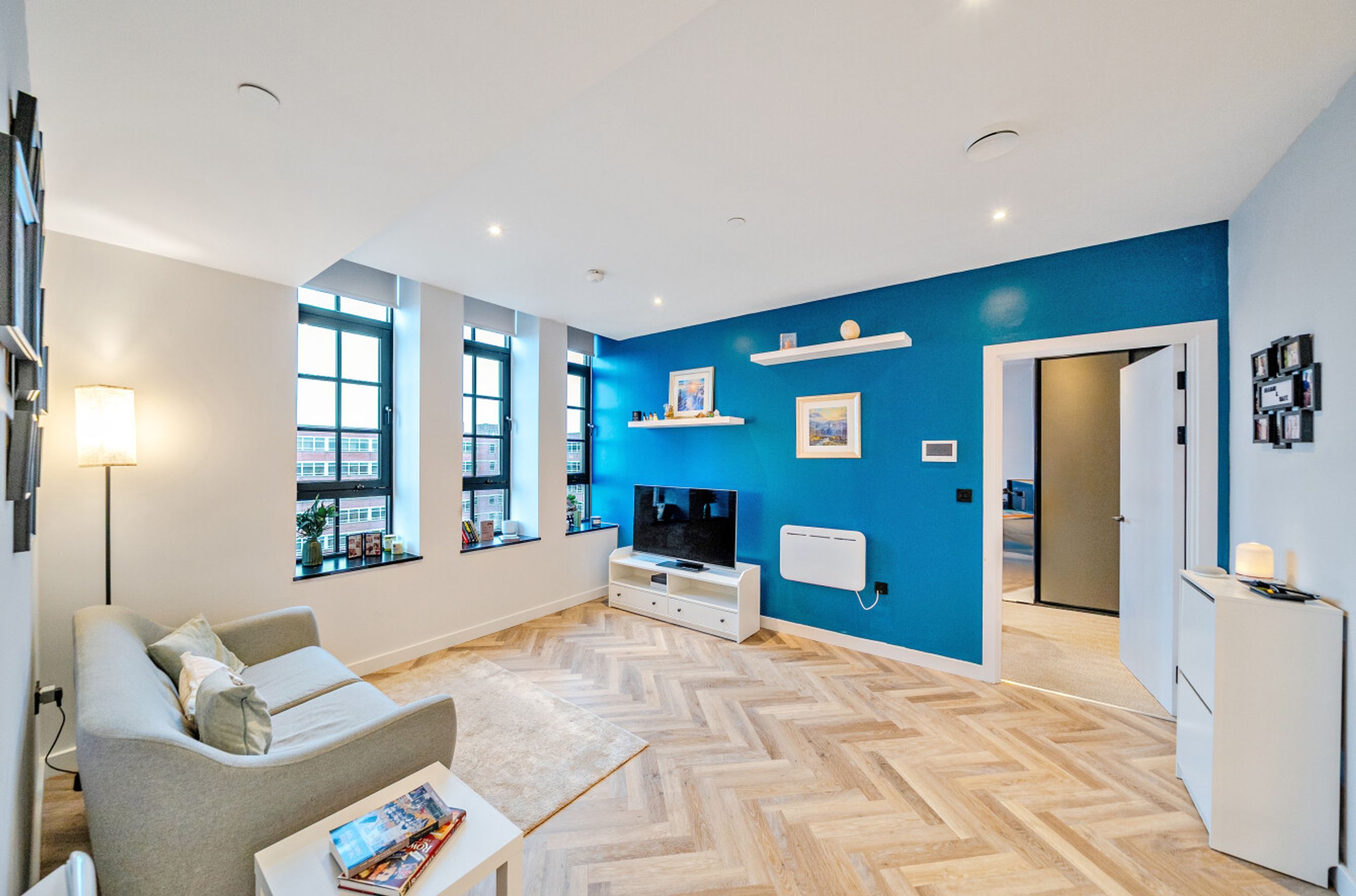 A smartly-presented apartment on the fourth floor (building has a lift) of the recently-converted Rowntree chocolate works site. The property has a twenty-three-foot reception room with attractive herringbone flooring and a trio of windows. The open-plan kitchen area features handle-less units and integrated appliances. There is a spacious bedroom with fitted wardrobe, two large storage/utility cupboards and a stylish, high-spec bathroom. Internal wall insulation and high performance glazing help bring energy-efficiency up to modern standards. Benefitting from a shared co-working space for residents within the restored Joseph Rowntree Memorial Library and staffed by a concierge. The city centre is within comfortable walking distance and can also be reached by bus or brief bike ride. The development has a very pleasant communal garden, a concierge and this particular apartment comes with the use of an allocated, off-street parking space.