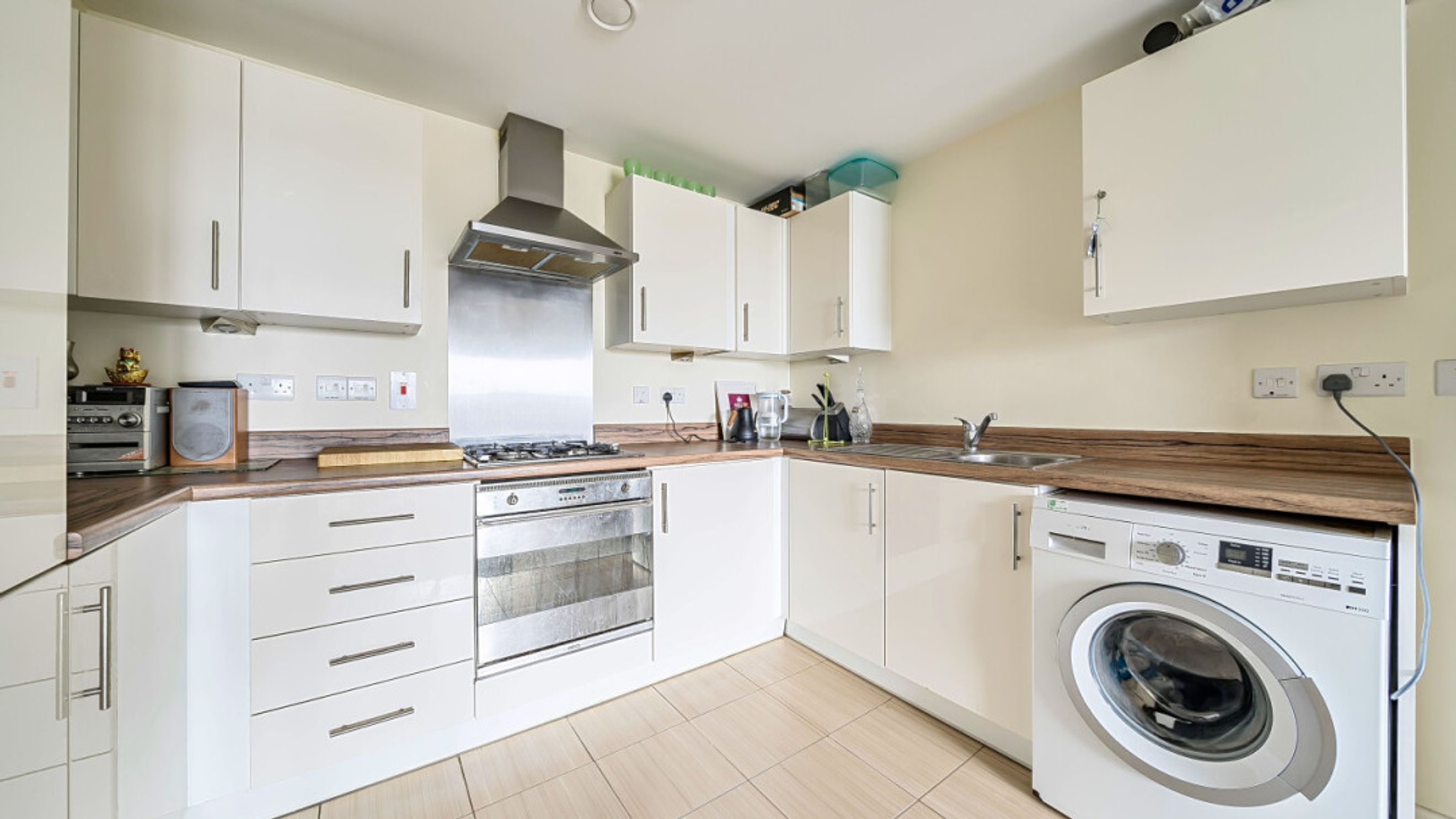 Enter this apartment through a square hallway, with doors to the well proportioned bedroom to your left and the bathroom to your right. Straight ahead, find the generous open plan living area, which opens onto a south facing balcony with rooftop views. The modern kitchen, with plenty of storage, offers some integrated appliances and spaces for your white goods.
