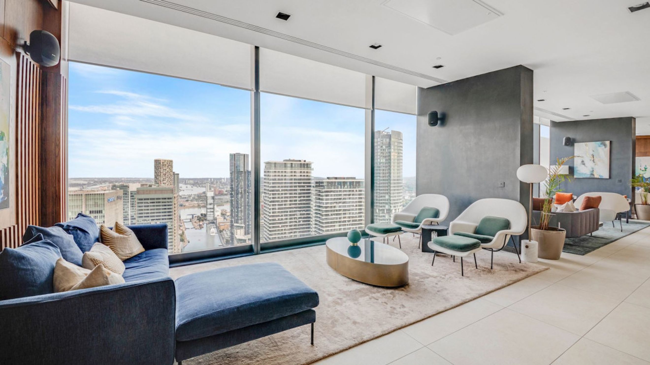 The expansive open-plan reception room is flooded with natural light through floor-to-ceiling south-facing windows, framing panoramic views over South Dock and the iconic Canary Wharf skyline. A private Juliet balcony extends the living space, creating a seamless connection to the city below. The modern kitchen features sleek matte white cabinetry and fully integrated appliances.