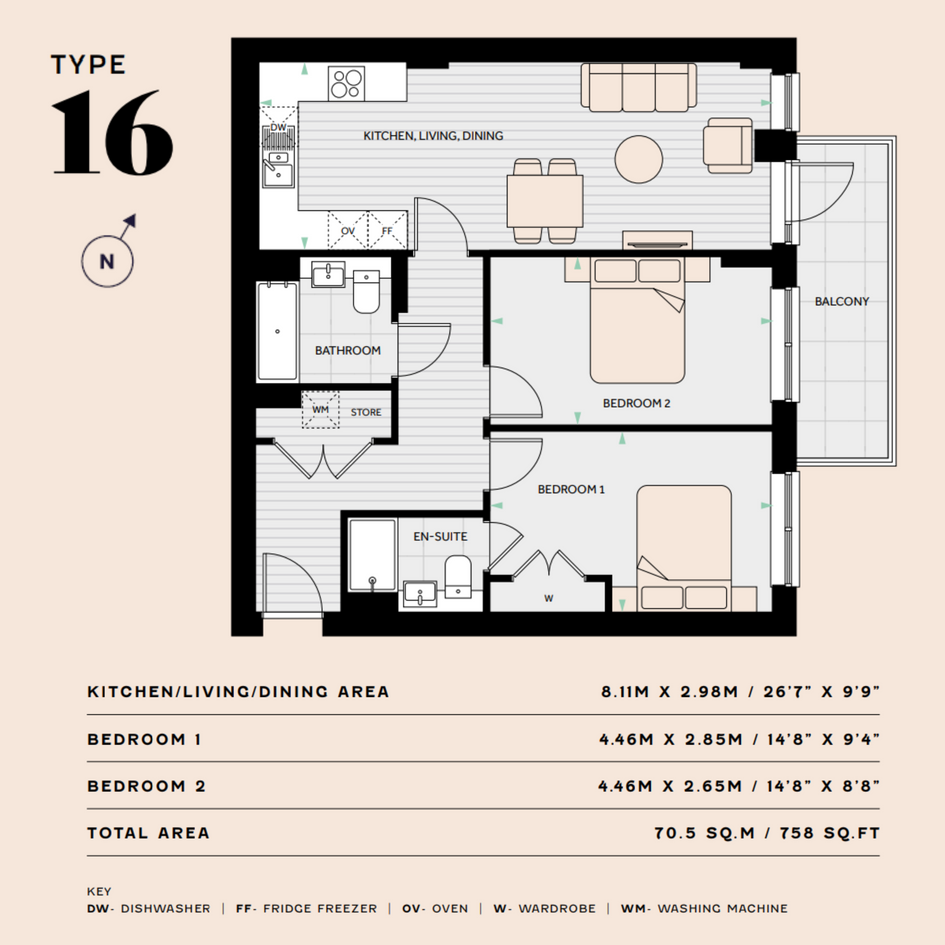 This beautifully designed 759 sq ft 2-bedroom Shared Ownership apartment on the fourth floor combines comfort and practicality with modern style. A generous hallway leads into the open-plan kitchen, dining and living area, offering a versatile space for relaxing or entertaining. The kitchen comes fully fitted with Bosch and Hotpoint appliances, including fridge-freezer, ceramic hob, oven, extractor fan and dishwasher, while a Hotpoint washer-dryer and additional storage are neatly tucked away in the utility cupboard.