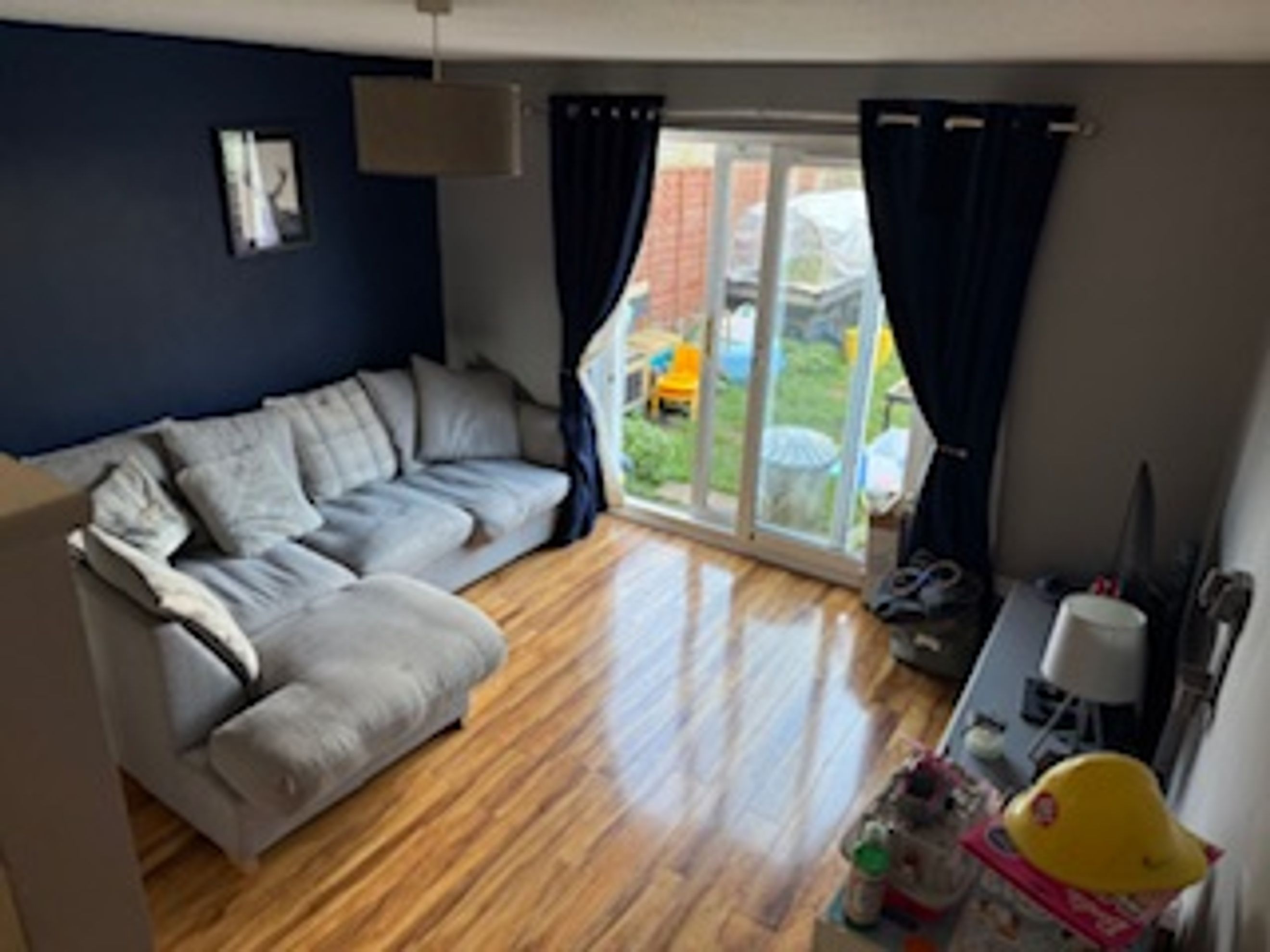 The property features a kitchen equipped with an integrated fridge freezer, oven, hob, and extractor fan. The living room opens directly onto the private rear garden through patio doors, creating a bright and airy space and easy access to outdoor living. A family bathroom serves the home, and parking is available.