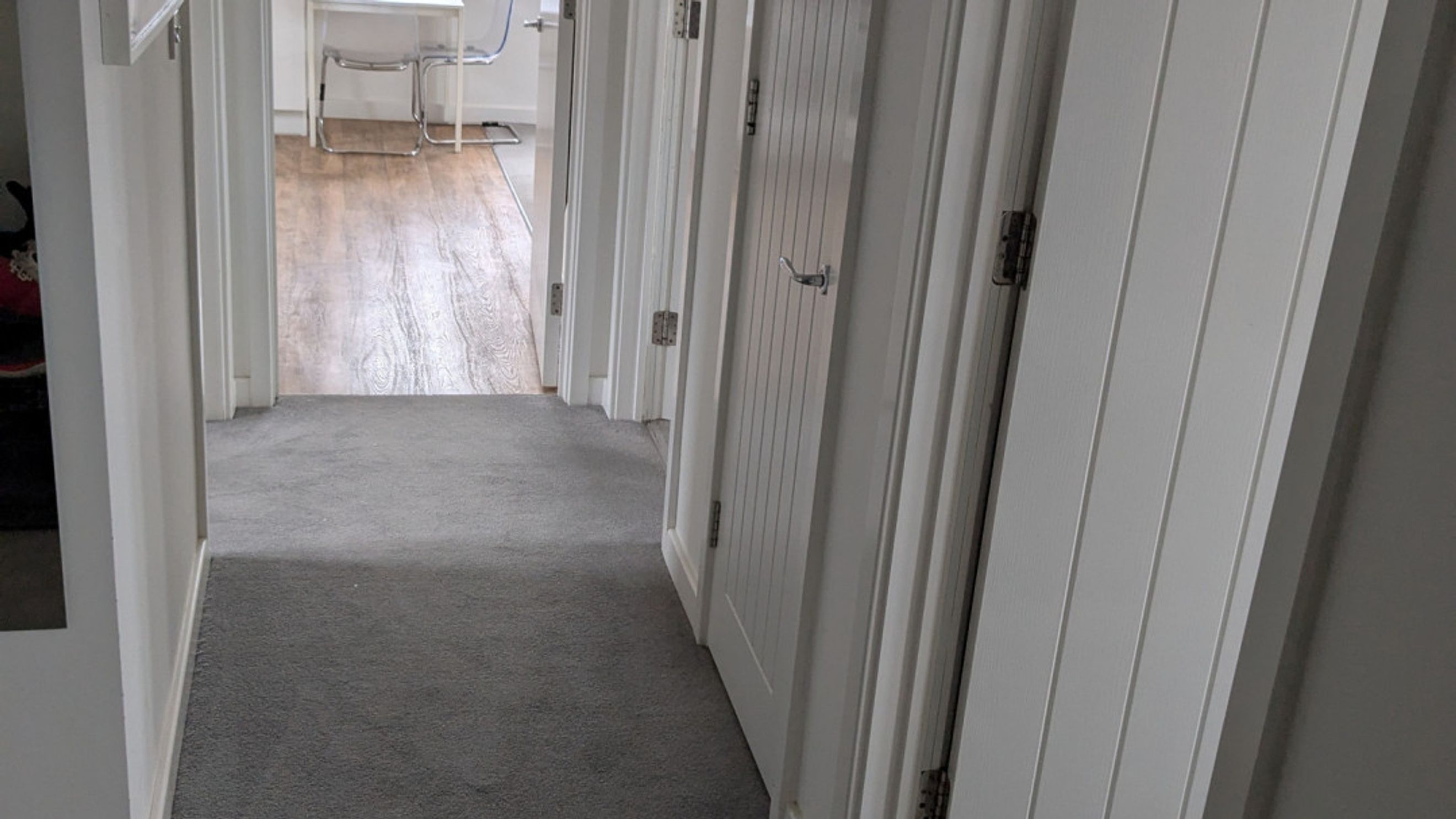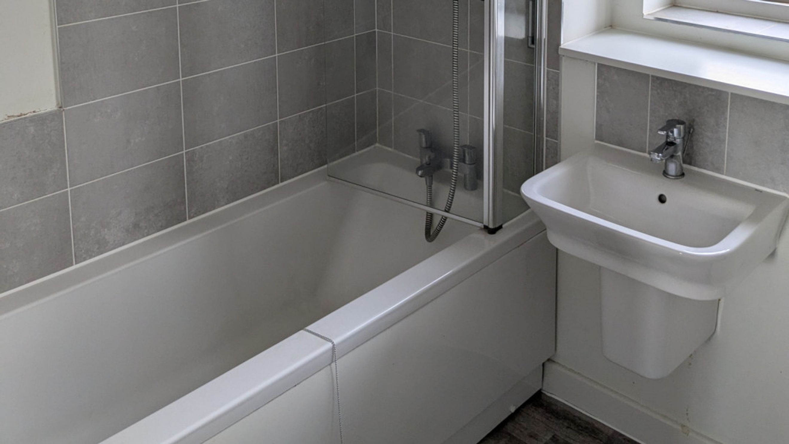 Both bedrooms are generously proportioned and continue the modern grey carpet theme, enhancing the cohesive feel of the home. The bathroom is sleek and partially tiled with attractive grey tiles, adding a touch of luxury to the space.