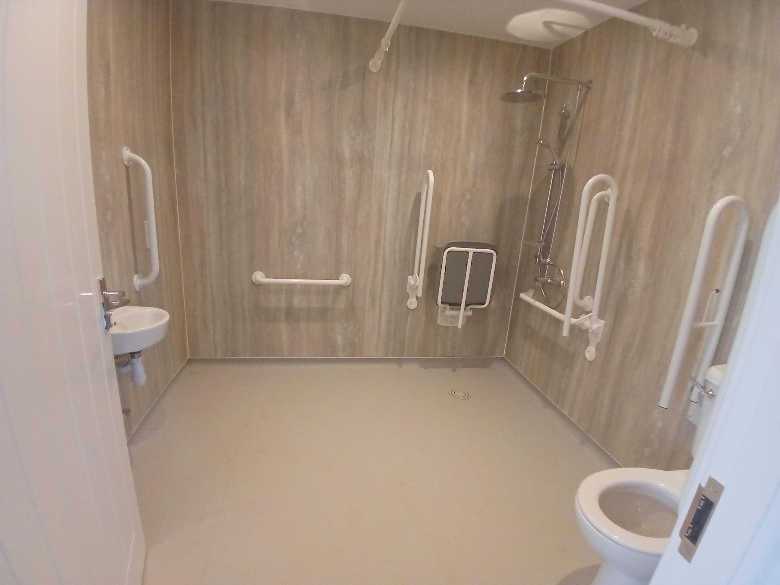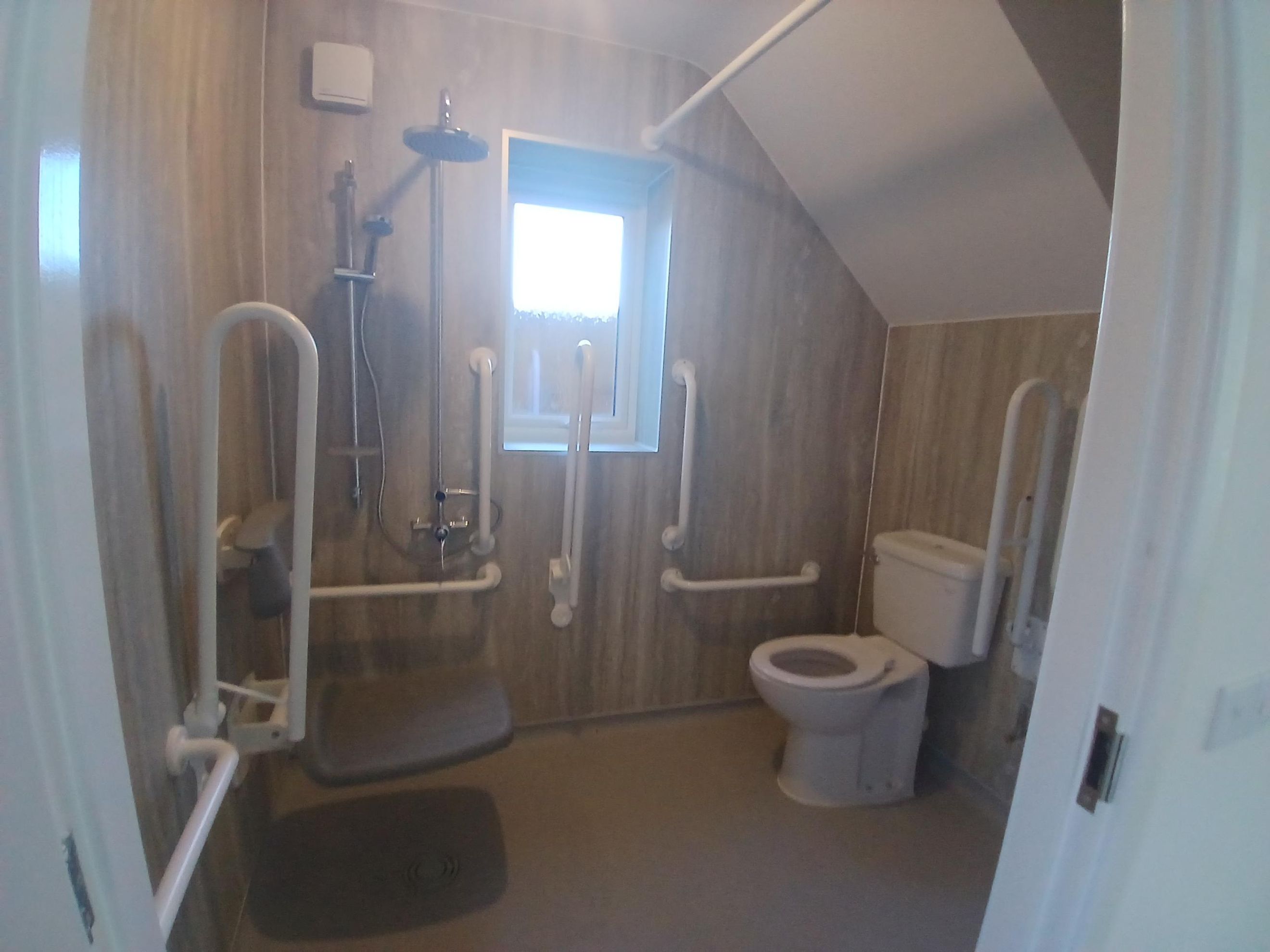 Downstairs has vinyl flooring from the living space through to the kitchen. The WC has special non slip flooring and wet room with chrome shower, shower chair, raised toilet, sink and support rails.
