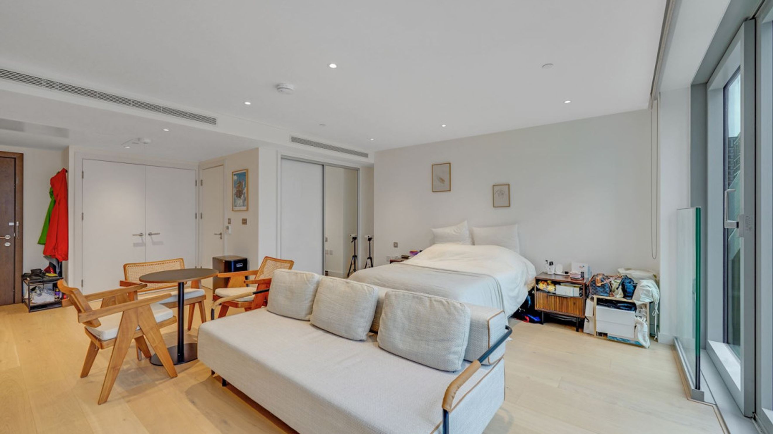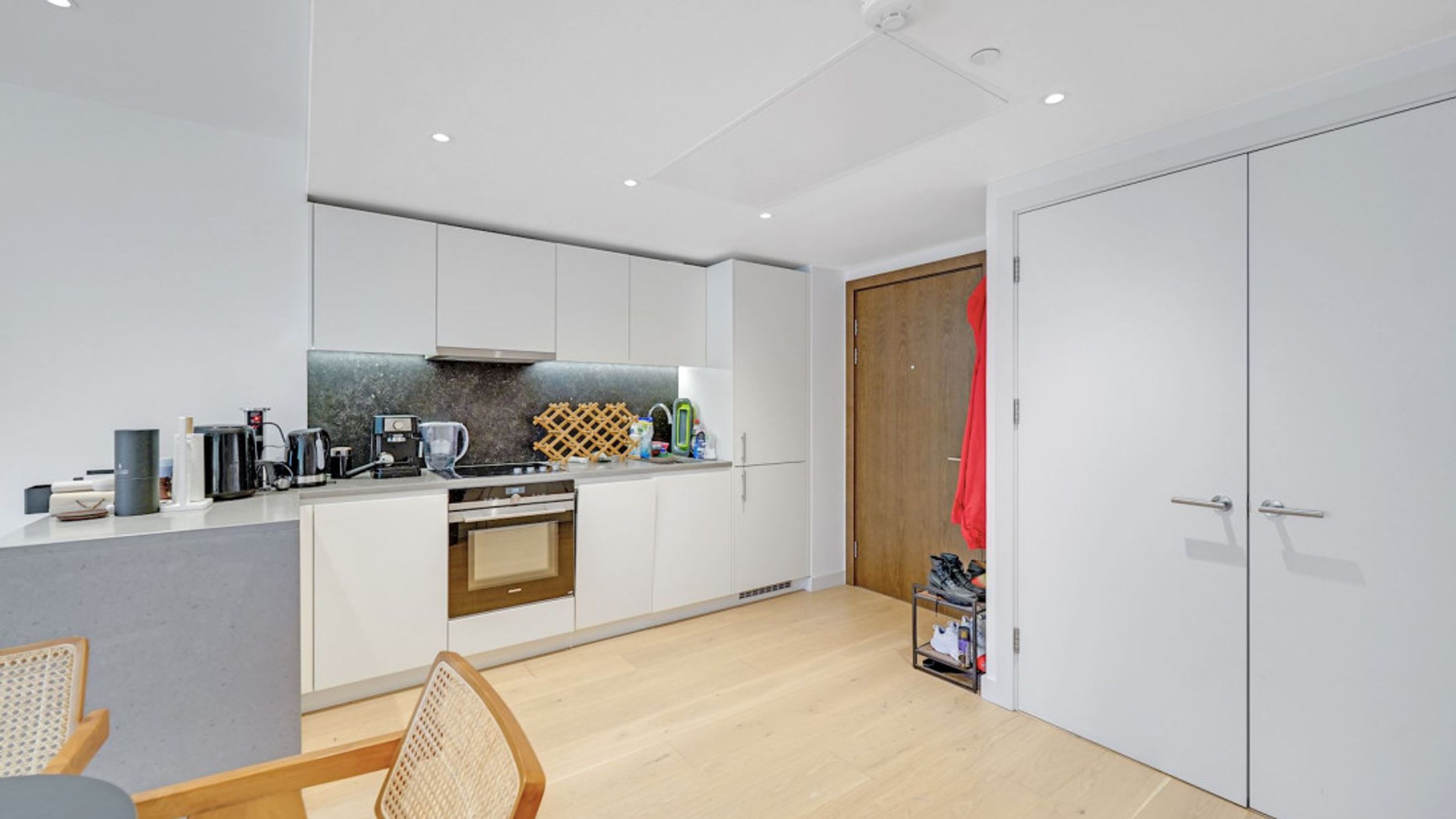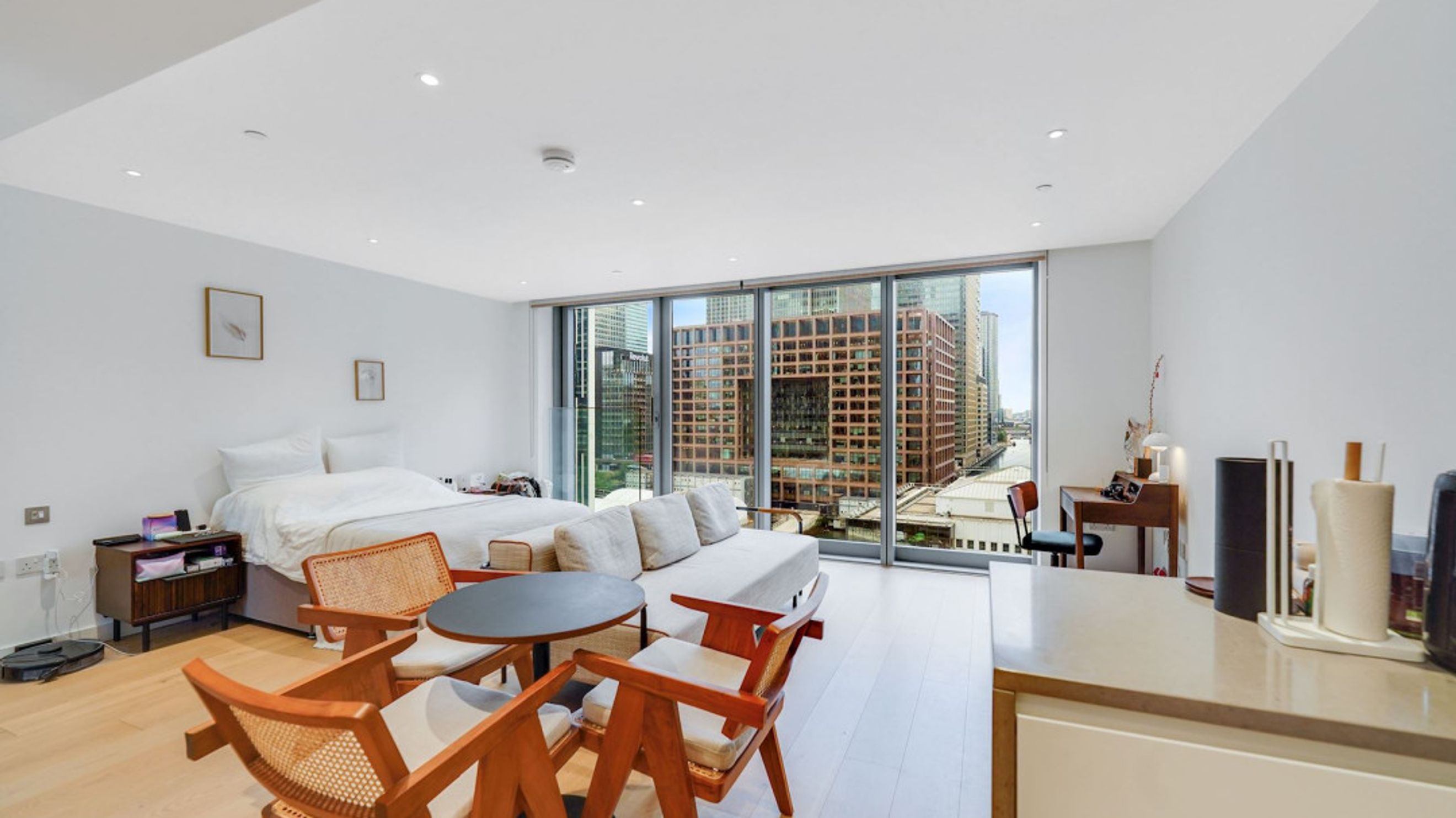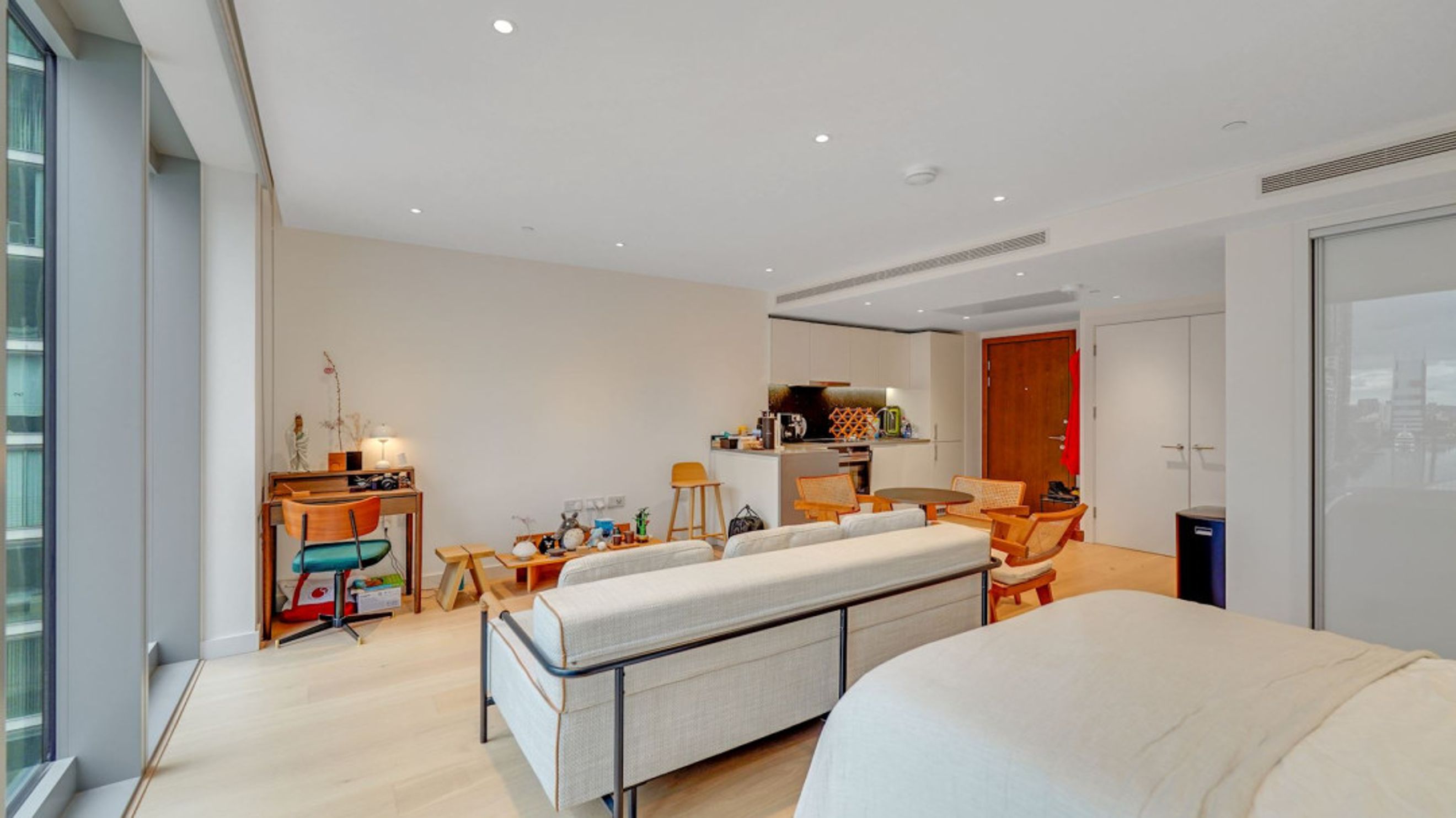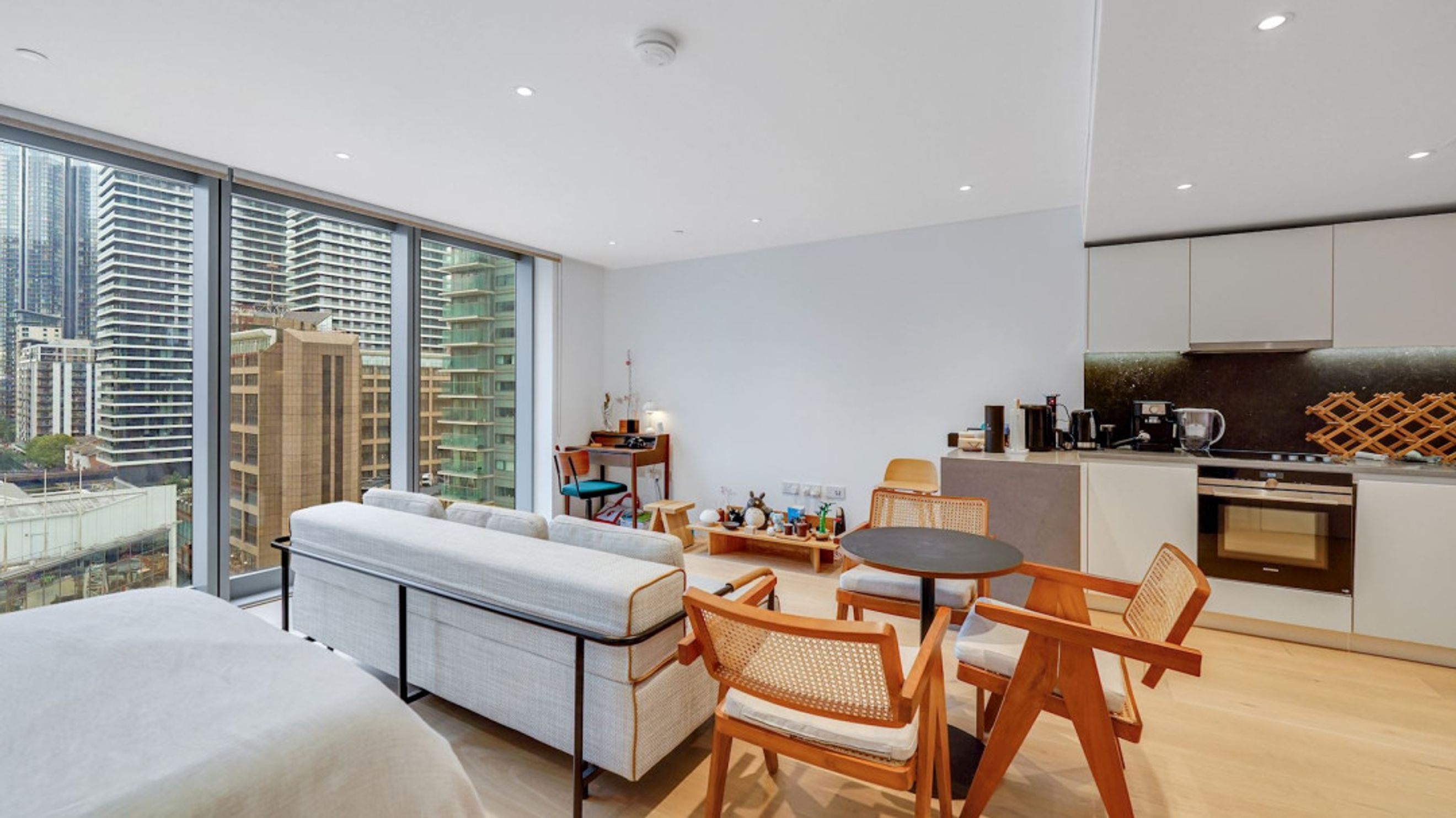 Step inside to an open-plan layout flooded with amazing natural lighting from floor-to-ceiling windows and a Juliet balcony, where the city's vibrant energy feels both intimate and expansive. The space seamlessly integrates a sleek, handleless kitchen with integrated appliances, a comfortable sleeping area, and a stylish dining zone, all finished with engineered oak flooring and recessed LED spotlights for a warm, inviting glow. The contemporary bathroom features a rainfall shower, underfloor heating, and chic porcelain tiles, ensuring everyday luxury.