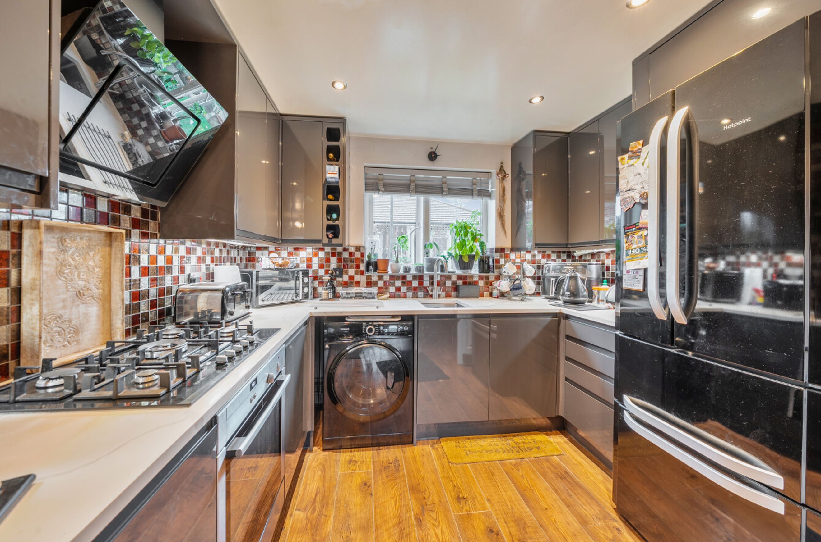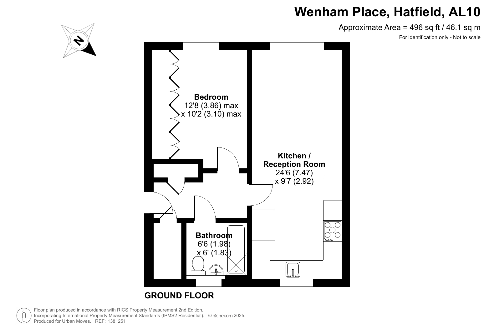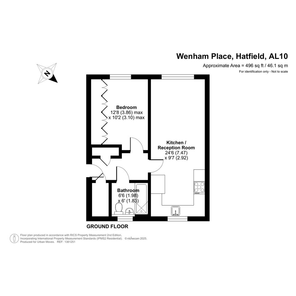 A well-presented, one-bedroom flat on the ground floor of a modern development. The property has a twenty-four-foot main room with a large, south-west-facing window at one end and an attractive, open-plan kitchen, with sleek, handle-less units and five-burner hob, at the other. The bedroom includes a bank of fitted wardrobes, there are a pair of built-in storage/utility cupboards in the entrance hallway and the bathroom is stylish and naturally lit. Well insulated walls, double glazing and gas central heating make for a good energy-efficiency rating. The flat comes with an allocated parking space and use of the communal rear garden. Hatfield town centre is just minutes away and the railway station is also within comfortable walking distance.