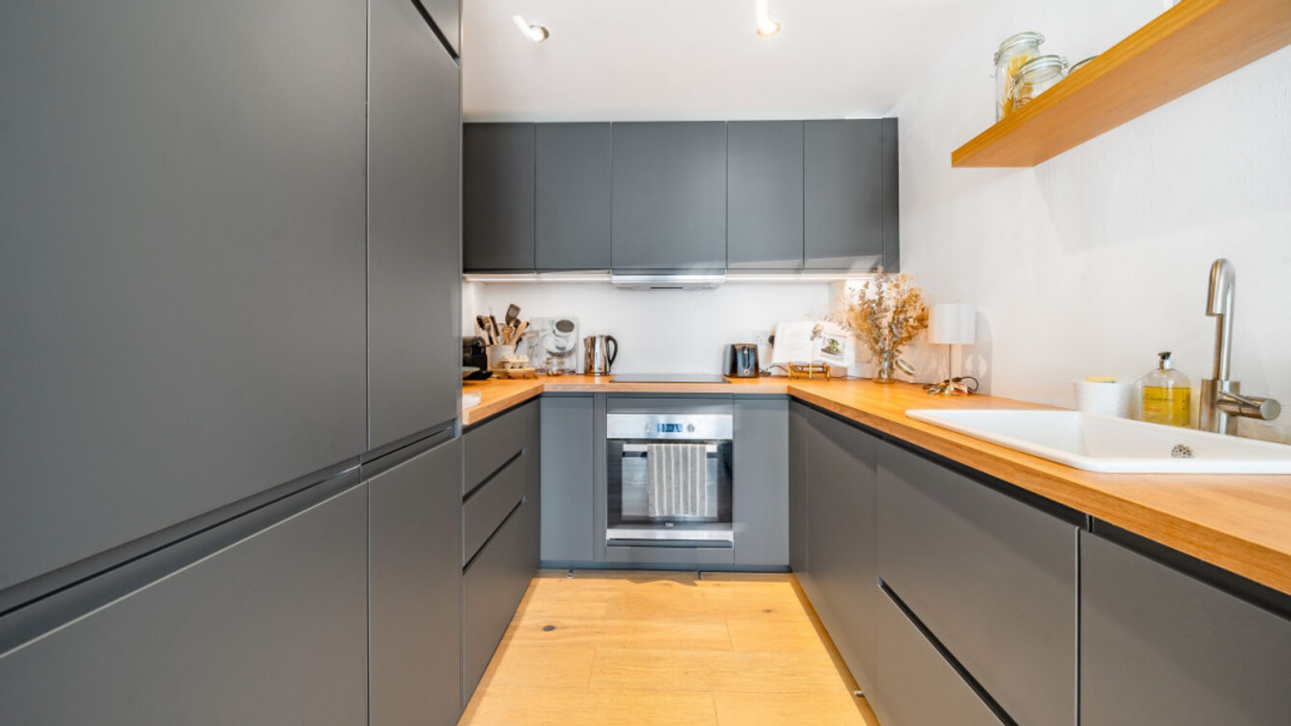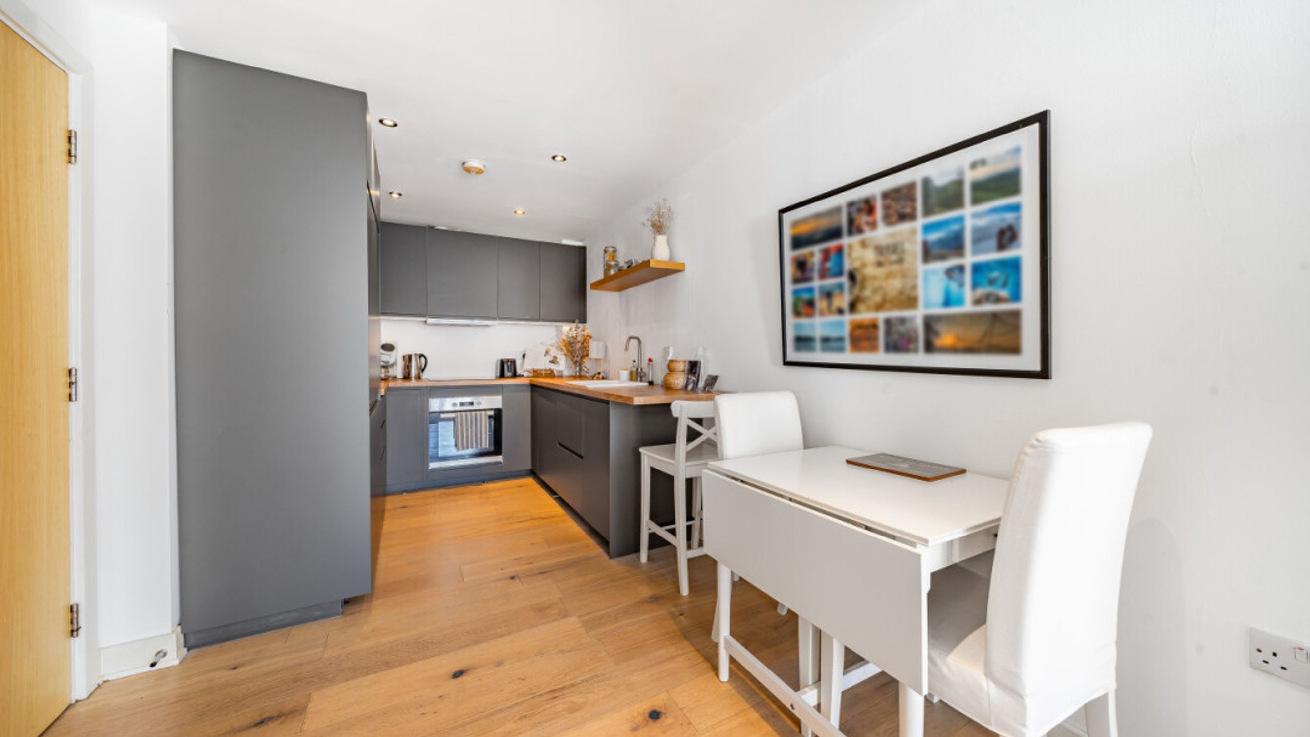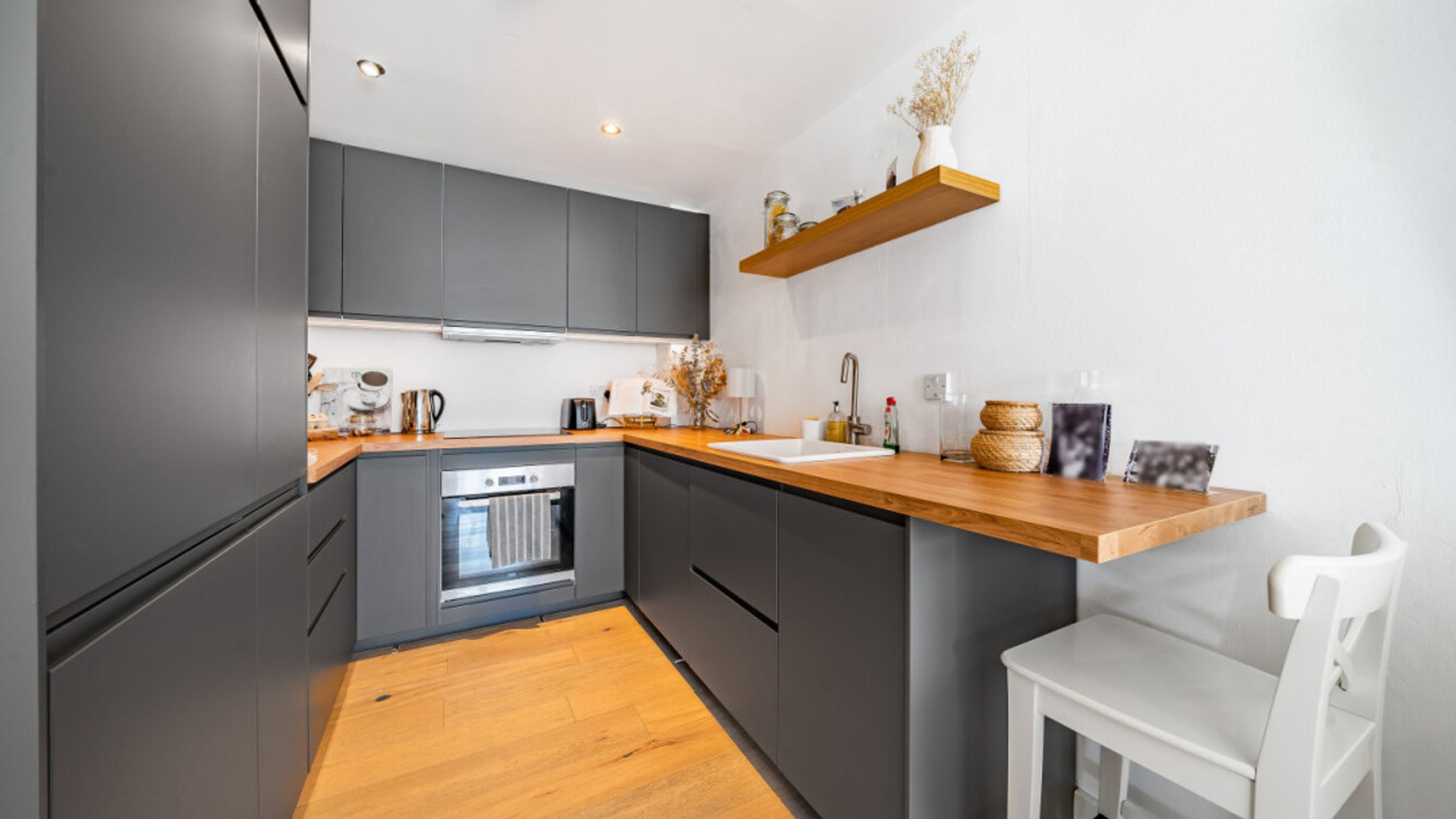 This bright and spacious one bedroom apartment consists of a stylish open-plan kitchen and living area, flooded with natural light. The kitchen is fitted with matt grey wall and base units, white wood effect worktop. The kitchen also benefits from integrated appliances including a fridge freezer, oven, hob and extractor fan. Spacious main double bedroom benefiting from built-in storage cupboards. The bathroom comes complete with a white three-piece suite with a shower over bath. Consists of modern white tiled and mosaic detail bordering. Stylish wooden flooring throughout the property expect for the bathroom.