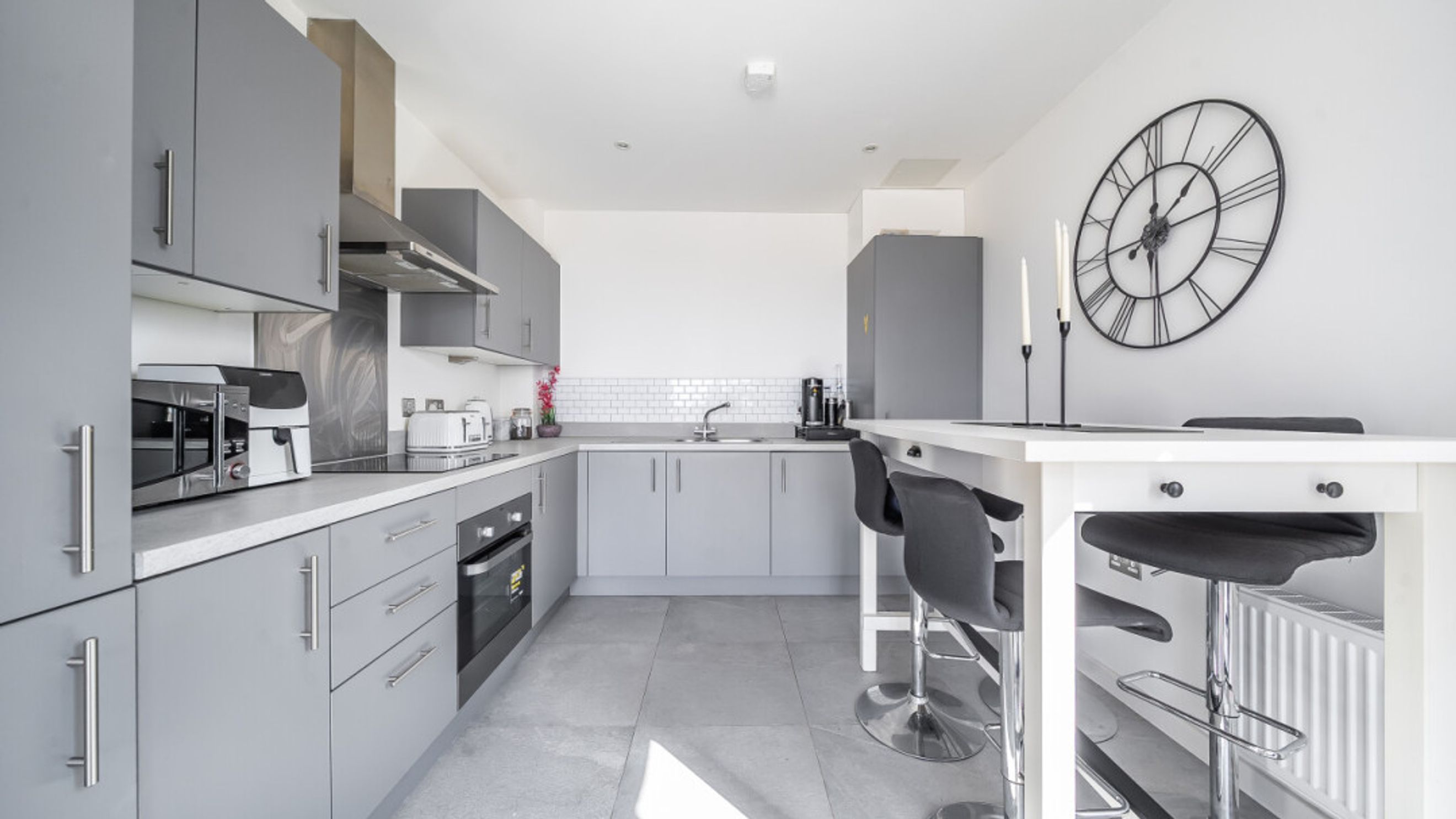 - Integrated appliances: fridge, induction hob, oven, washing machine
