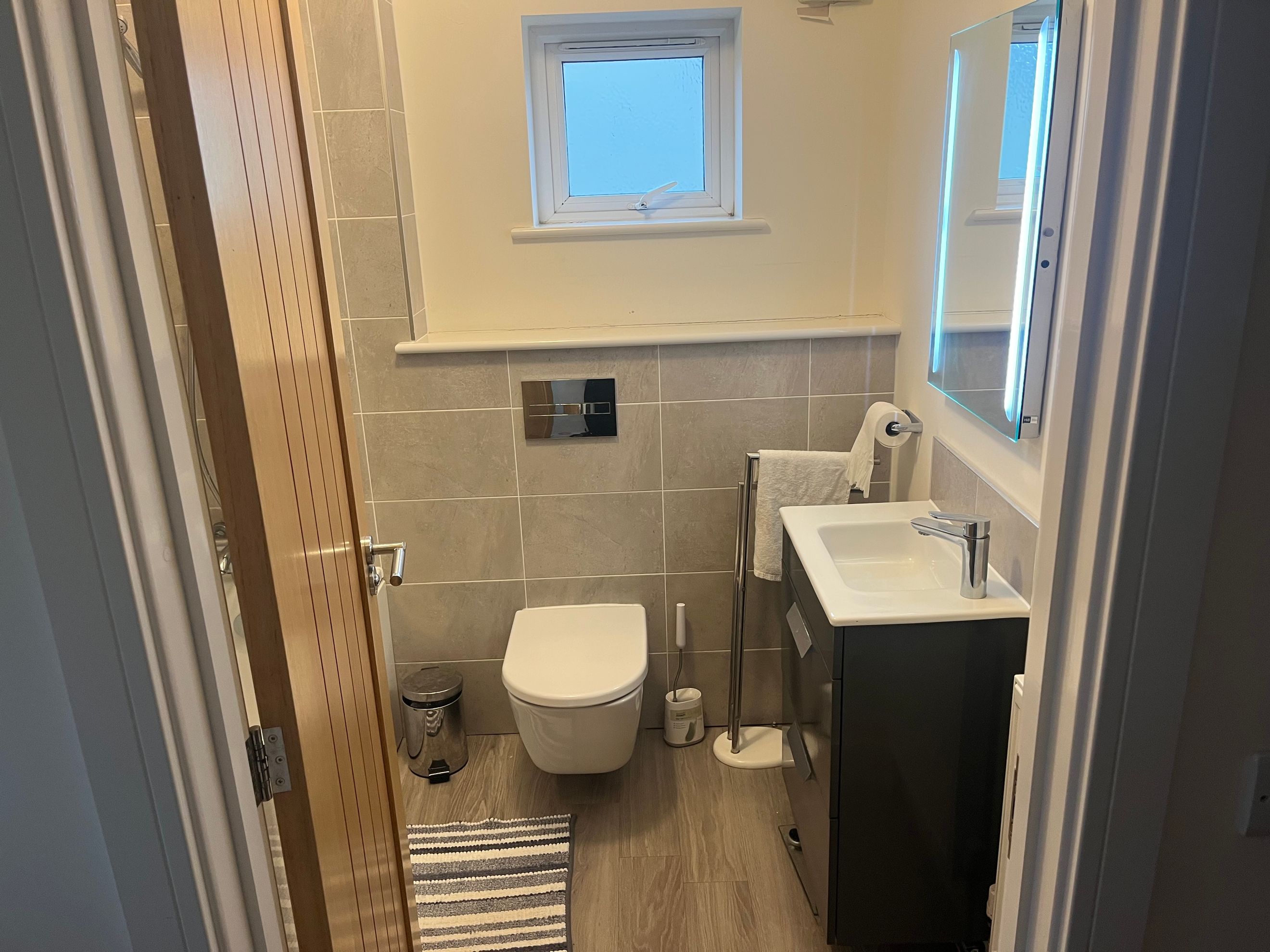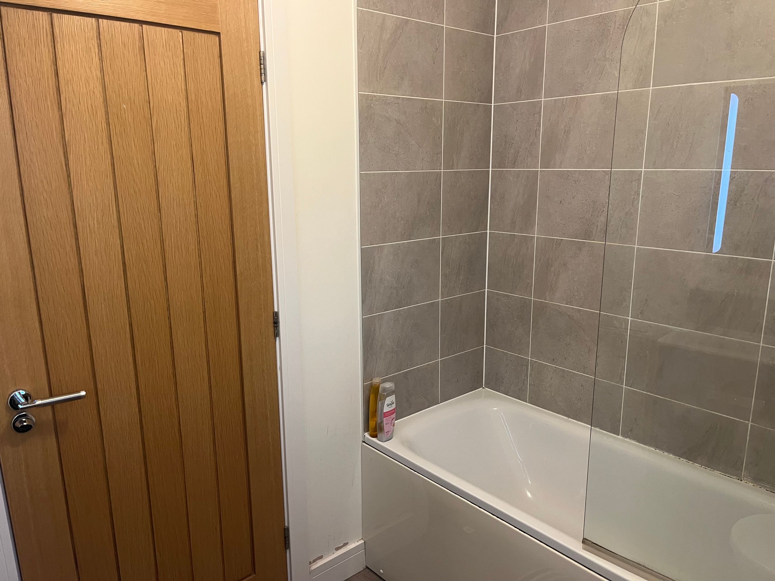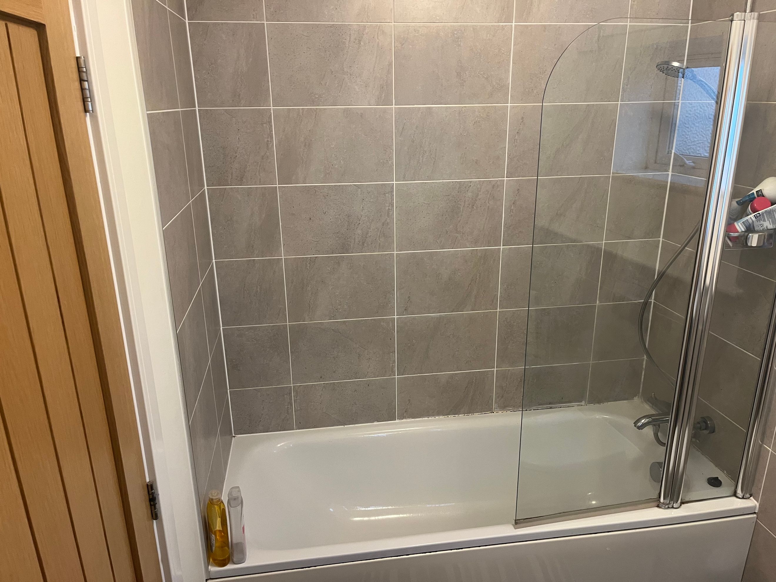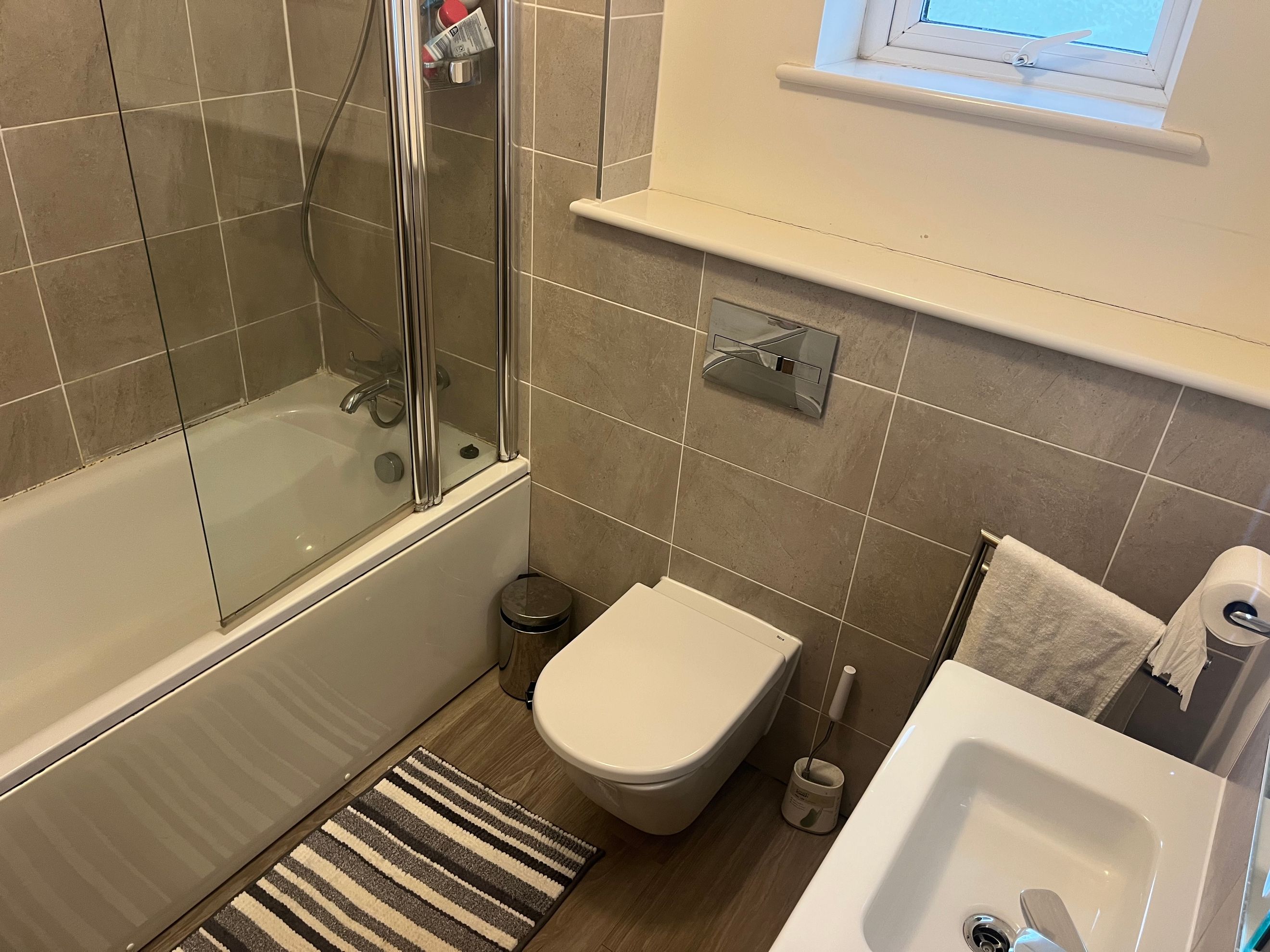Family Bathroom comprising of a modern white suite, with hidden cistern WC and modern grey tiling. A glass shower screen and shower over the bath complete this room.