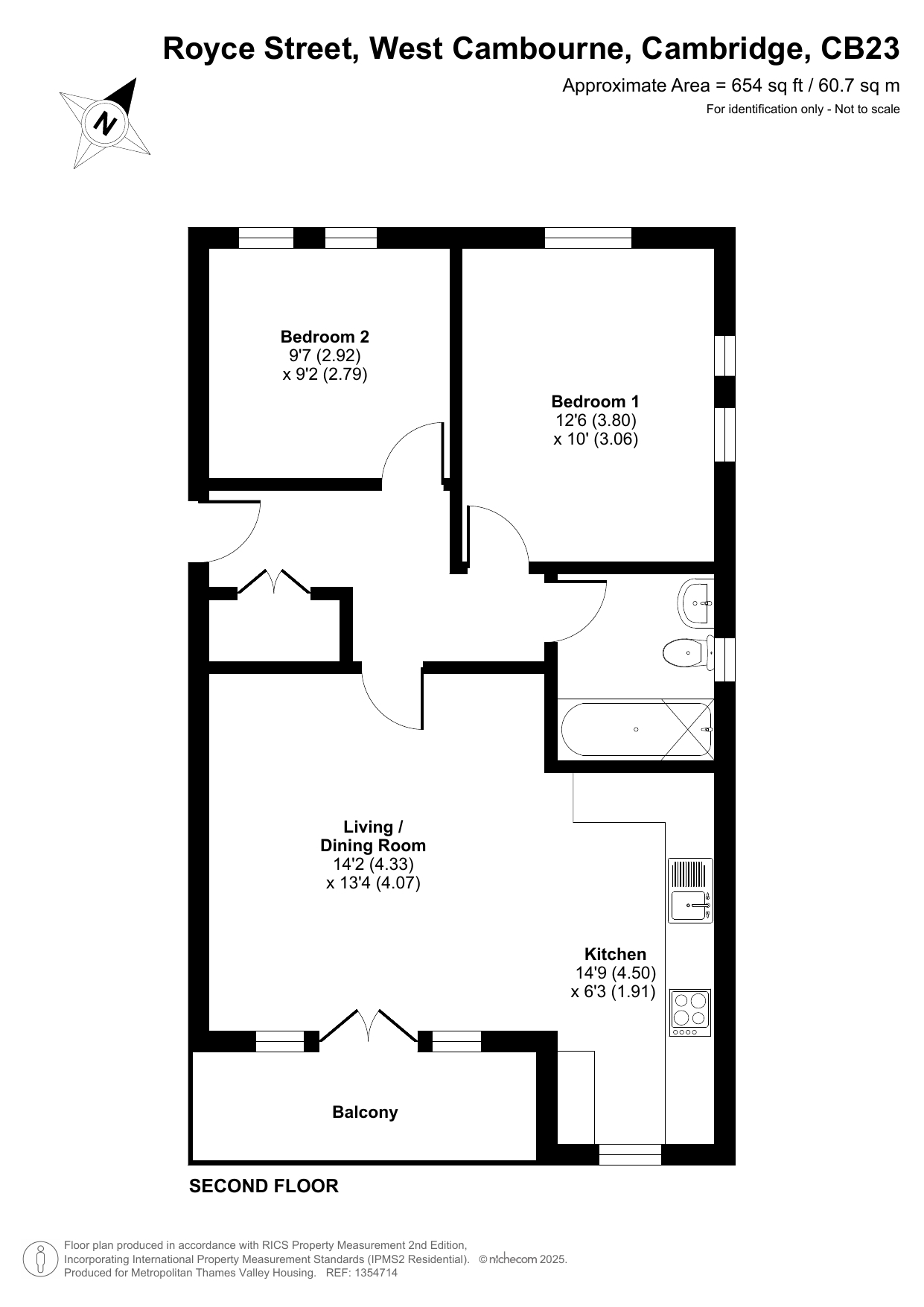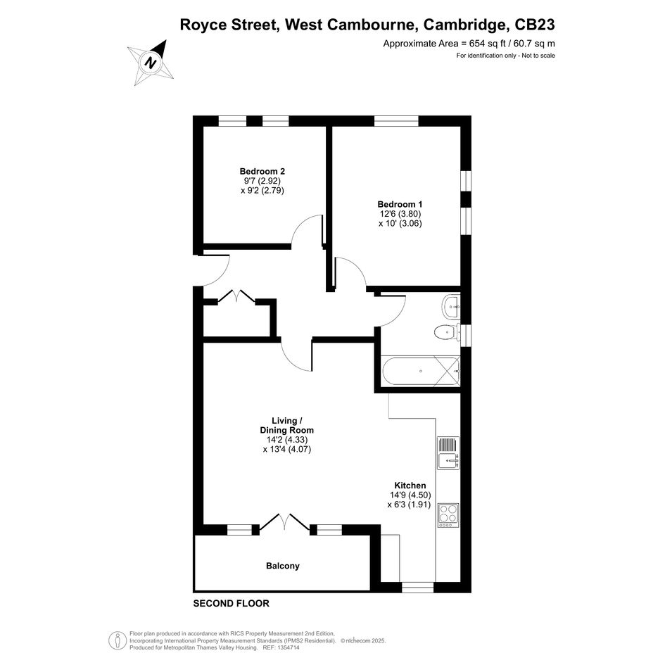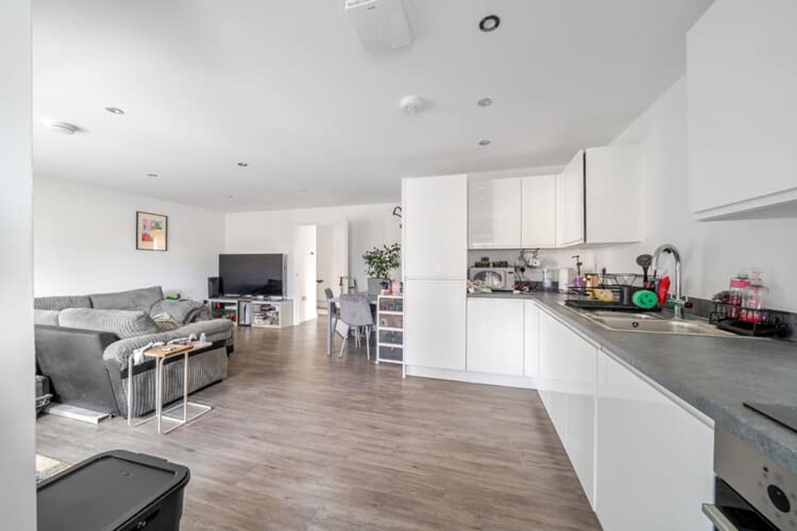 The property on the second floor comprises an entrance hall with storage, a spacious living room with a modern, open-plan kitchen, two good-sized bedrooms, and a bathroom.
