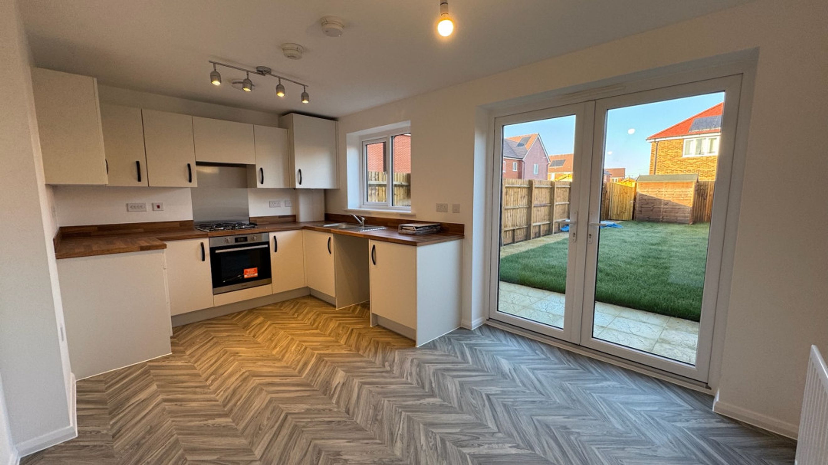Located at the rear of the home, the kitchen features a range of stylish base and wall units, an integral oven and hob, an extractor fan, and a sleek stainless steel sink and drainer. There's ample space for your fridge/freezer and washer/dryer. This bright space also benefits from patio doors opening onto the private rear garden.