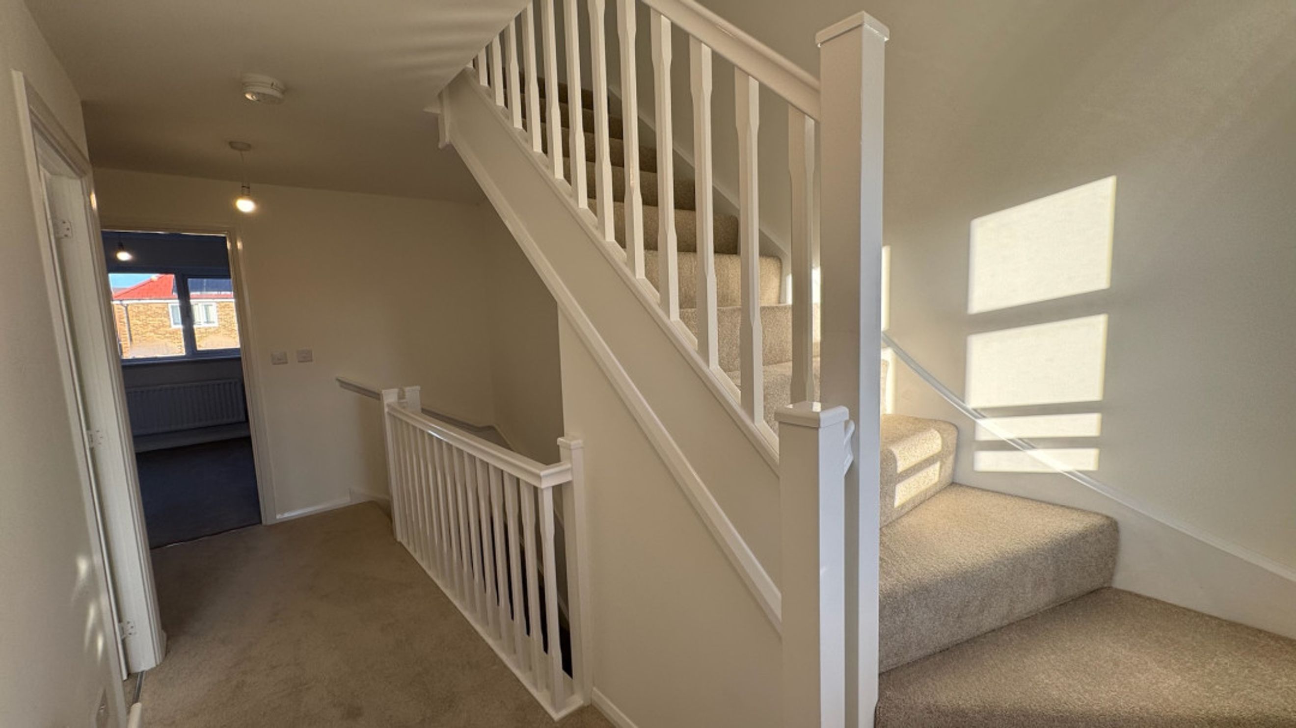 Upstairs, the first-floor landing leads to one generous double bedroom, a spacious single room, a modern bathroom, and the staircase to the second floor.