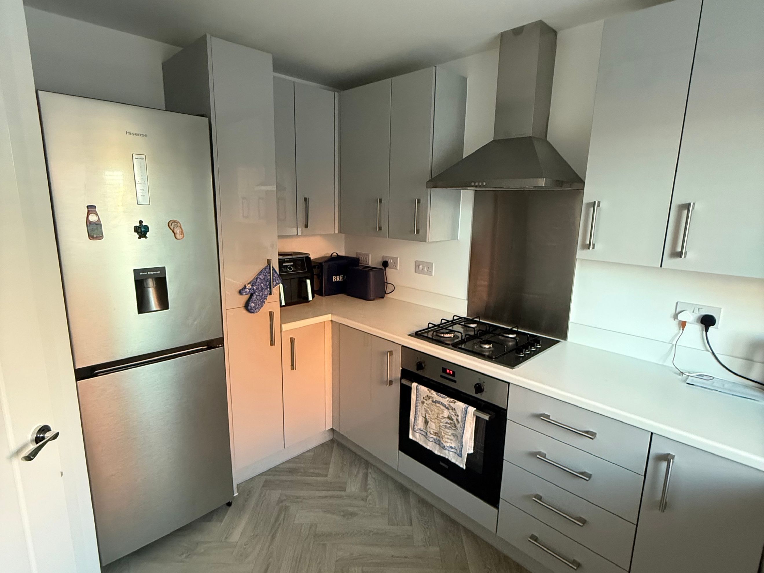 Modern front-aspect kitchen, fitted with contemporary units and integrated hob, cooker, and hood.