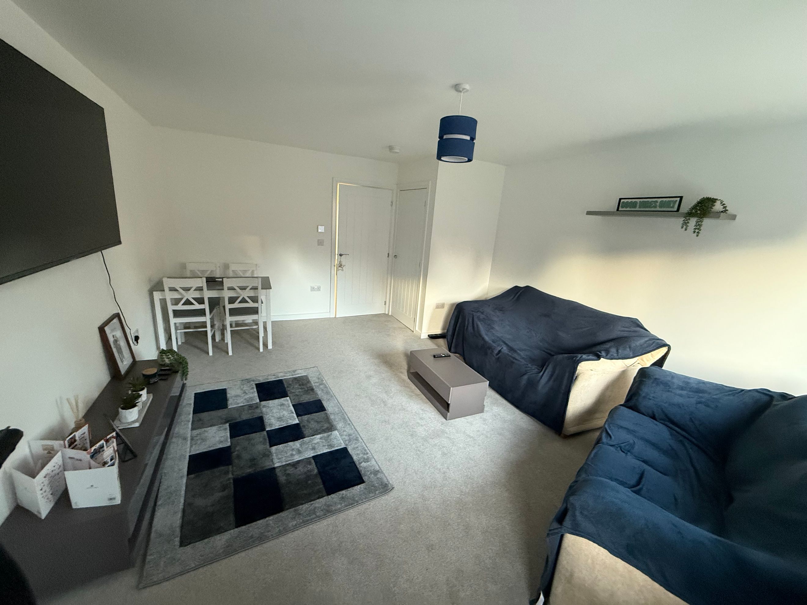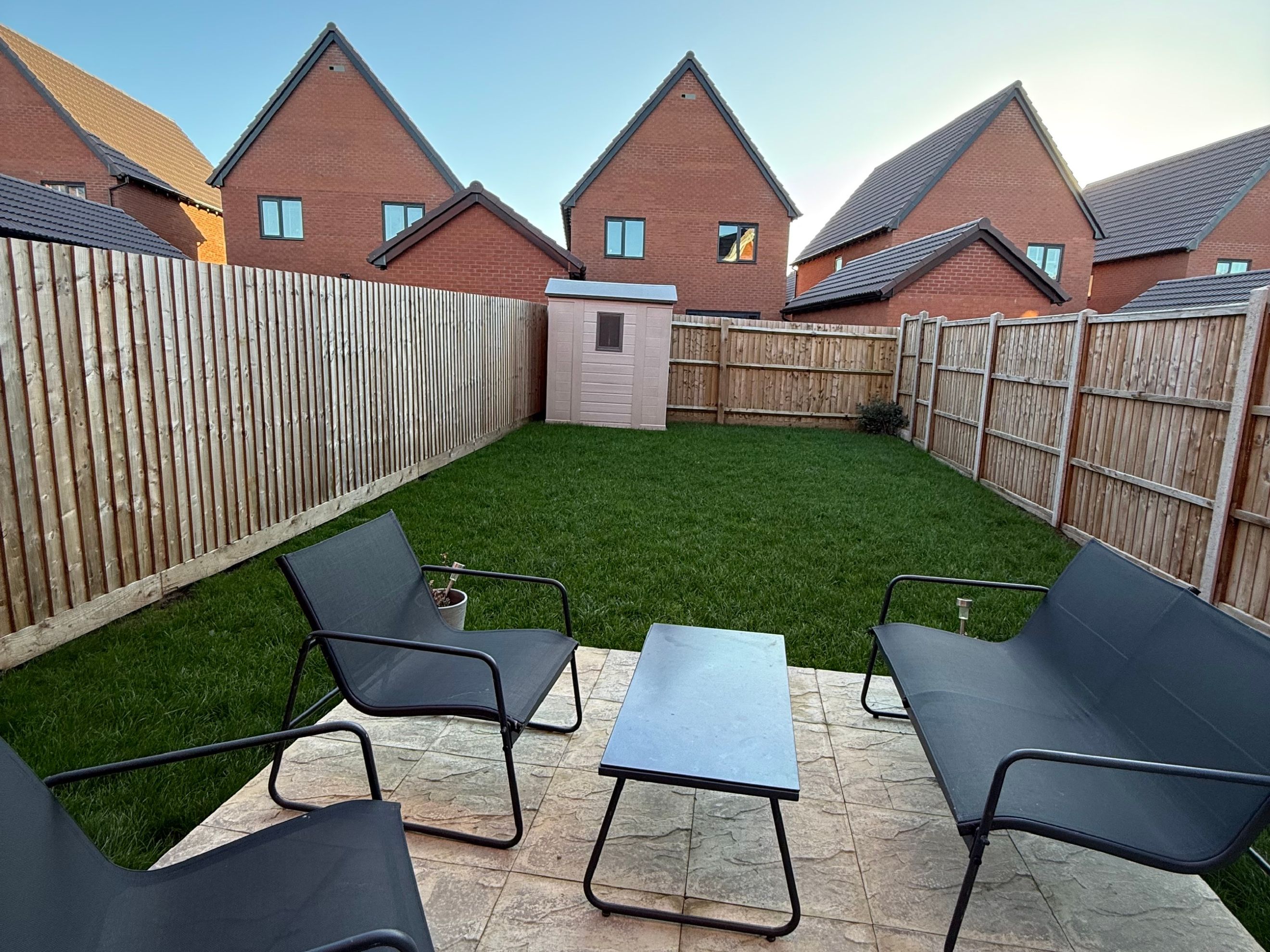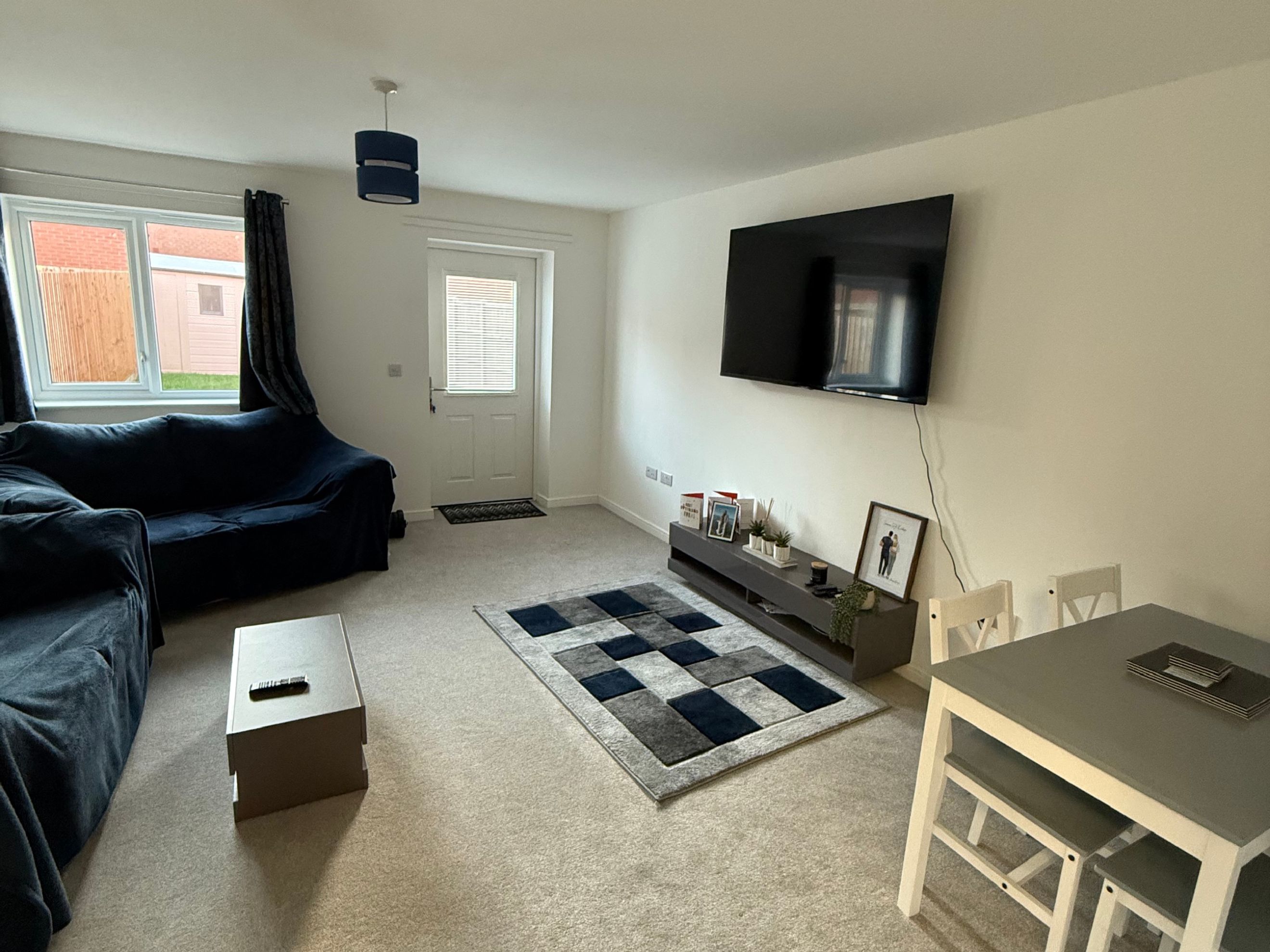 A spacious lounge/diner positioned at the rear of the home, offering ample space for relaxation and dining. A glazed door opens onto the enclosed, low-maintenance rear south facing garden—perfect for outdoor seating or play space