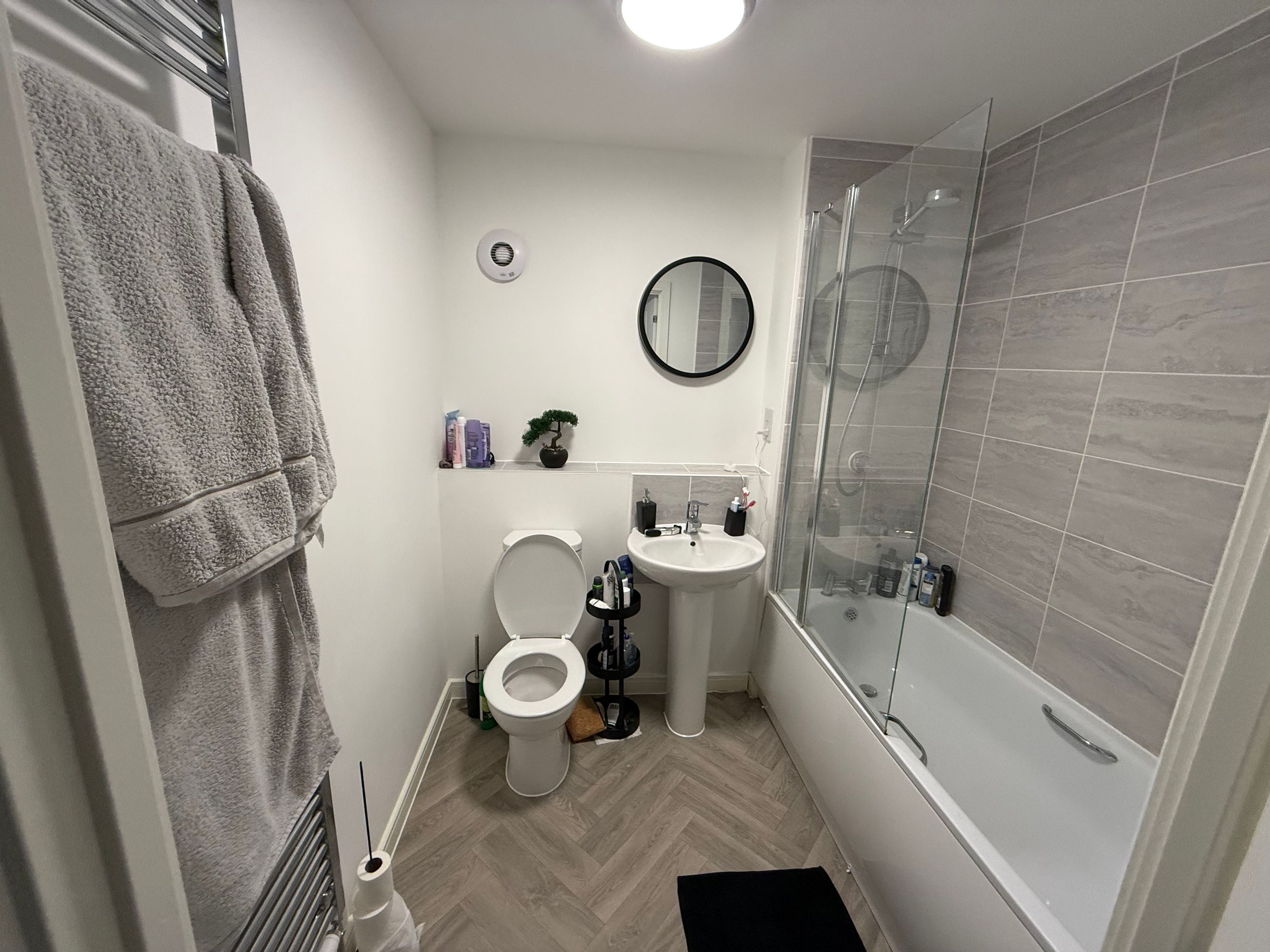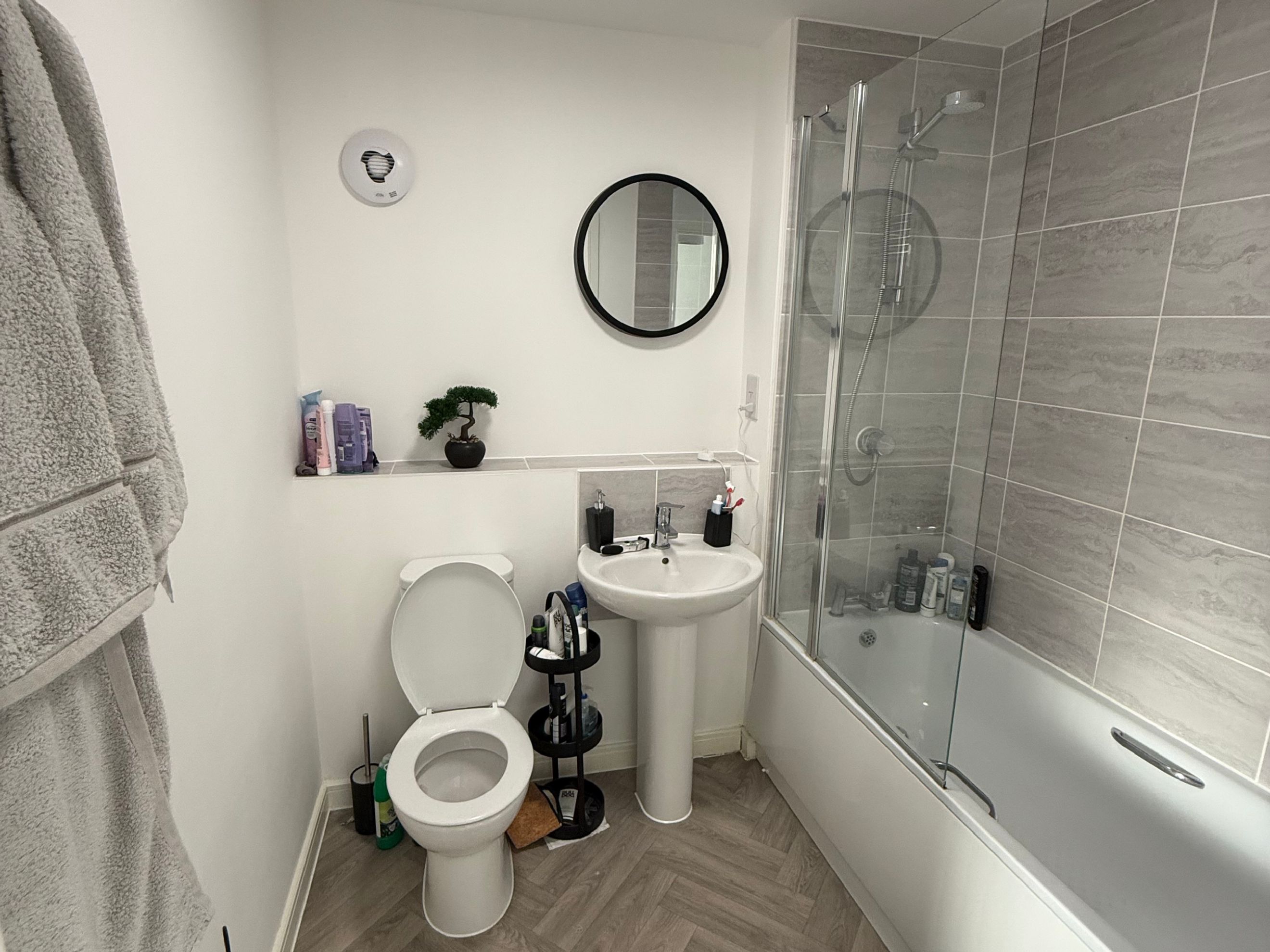 Family bathroom featuring a shower over the bath.