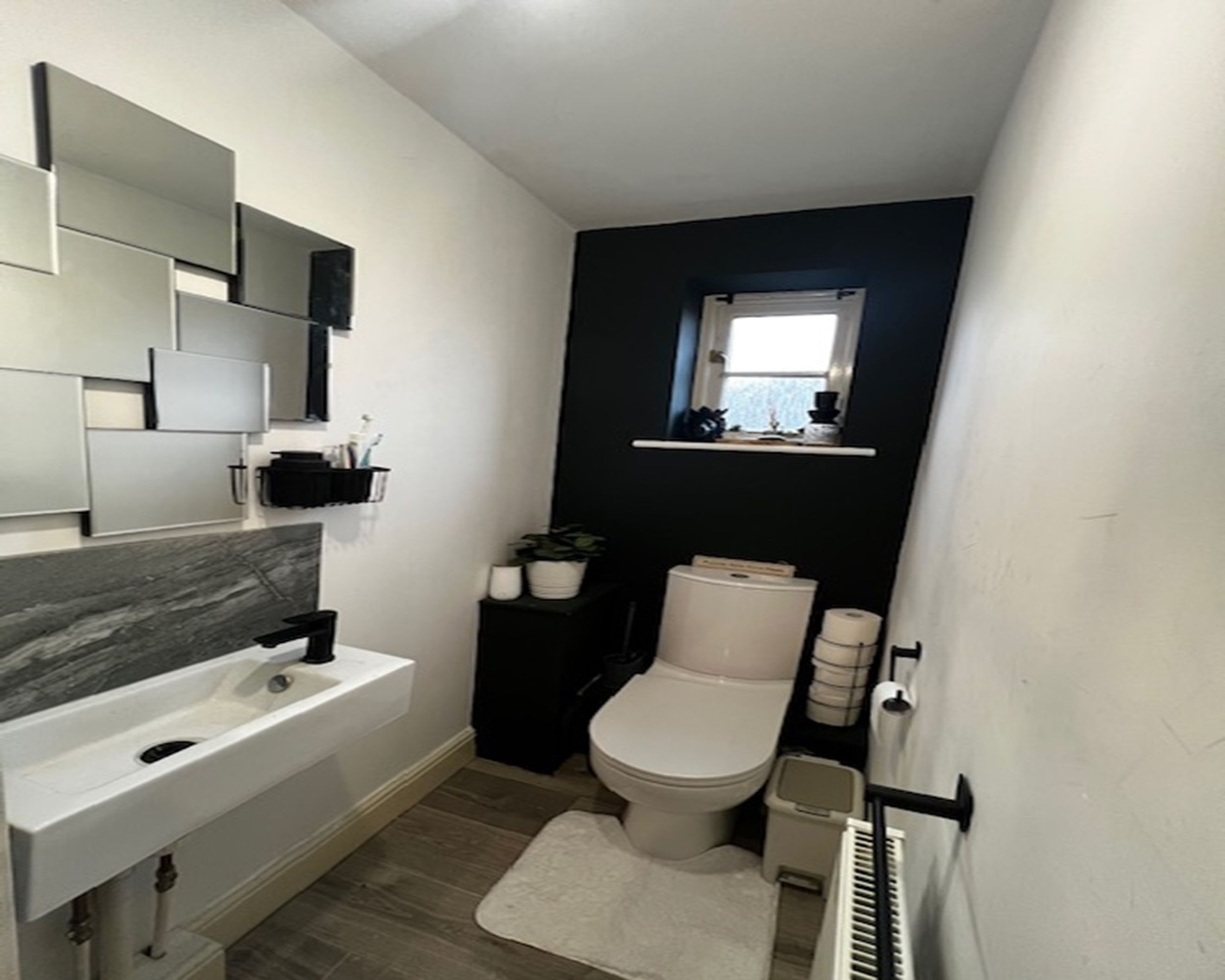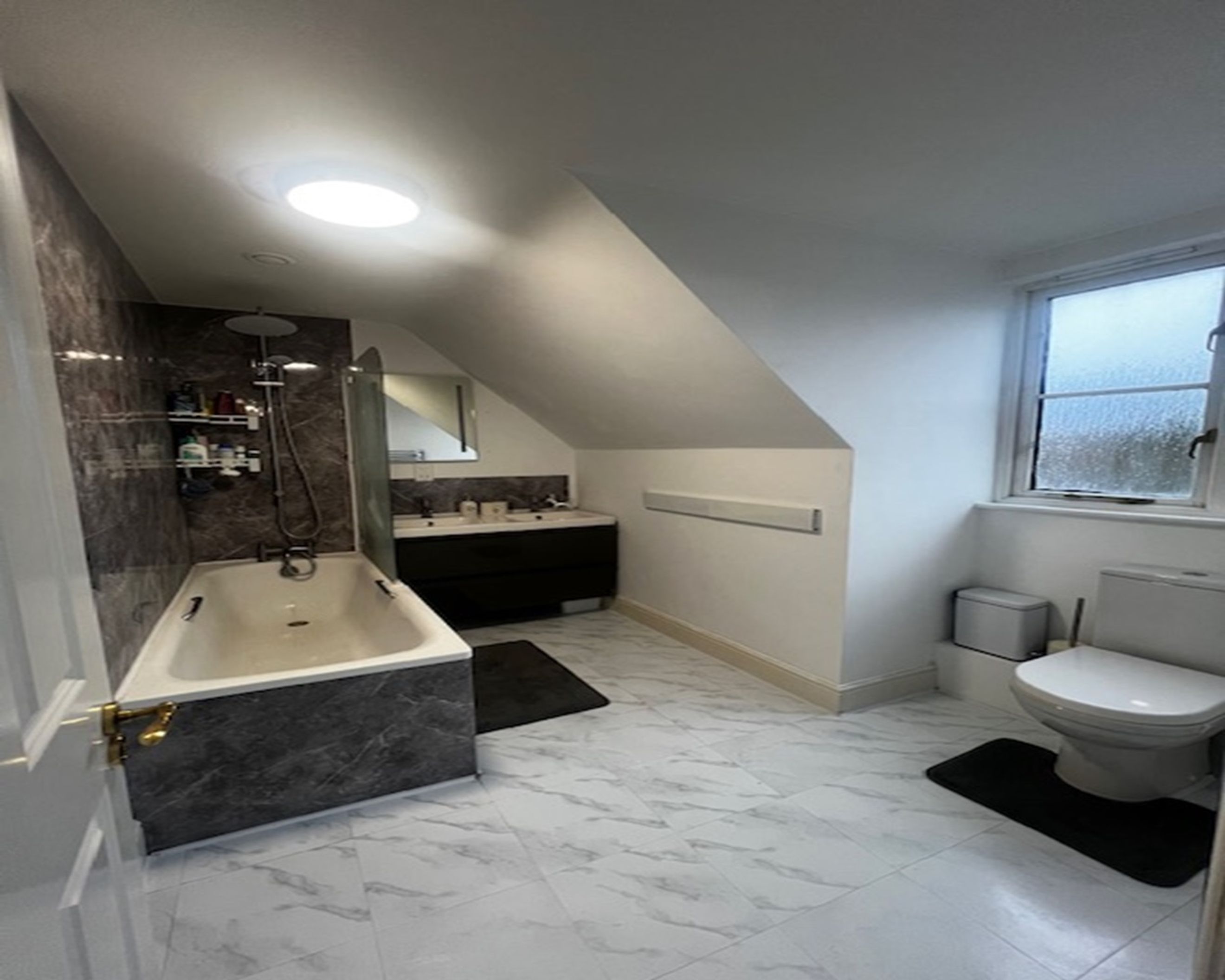 Upstairs, the large updated bathroom features a wall-hung double sink vanity, complemented by a sleek downstairs W.C.