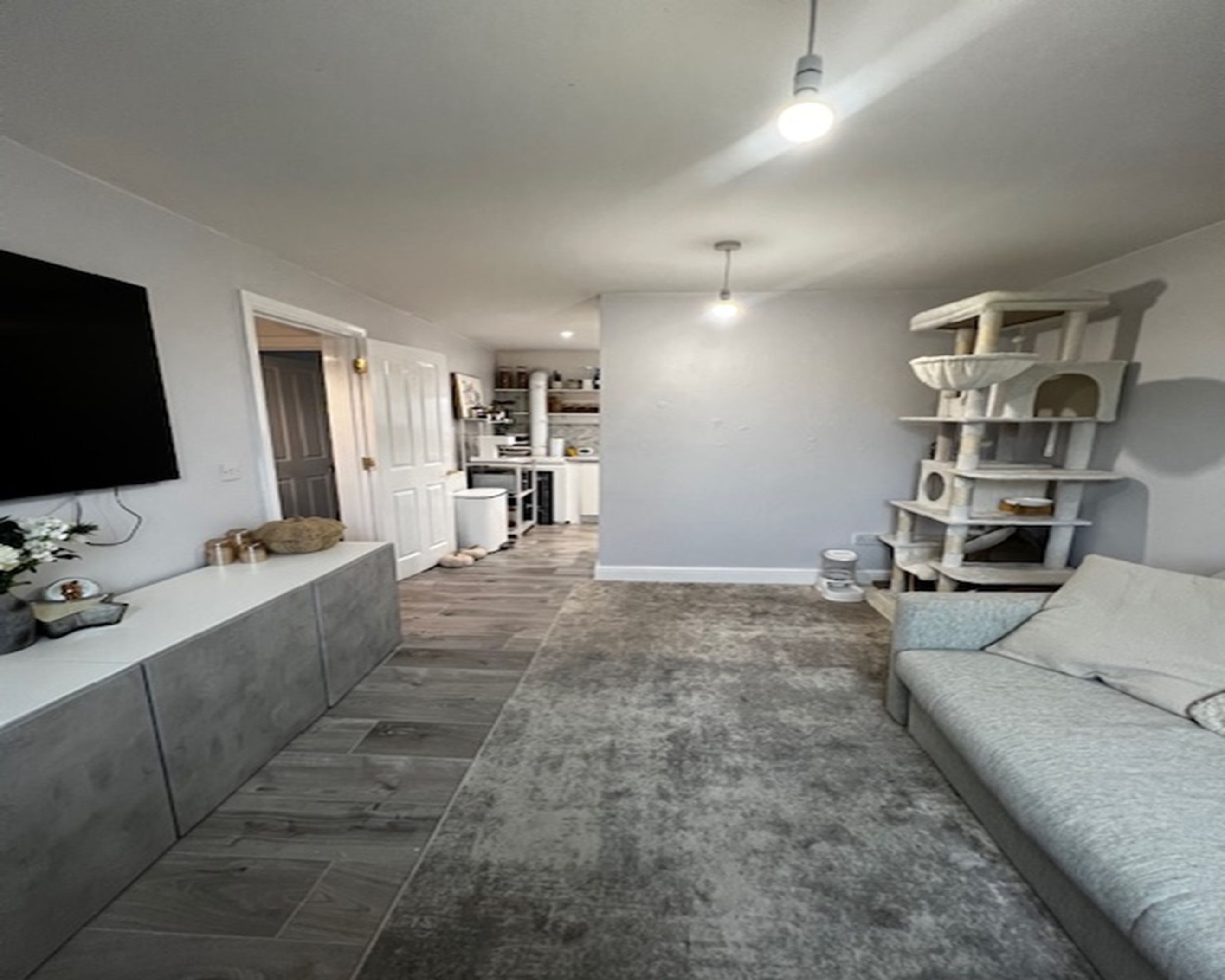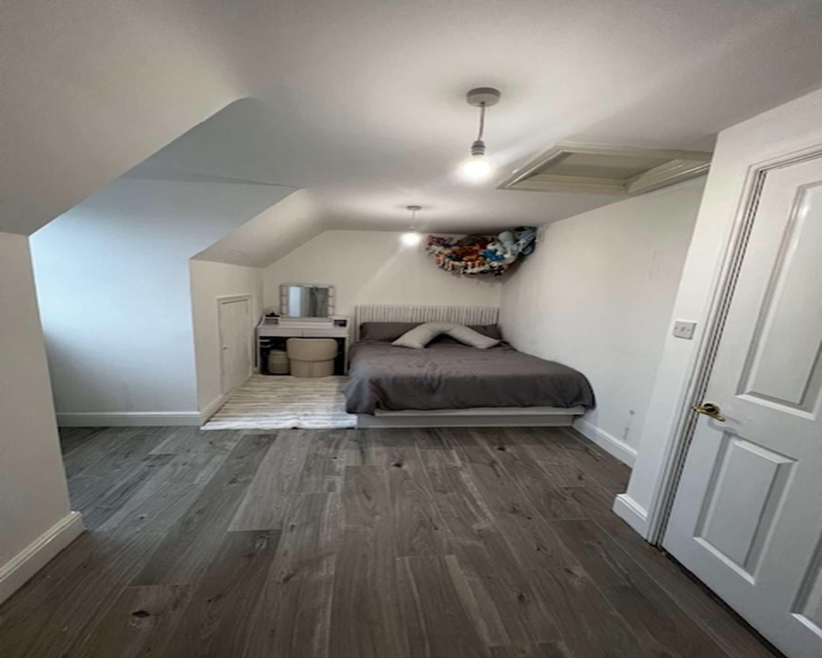 Hard flooring runs throughout the ground level, with a carpeted staircase leading to the bright dormer-window bedroom.