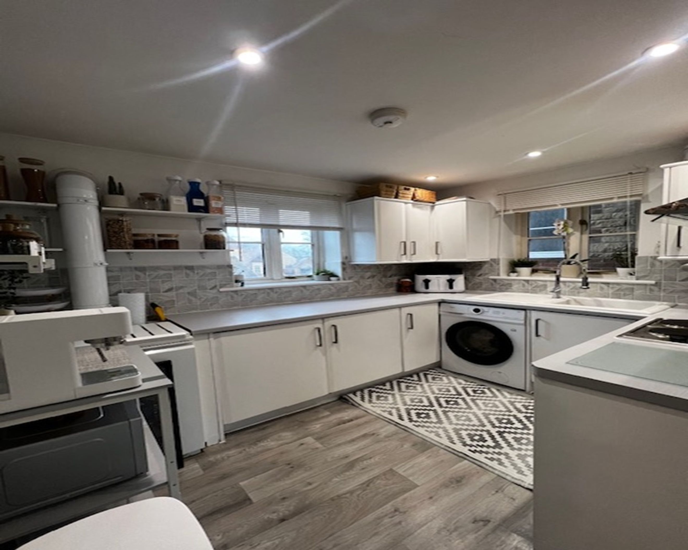 The modern kitchen includes integrated appliances plus a fridge and freezer.