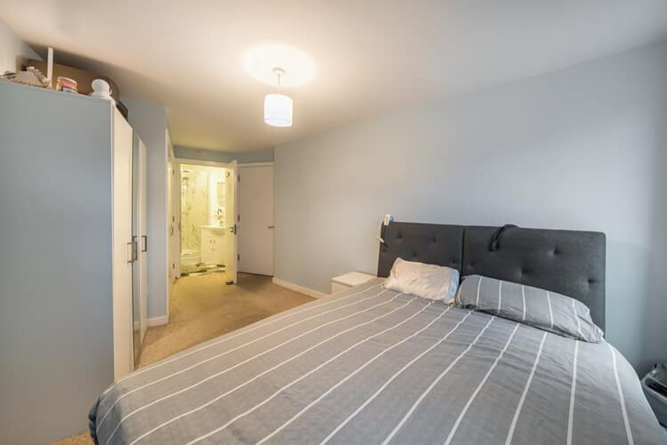 The property on the fourth floor comprises an entrance hall with storage cupboards, a spacious living room, with a fitted kitchen, two good sized bedrooms (one en-suite) and a bathroom.
