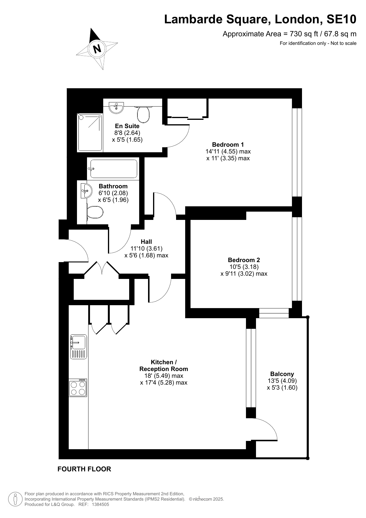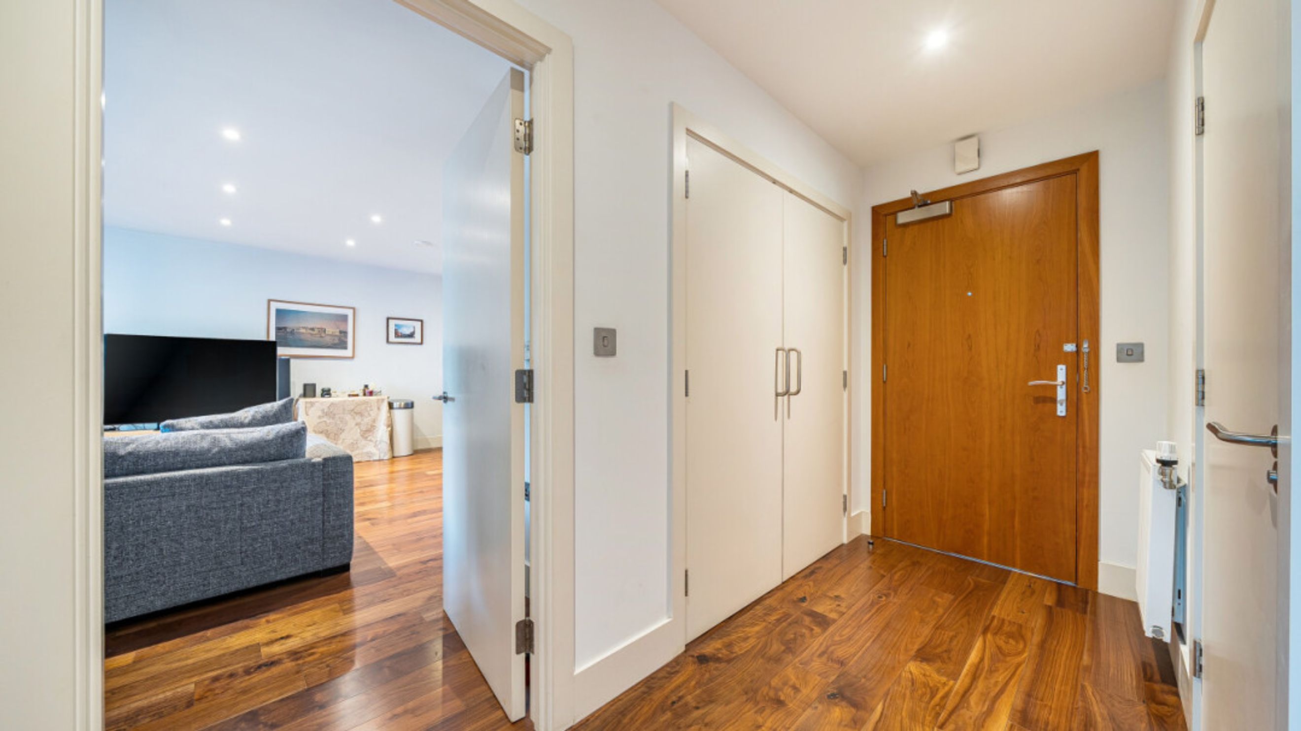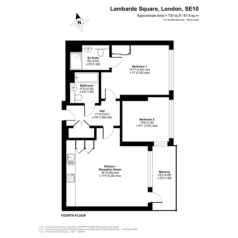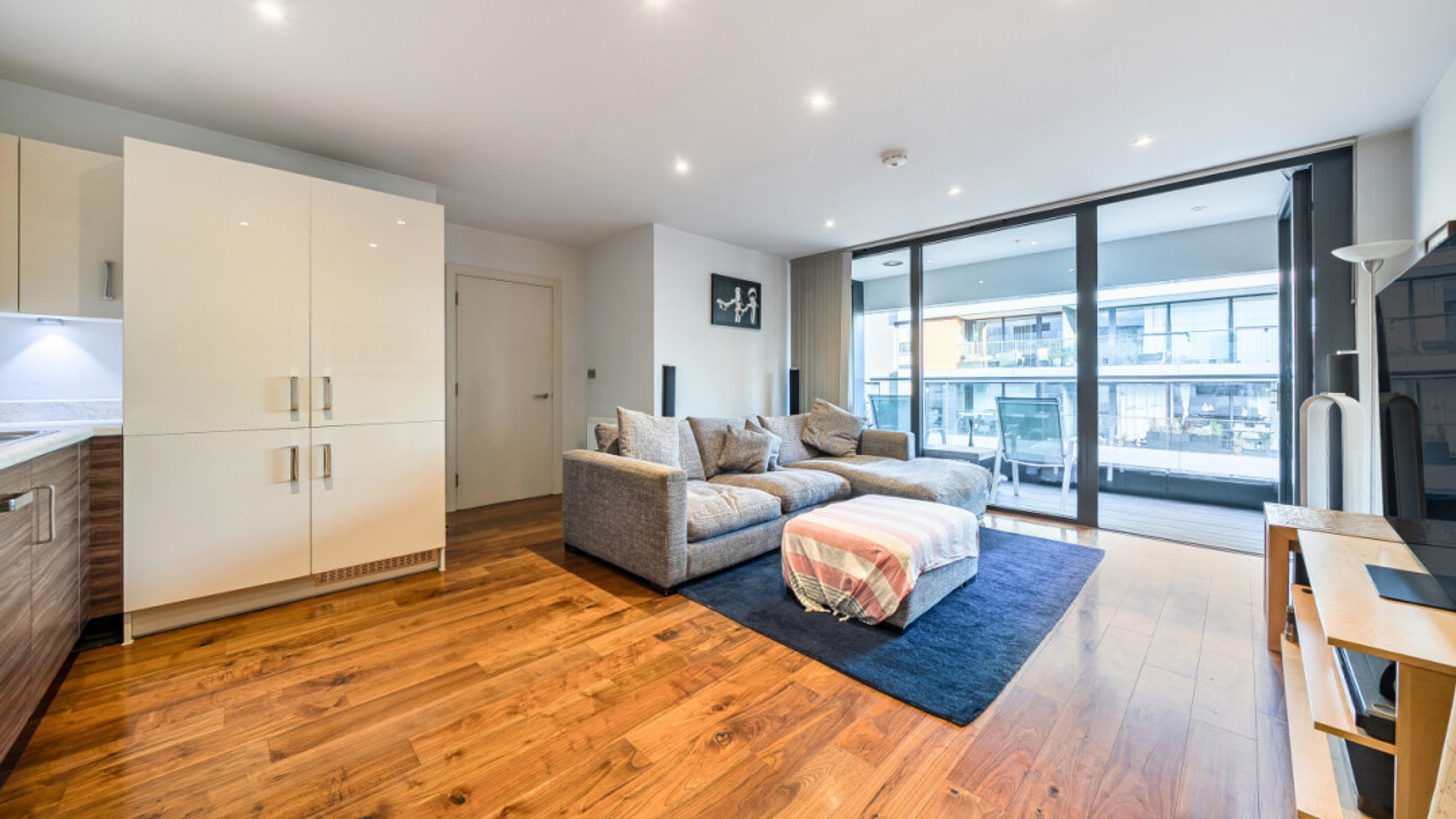 Enter this east facing apartment via a central hallway with storage. The well proportioned living area is to the right, and leads to a private balcony, with views of the the landscaped communal courtyard. The two tone modern kitchen incorporates fully integrated appliances. On the other side of the apartment, find the master bedroom, which has benefit of a mirrored wardrobe and en-suite shower room and space for a home office area. A second double bedroom, which overlooks the balcony, is served by a contemporary family bathroom.