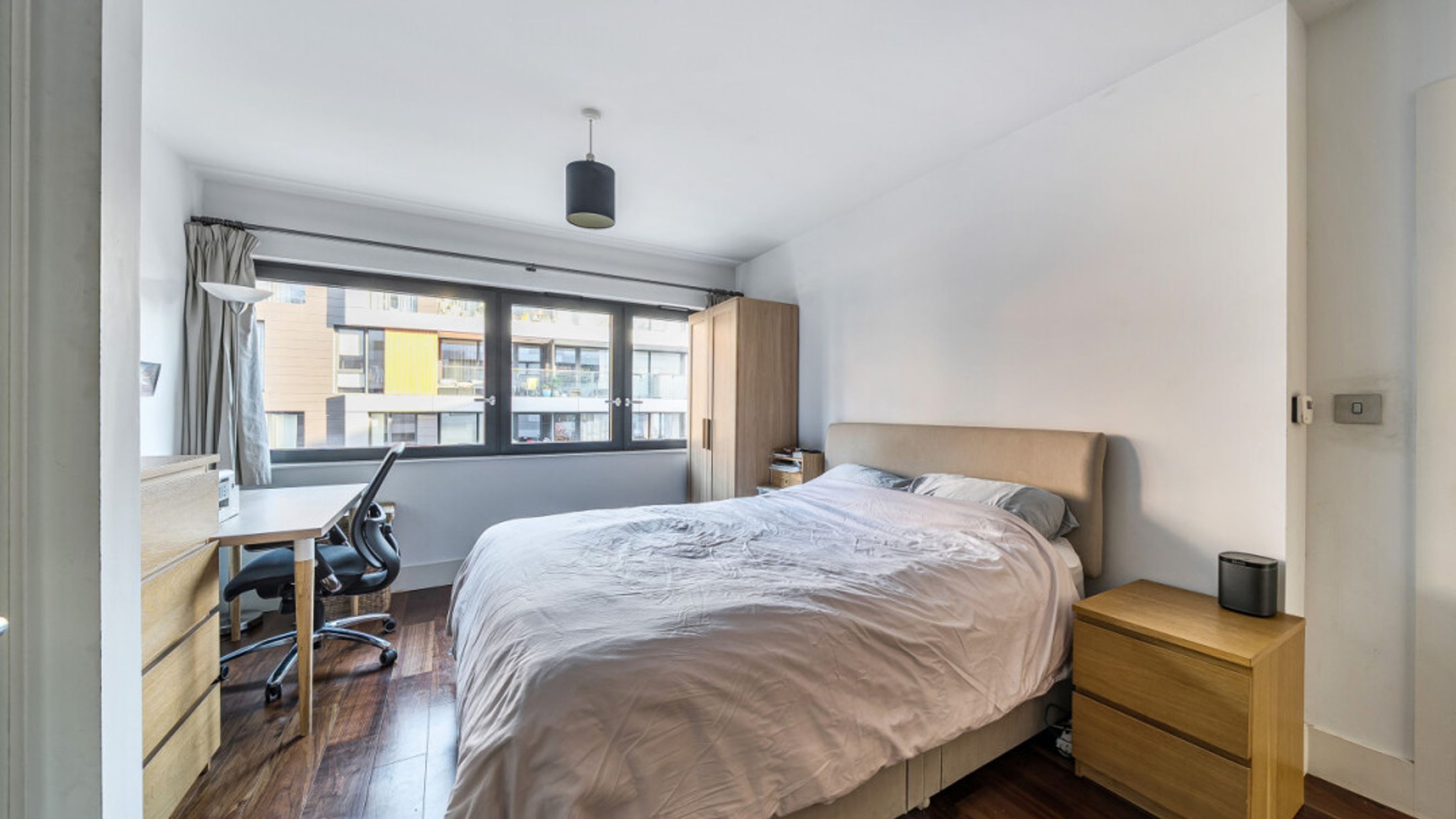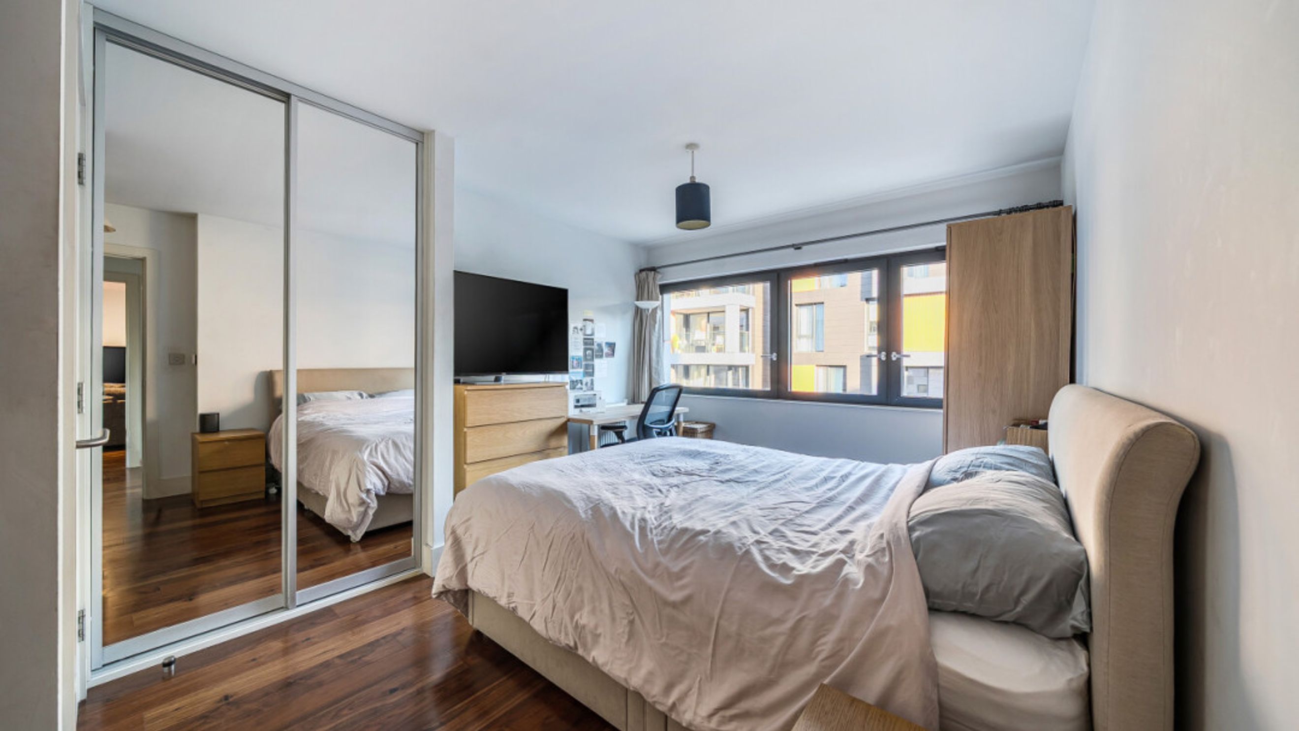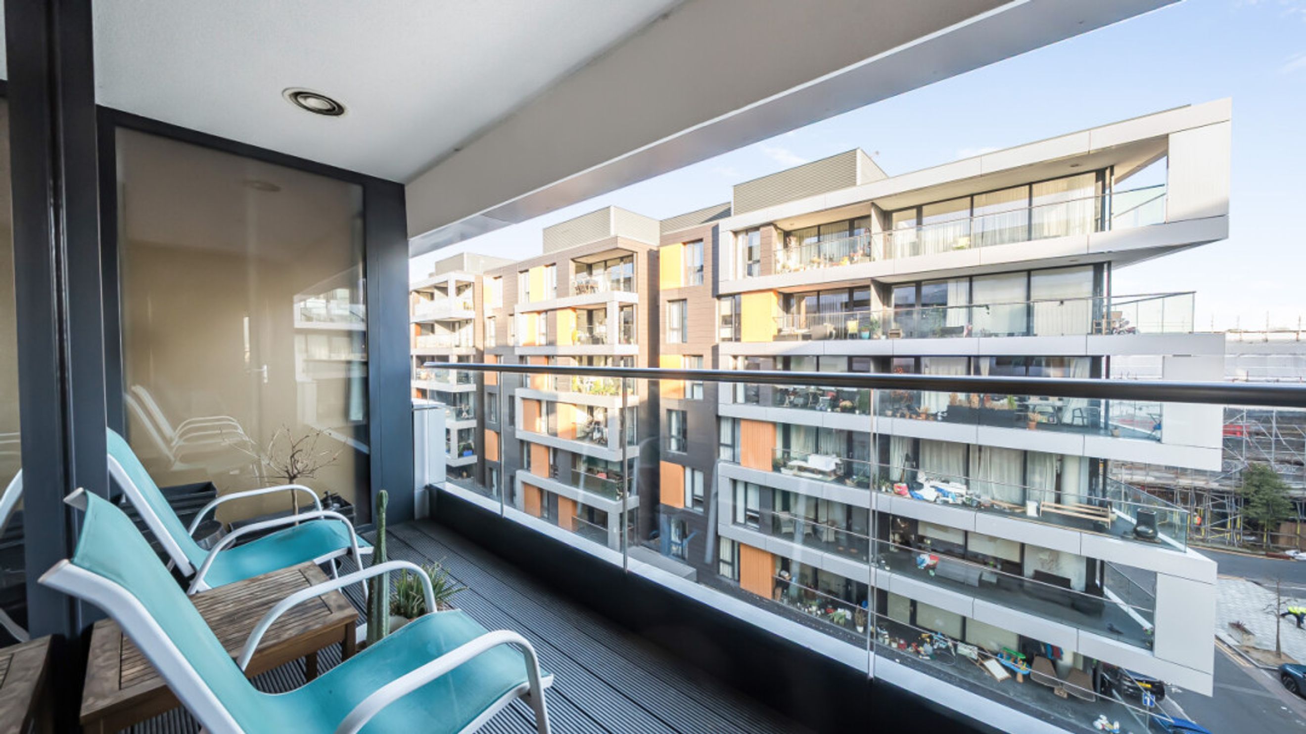 Enter this east facing apartment via a central hallway with storage. The well proportioned living area is to the right, and leads to a private balcony, with views of the the landscaped communal courtyard. The two tone modern kitchen incorporates fully integrated appliances. On the other side of the apartment, find the master bedroom, which has benefit of a mirrored wardrobe and en-suite shower room and space for a home office area. A second double bedroom, which overlooks the balcony, is served by a contemporary family bathroom.