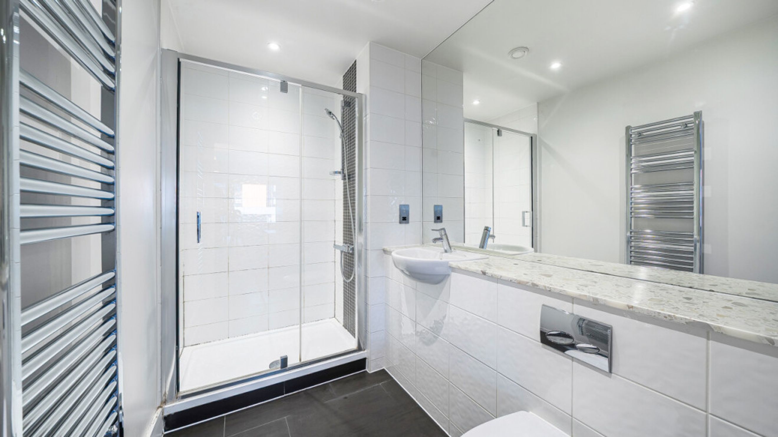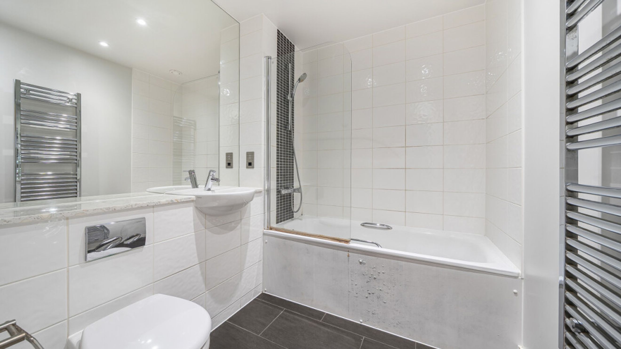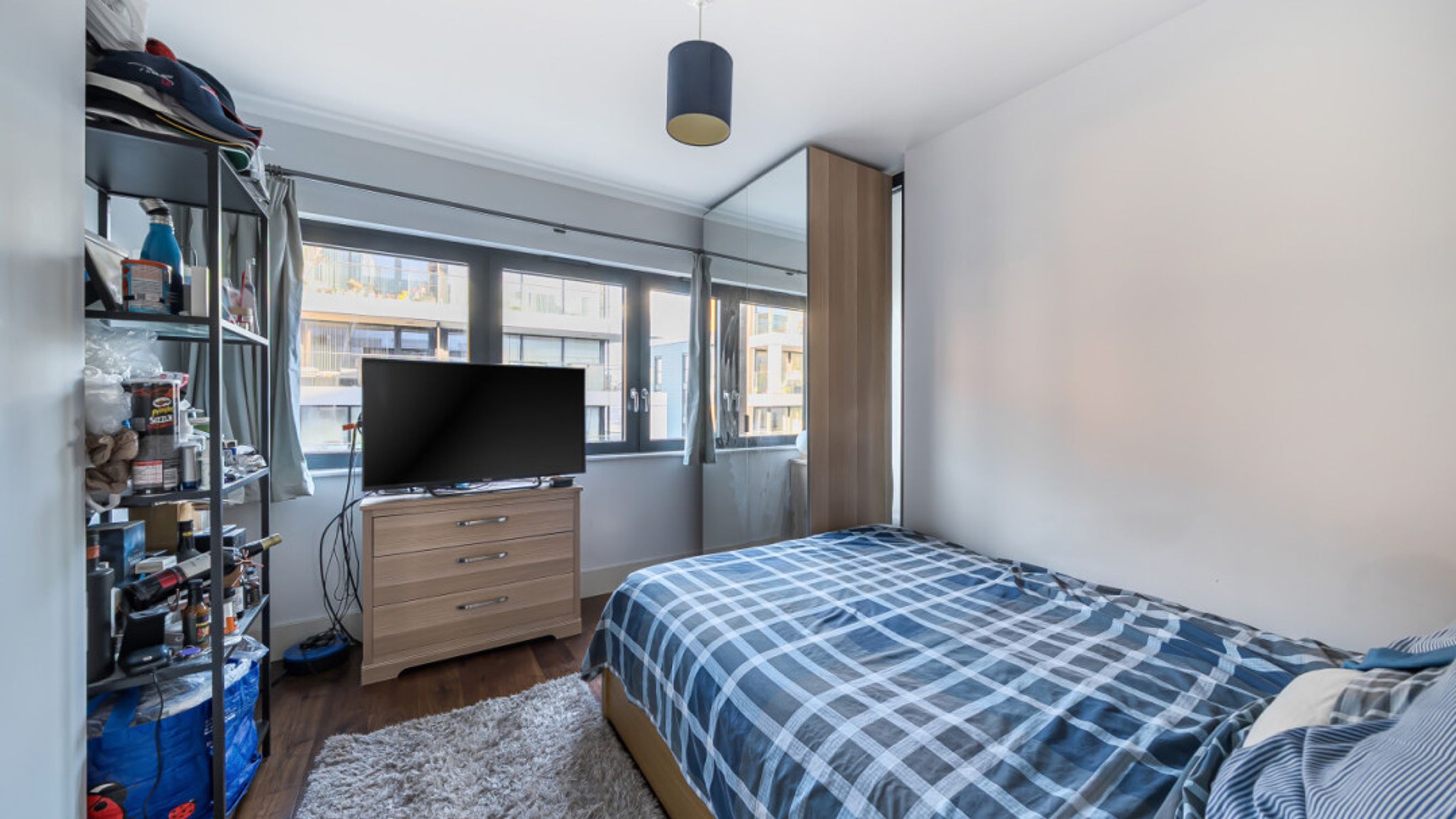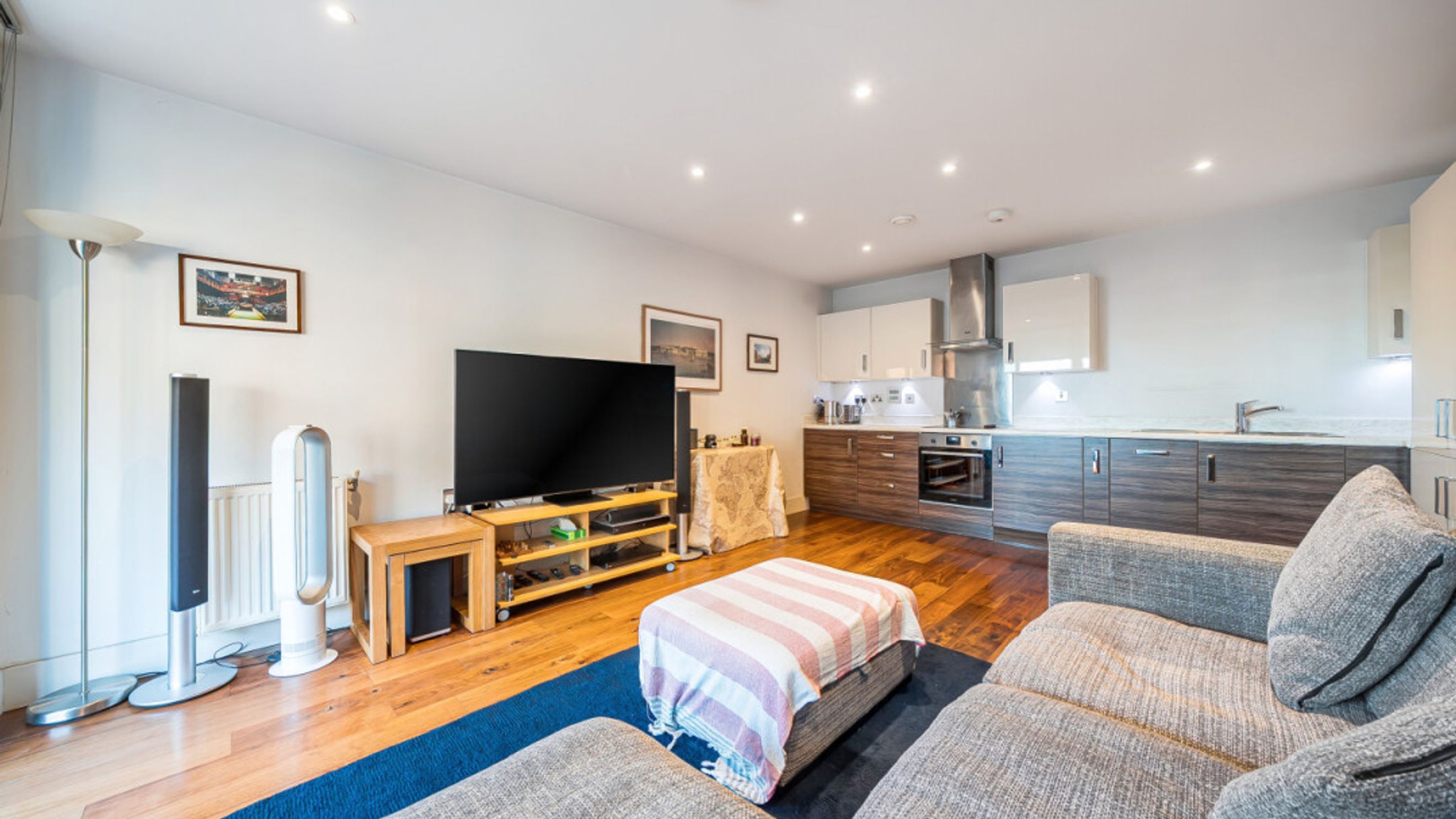 Enter this east facing apartment via a central hallway with storage. The well proportioned living area is to the right, and leads to a private balcony, with views of the the landscaped communal courtyard. The two tone modern kitchen incorporates fully integrated appliances. On the other side of the apartment, find the master bedroom, which has benefit of a mirrored wardrobe and en-suite shower room and space for a home office area. A second double bedroom, which overlooks the balcony, is served by a contemporary family bathroom.