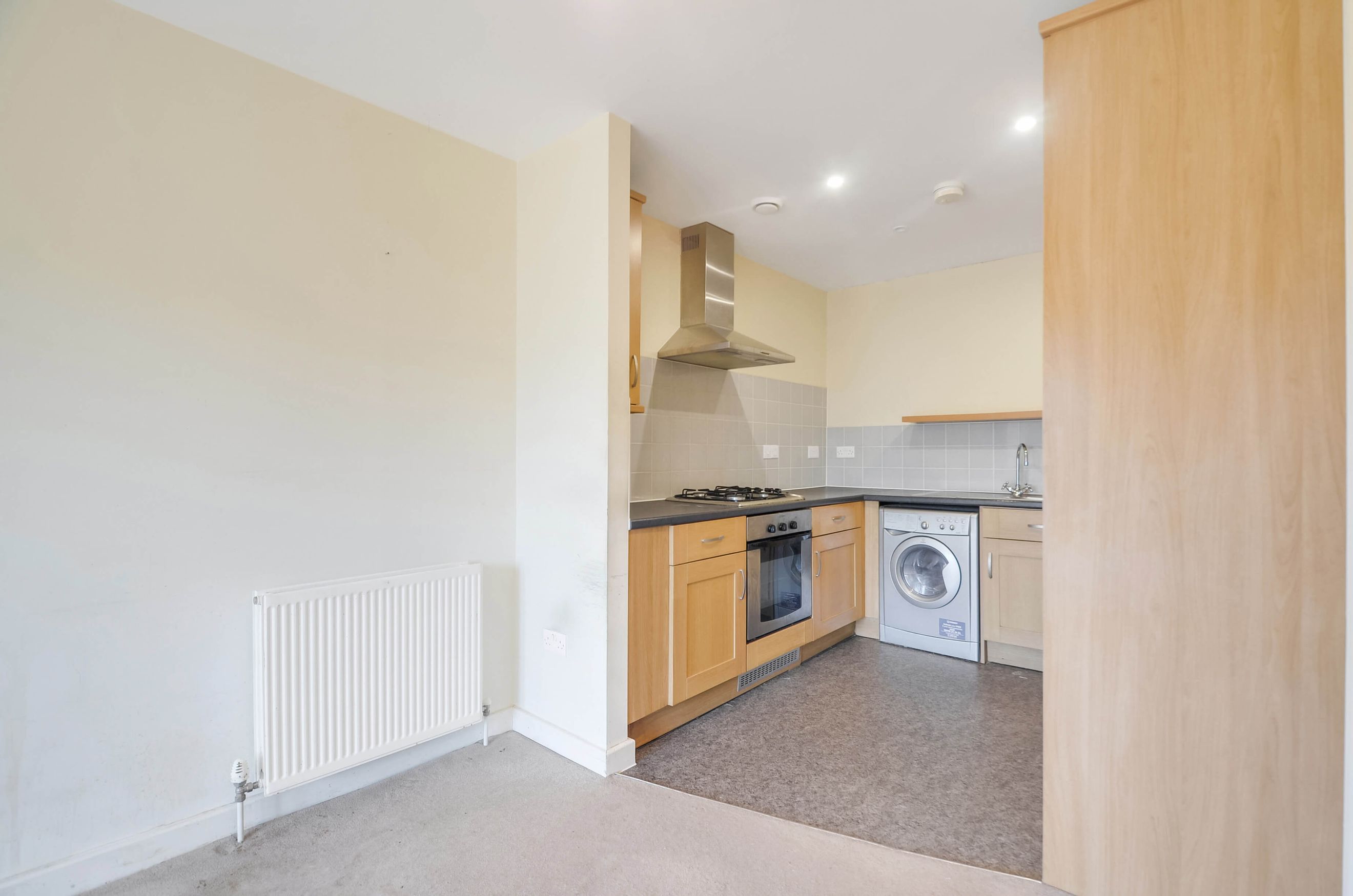 This bright, contemporary apartment features open-plan living with floor-to-ceiling windows and a private balcony. The kitchen is fitted with integrated appliances, and central heating ensures year-round comfort. Residents also benefit from secure underground bike storage and access to a communal garden.