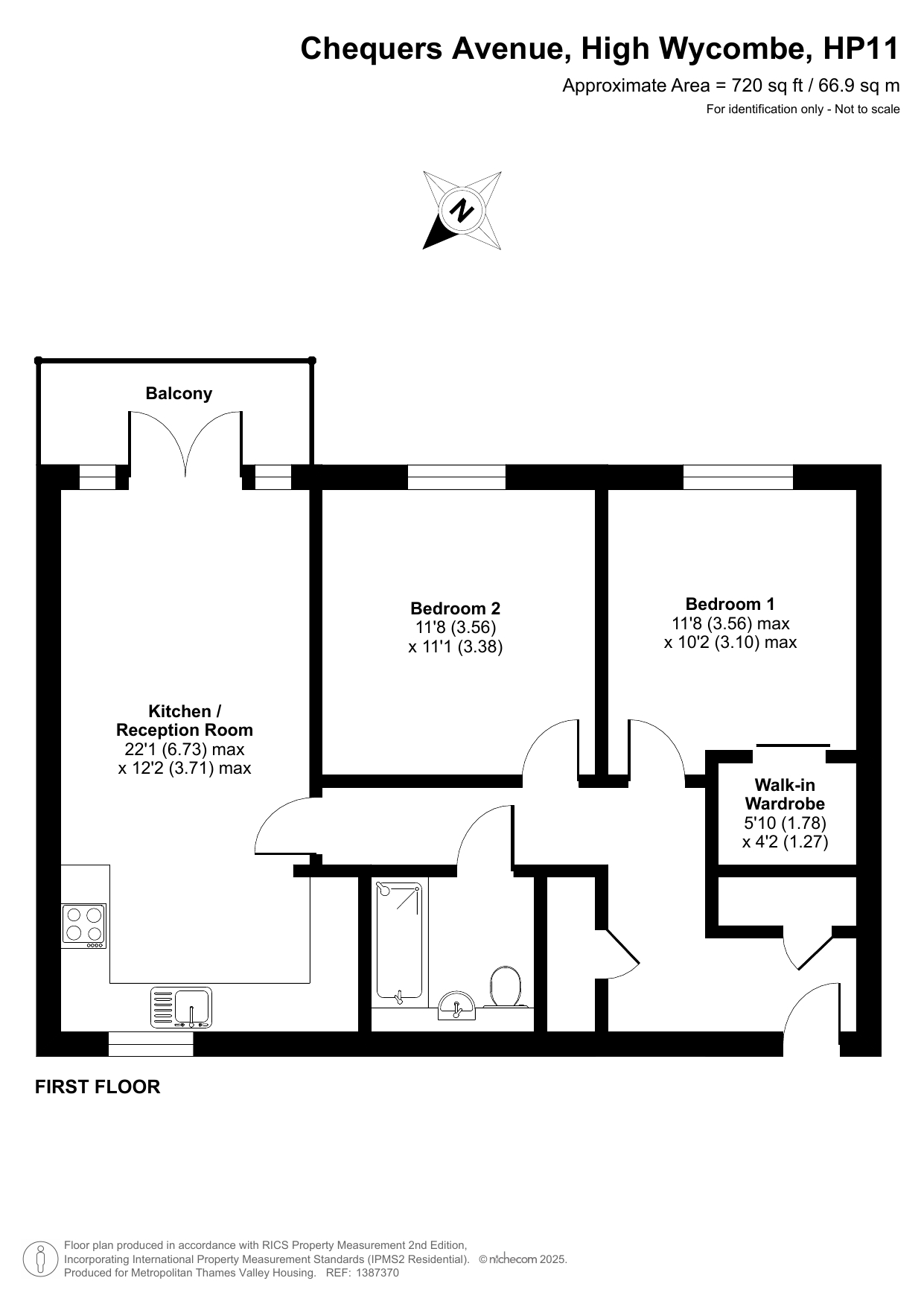 The property on the first floor comprises an entrance hall with storage cupboards, a living room with a modern open plan kitchen, two good-sized bedrooms (one with a walk-in wardrobe) and a bathroom.