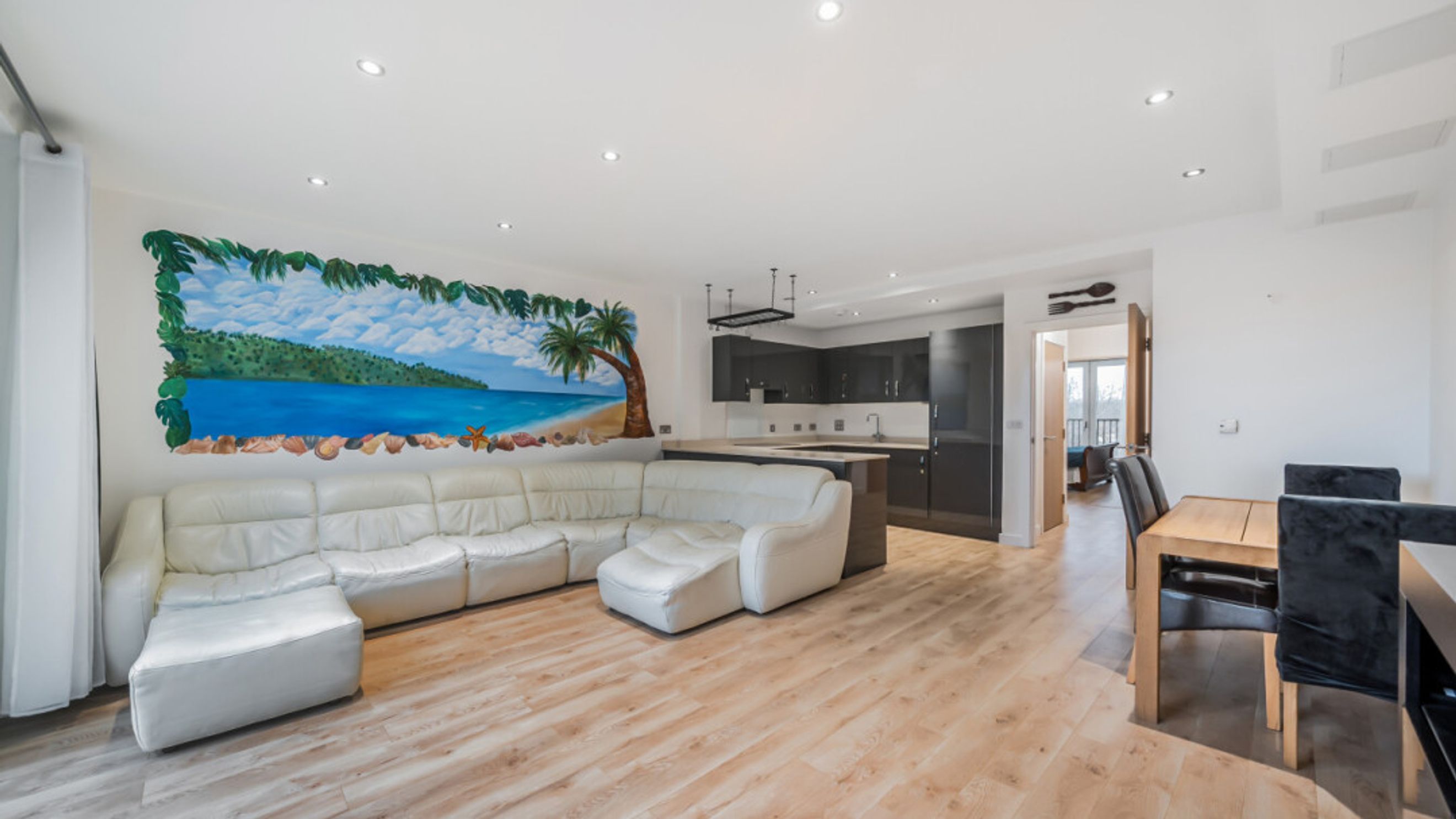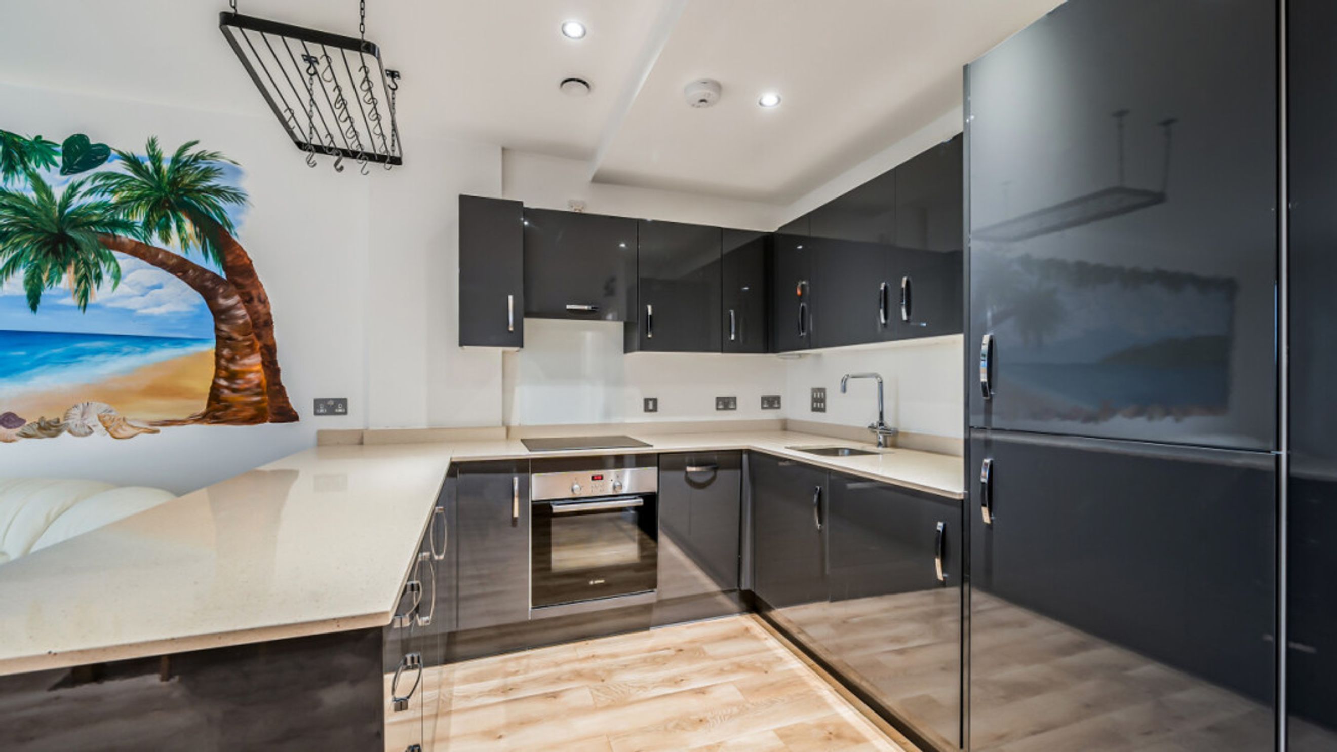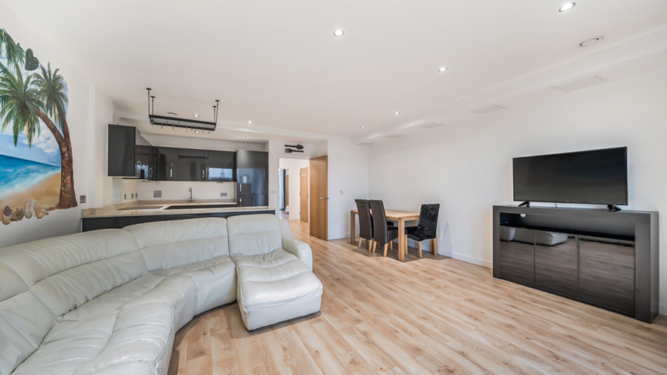 All rooms lead from a central hallway, incorporating storage, in this dual aspect apartment. The large open plan living area is south facing and opens onto a private balcony large enough to relax and dine. The modern kitchen features high gloss units and integrated appliances. There are two generous bedrooms, each with a juliette balcony. The larger of the bedrooms includes built-in storage. A contemporary bathroom completes the accommodation.