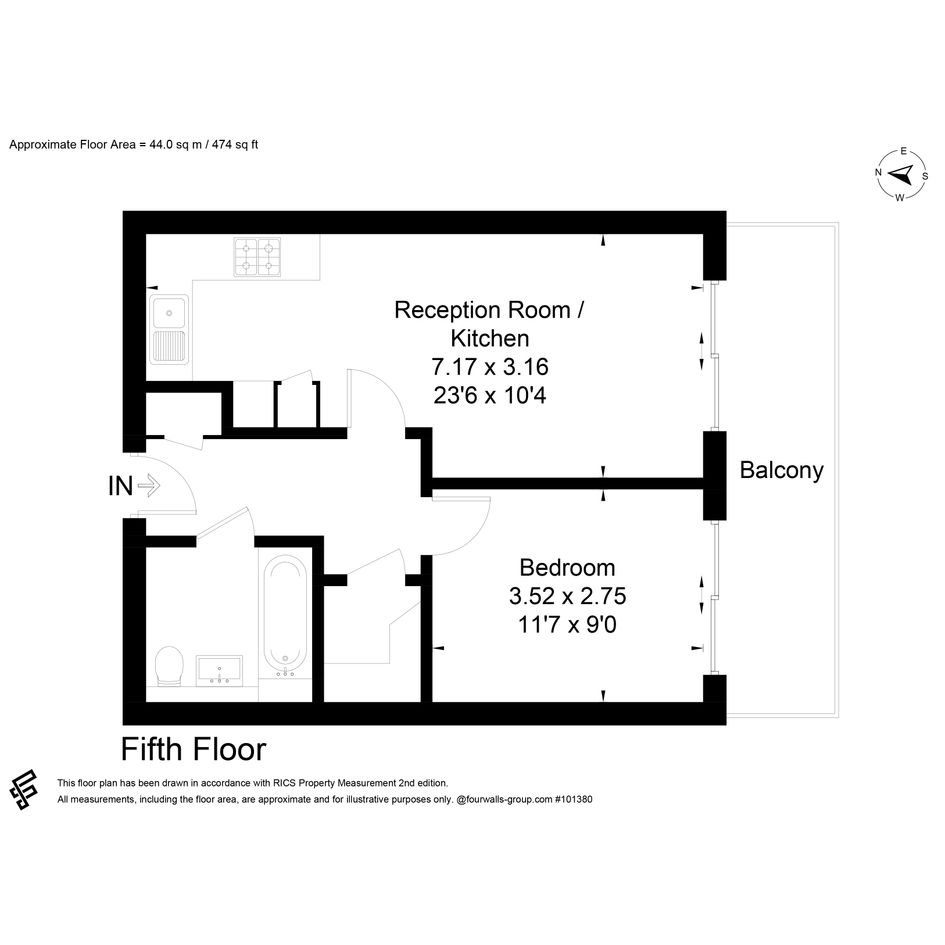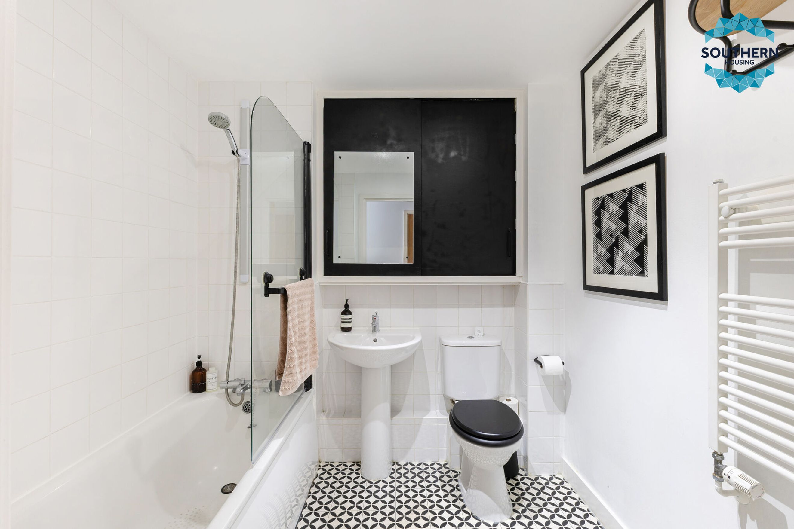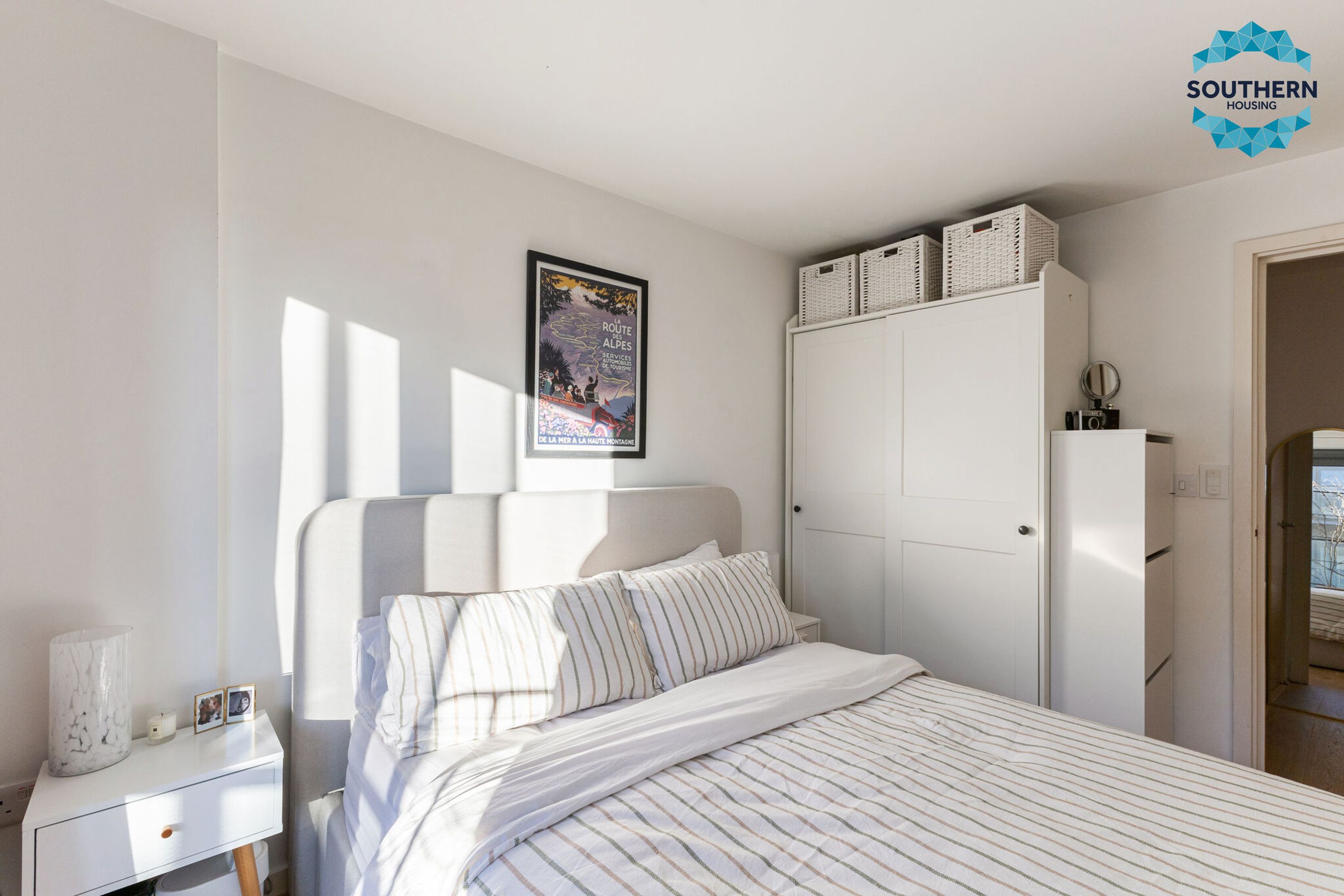 The principal bedroom is a large double, filled with natural light and benefiting from a second balcony access. There's ample space for a king-size bed and additional furnishings. Completing the property is a stylish bathroom with a shower-over-bath combination.