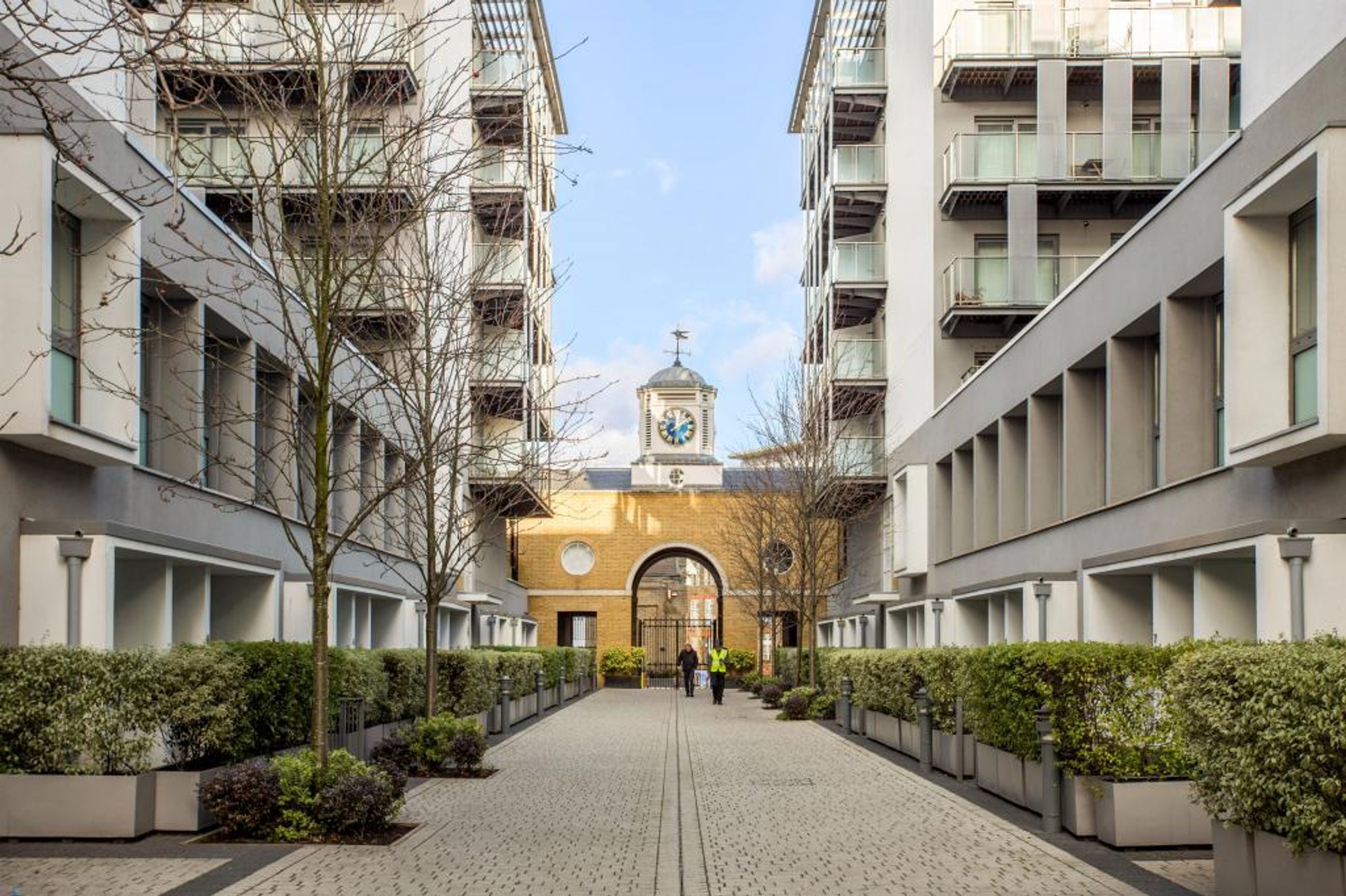 Positioned on the fifth floor, this stunning home boasts picturesque views of the historic Mews clock tower, the Royal Arsenal grounds, and the distant skyline.