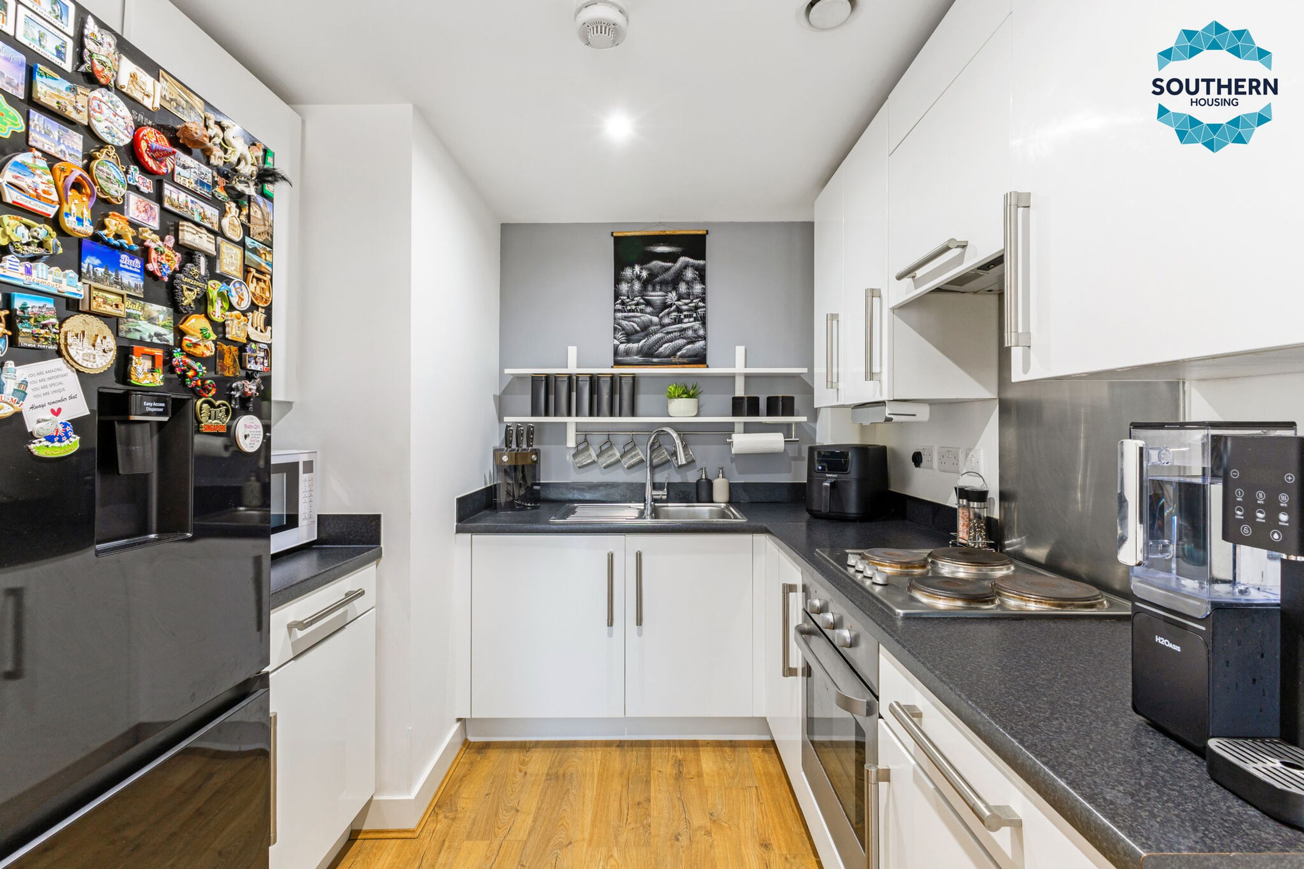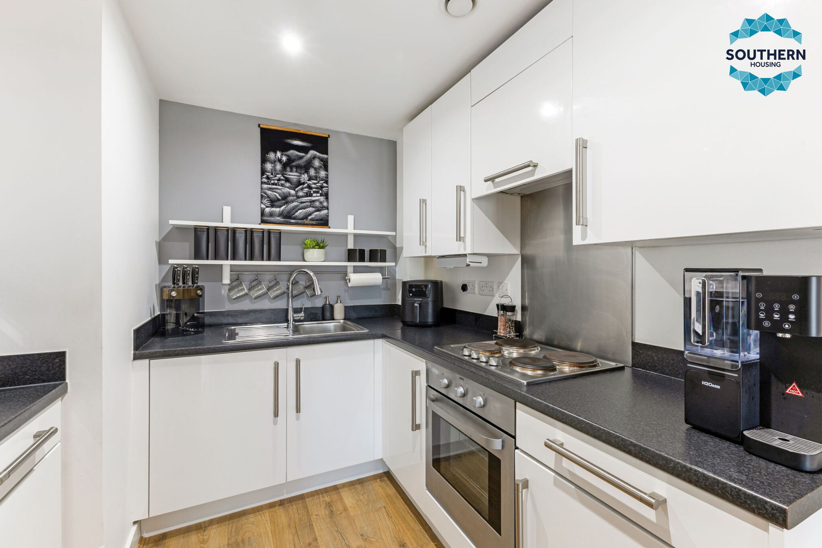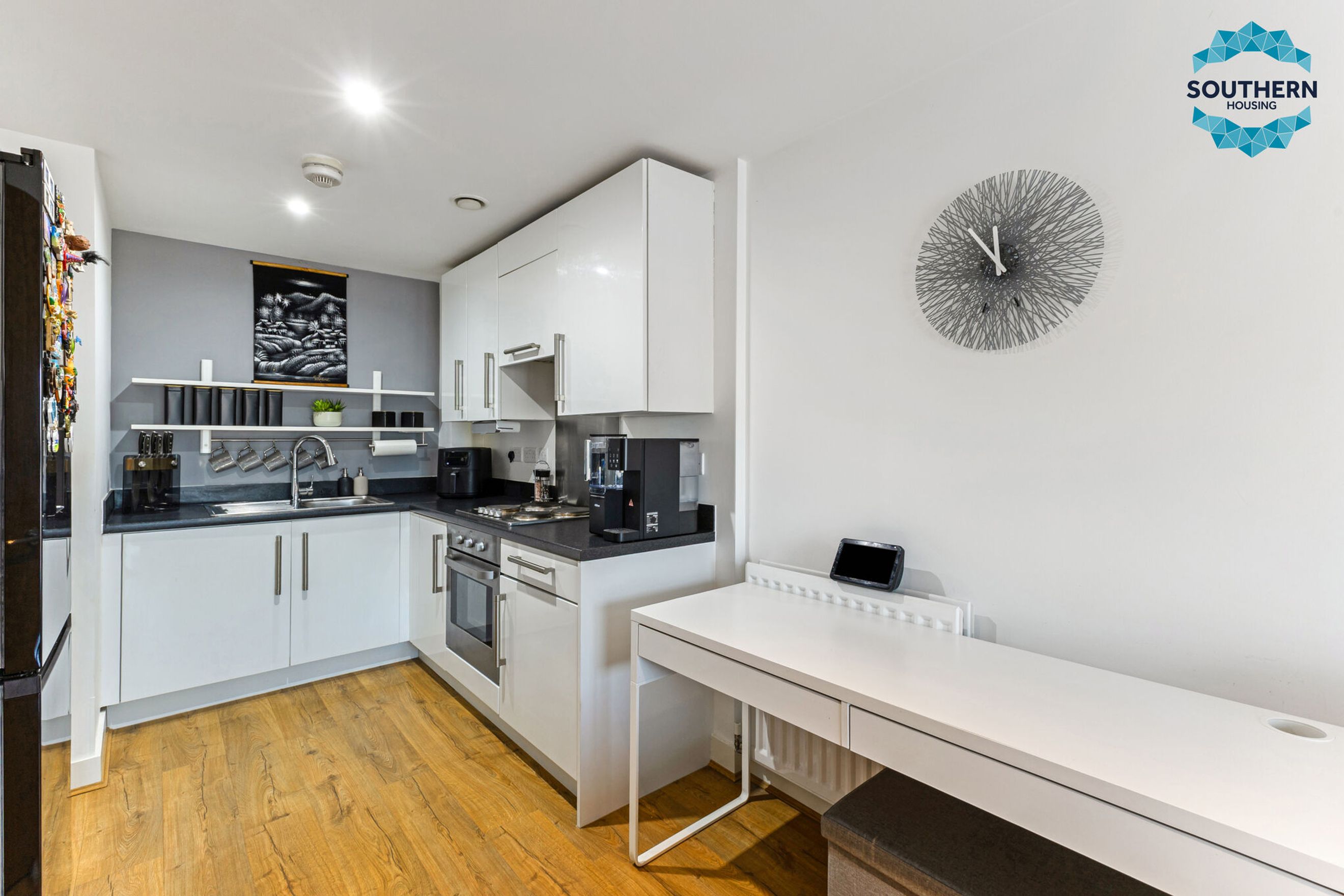 The modern kitchen features integrated appliances, including an oven, hob, and extractor fan, alongside plenty of storage and worktop space for all your culinary needs.